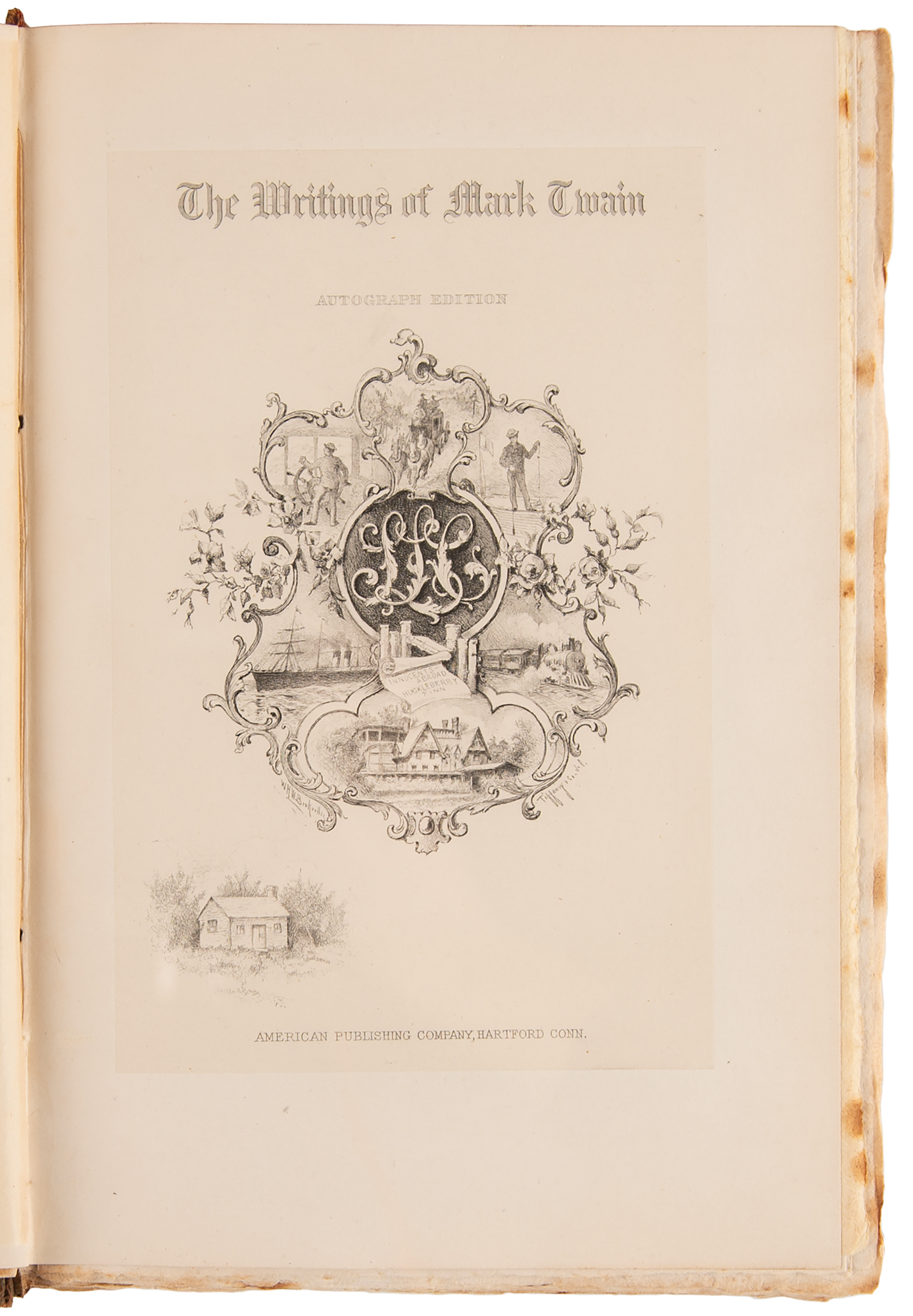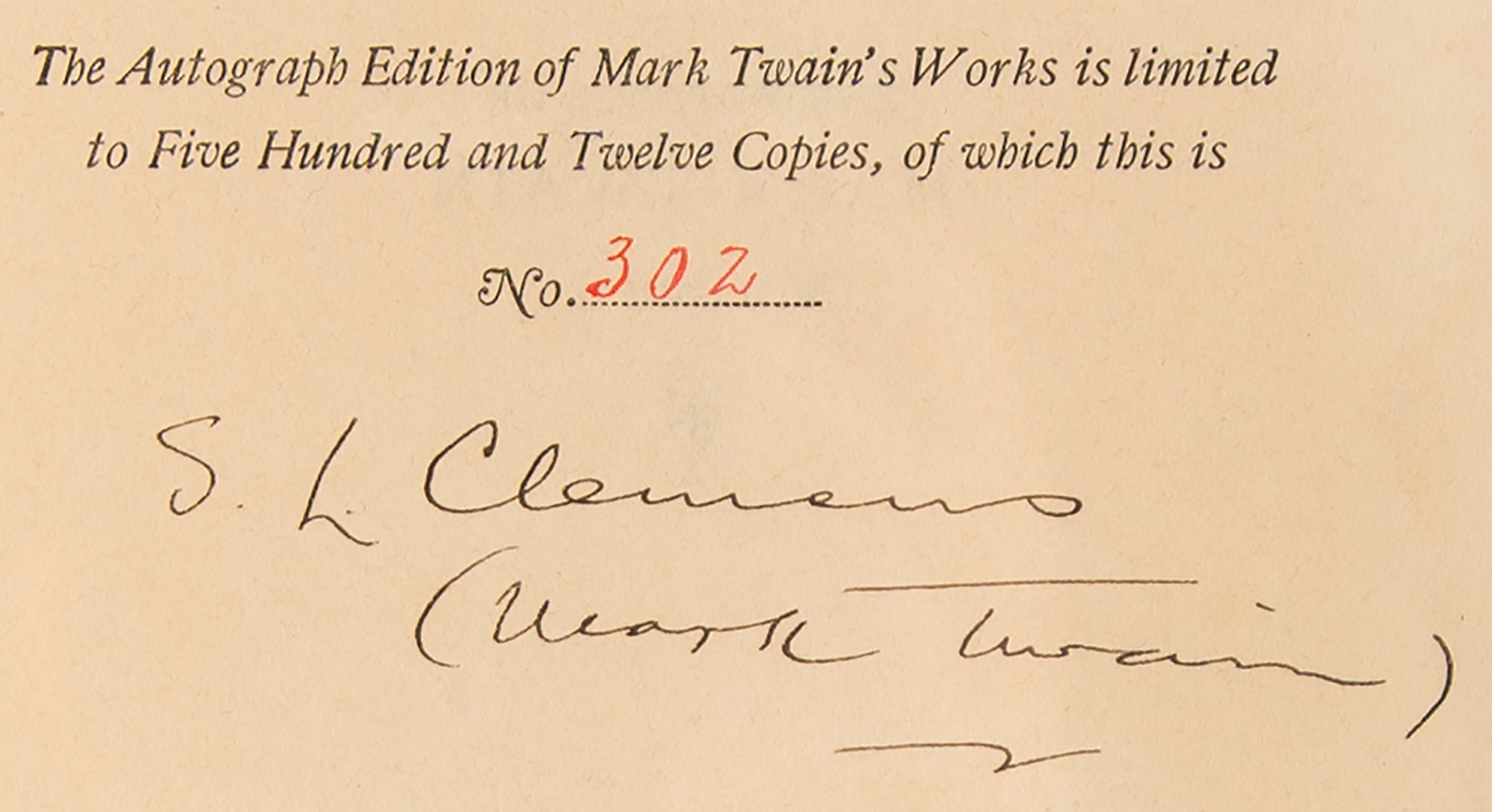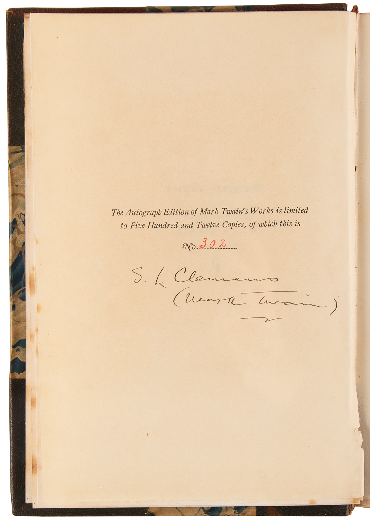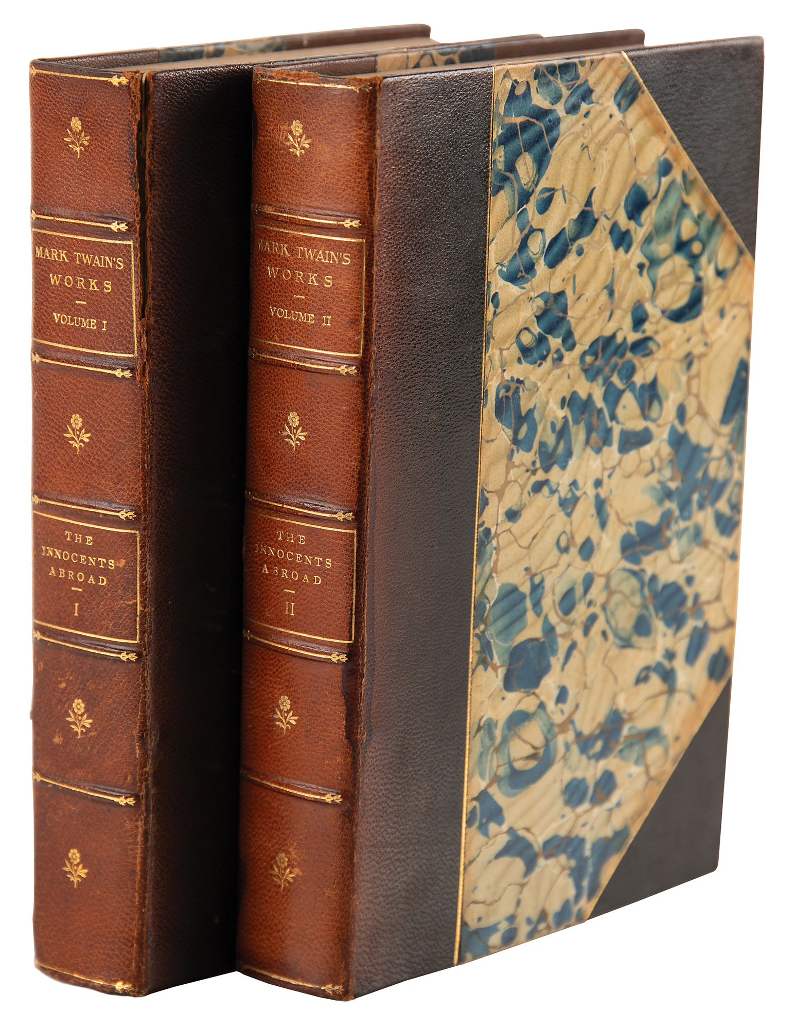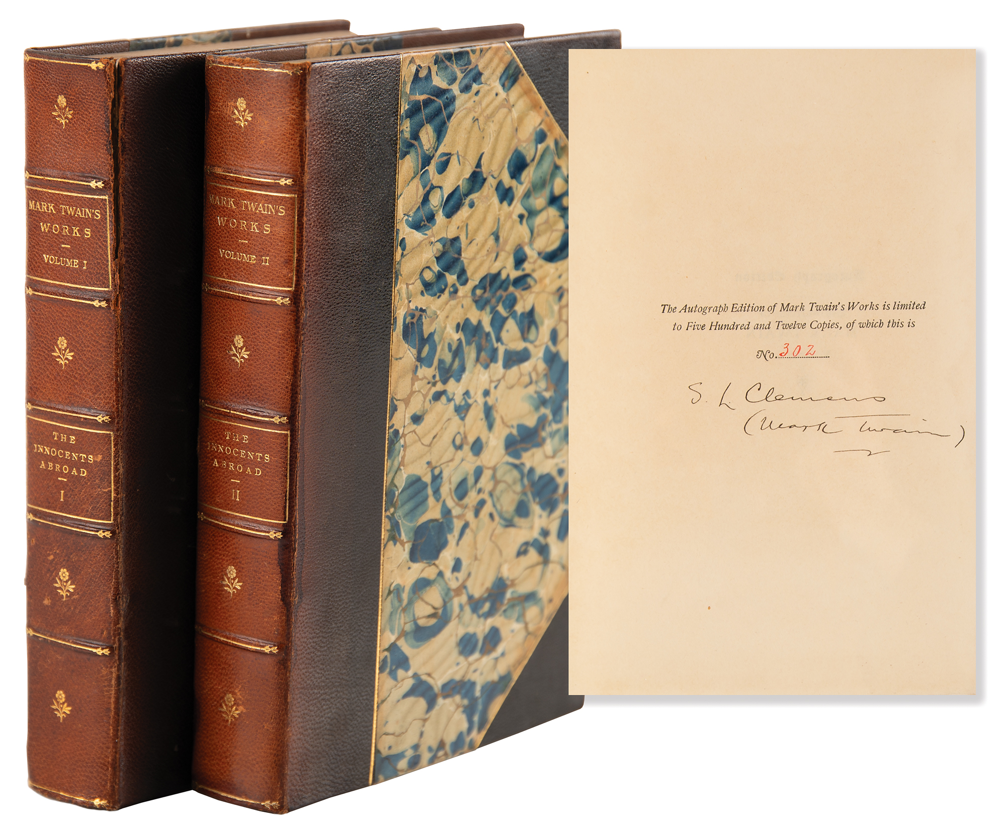 Signed book: Mark Twain's Works, Vols. I and II: The Innocents Abroad. Autograph edition, limited issue, numbered 302/512. Hartford, CT: The American Publishing Company, 1899. Hardcover bound in three-quarter morocco with marbled boards, 6 x 8.5, 377 and 446 pages. Signed on the colophon in ink, "S. L. Clemens, (Mark Twain)." Autographic condition: very fine. Book condition: VG/None, with repairs to partial edge splits along edges of the leather spine, and minor foxing to textblocks. A desirable set boasting a choice 'double autograph' of the great American author.