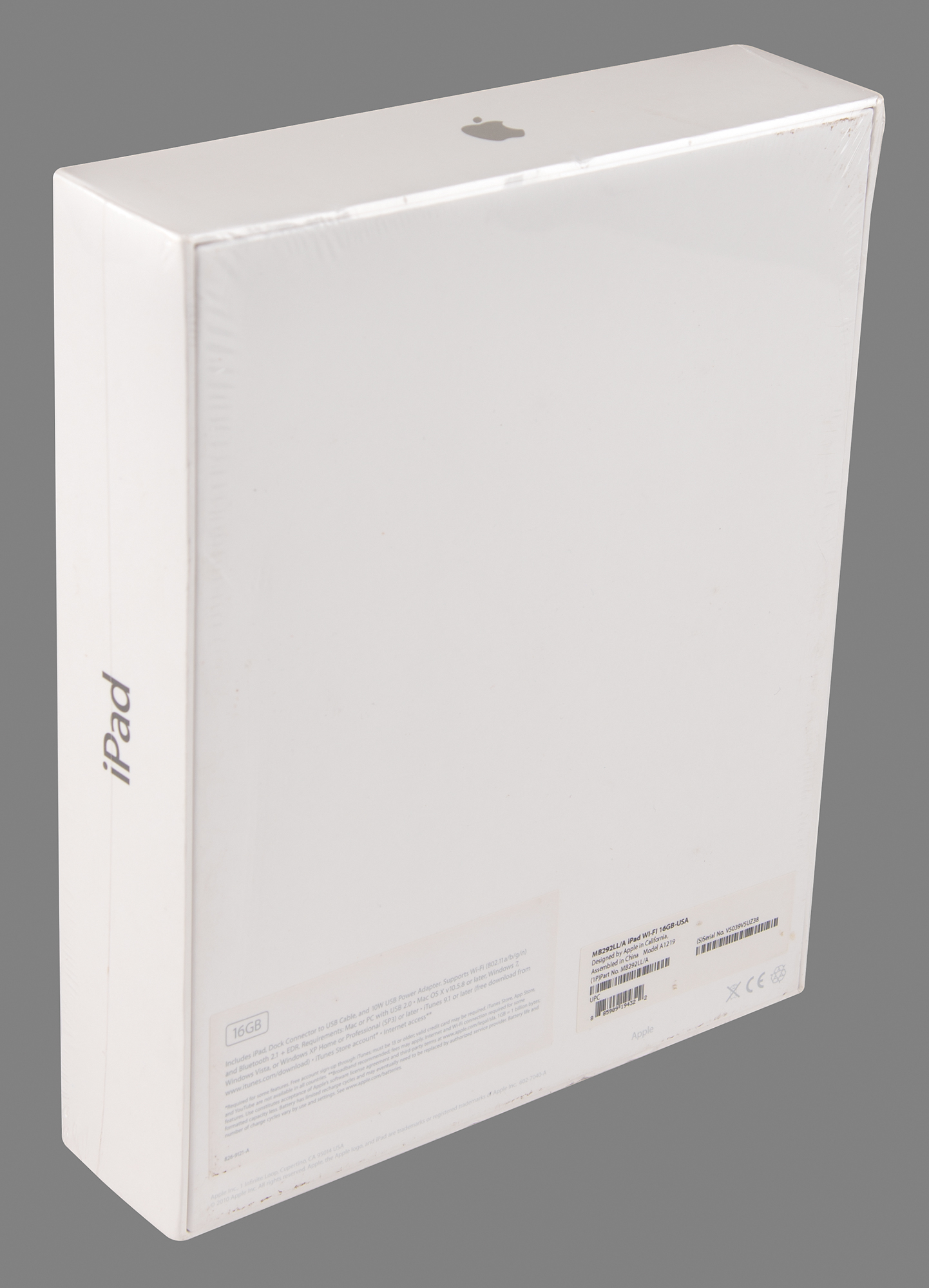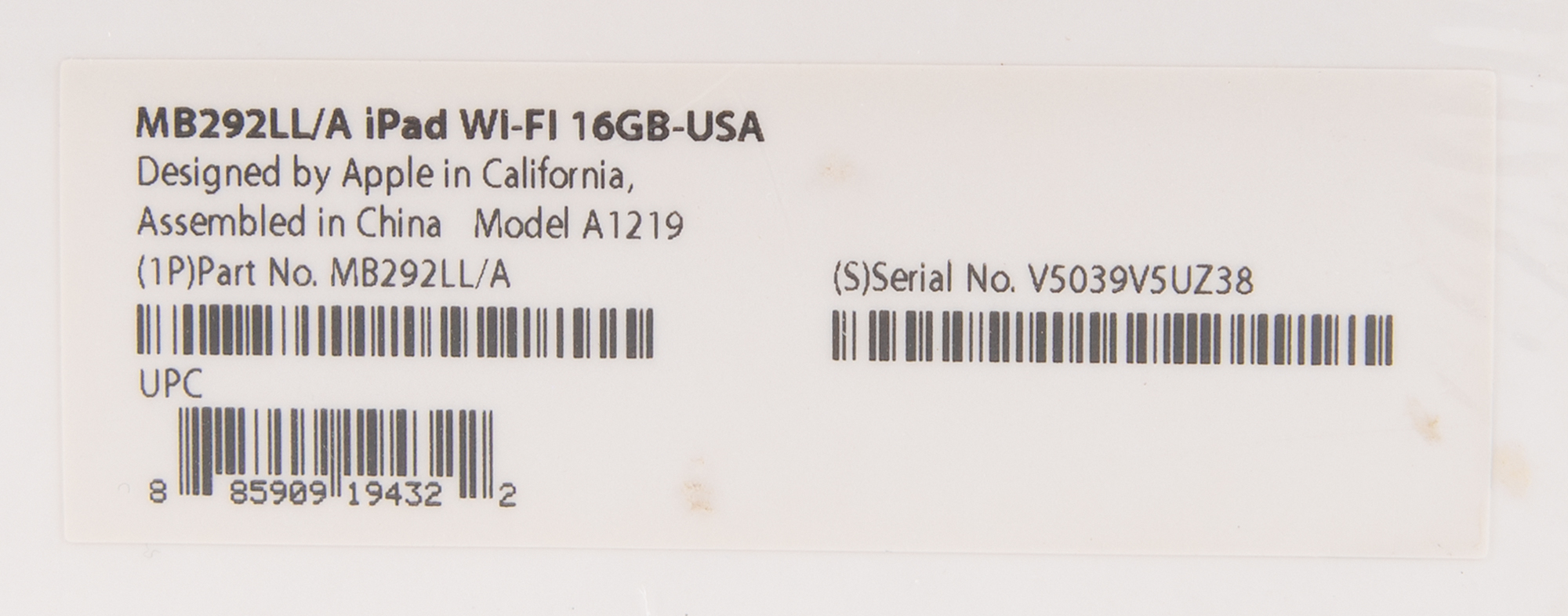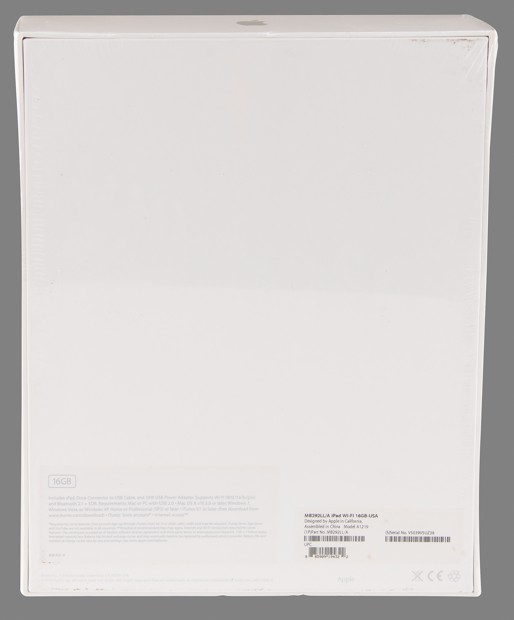 Unopened first generation original Apple iPad, Model A1219, Part No. MB292LL/A, Serial No. V5039V5UZ38. The box features a life-size image of the iPad with ten icons on the screen; labels on the reverse identify the model as "MB292LL/A iPad Wi-Fi 16GB-USA," and describe the contents of the box: "Includes iPad, Dock Connector to USB Cable, and 10W USB Power Adapter." In brand new, factory-sealed mint condition.