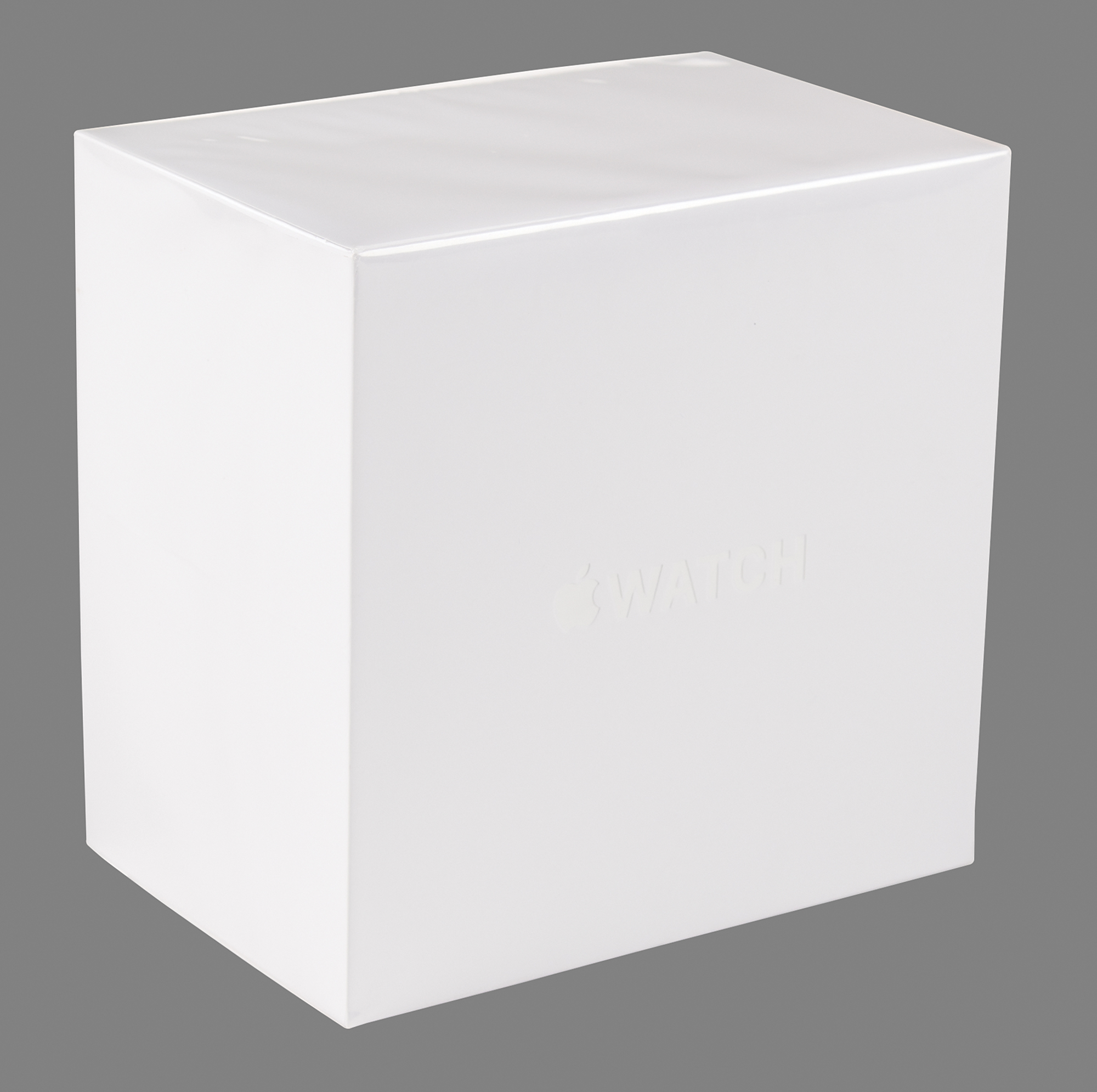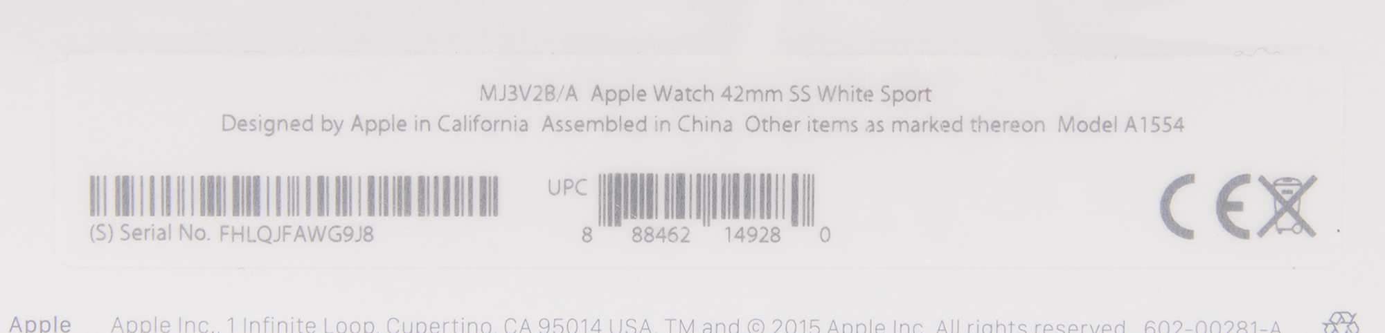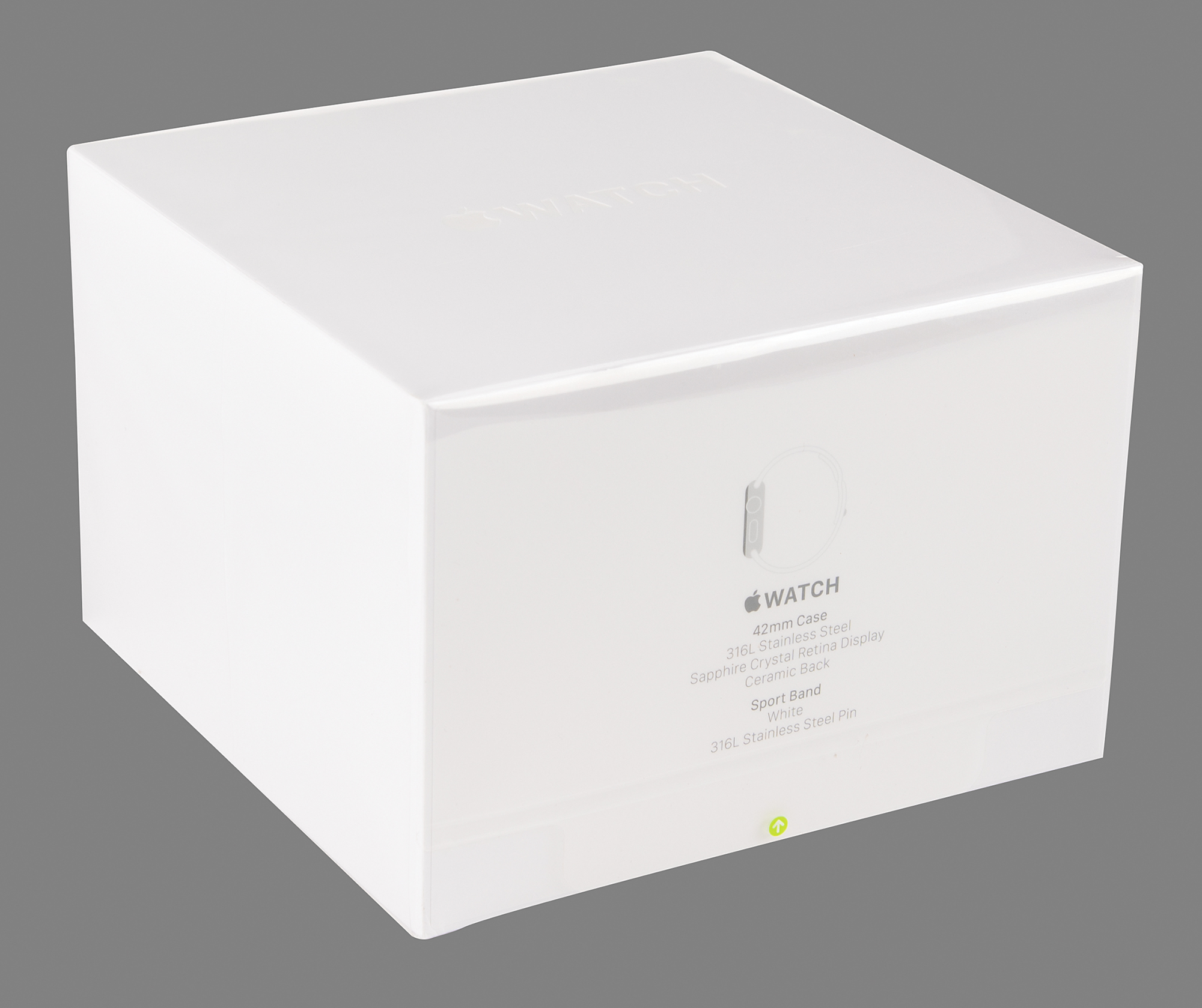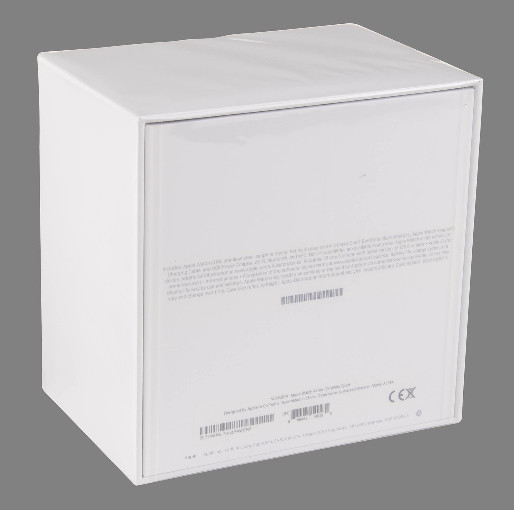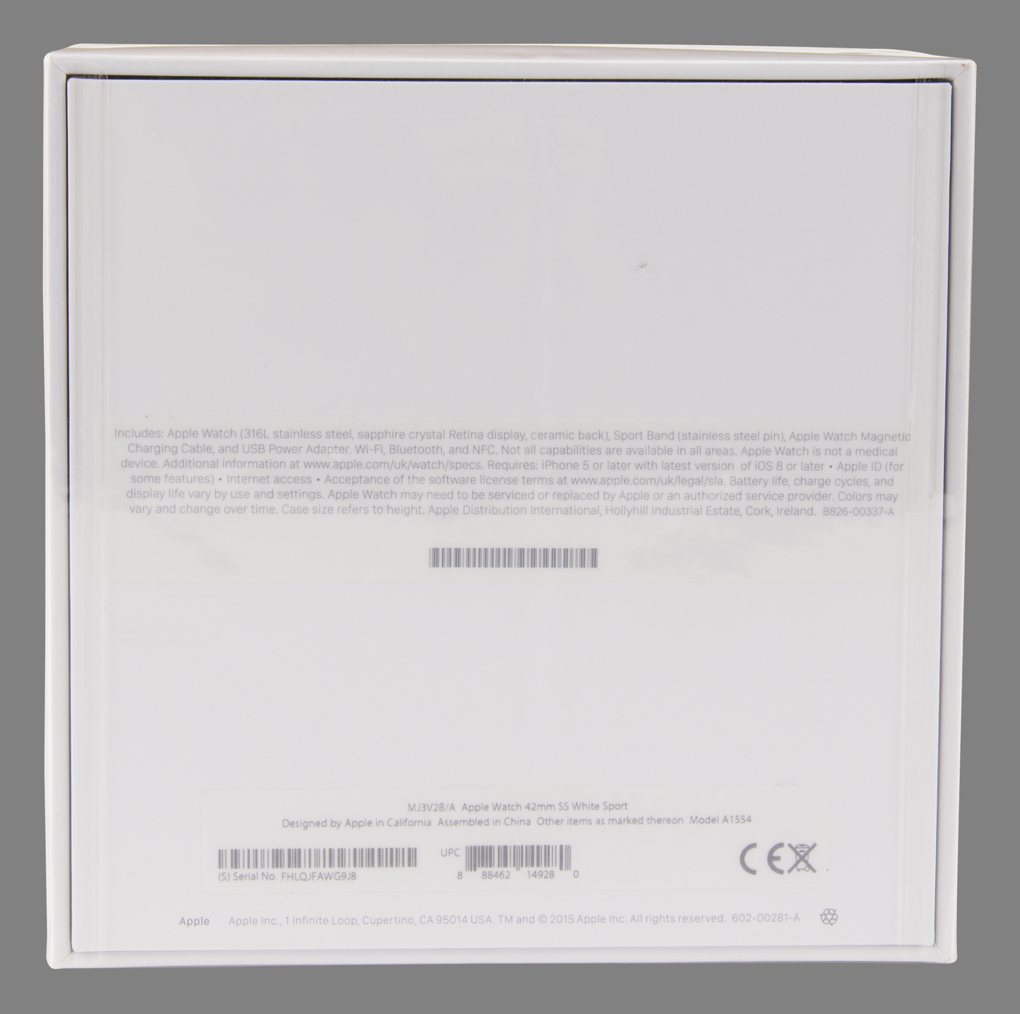 Unopened first generation Apple Watch, Part No. MJ3V2B/A, Serial No. FHLQJFAWG9J8, which debuted in 2015. This first generation Apple Watch features a 42 mm case made of 316L stainless steel, a sapphire crystal retina display, and a ceramic back, which houses a 520 MHz processor, 512 MB of onboard RAM, and 8 GB of storage capacity. Includes a white sport band with stainless steel pin.