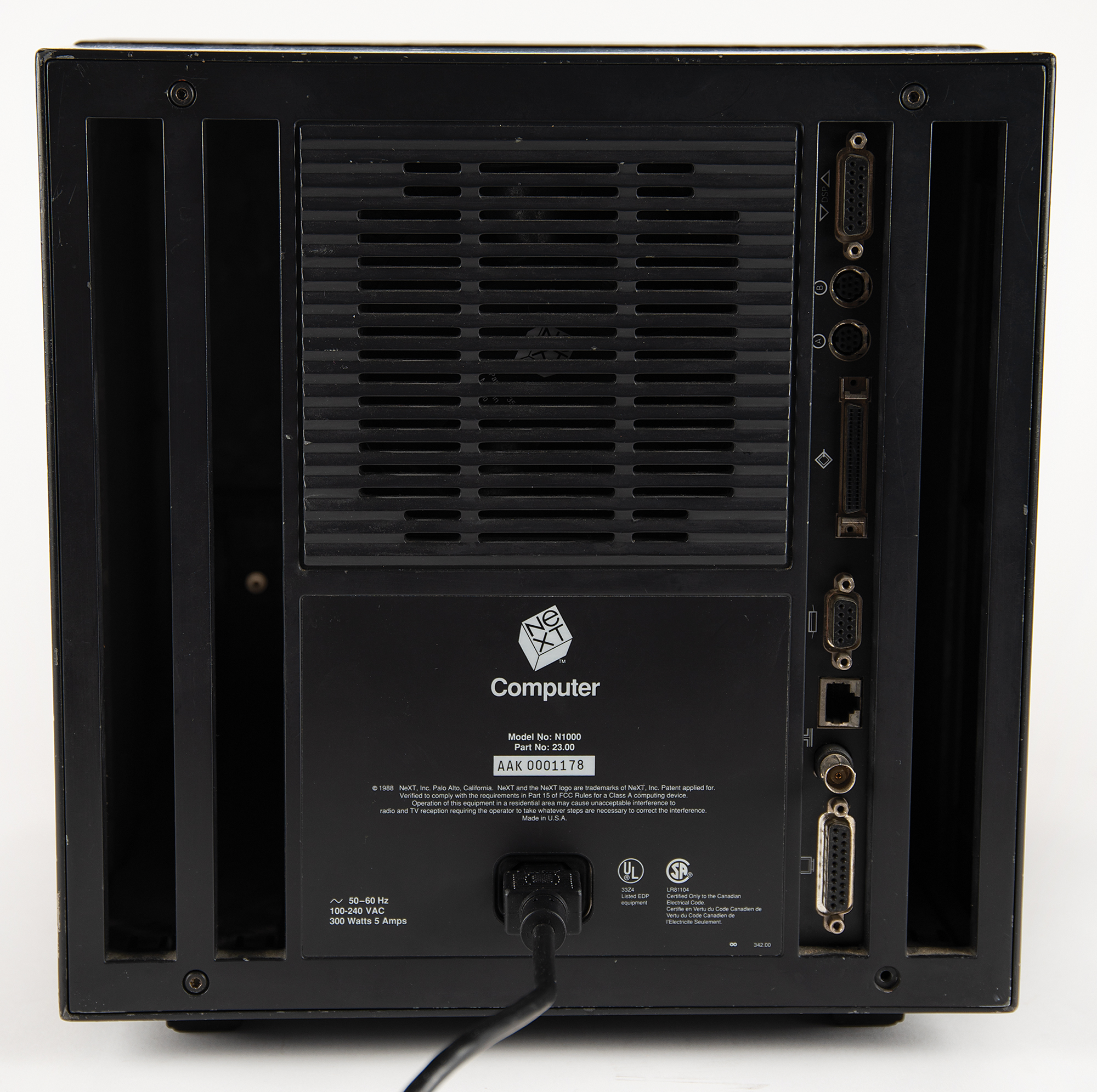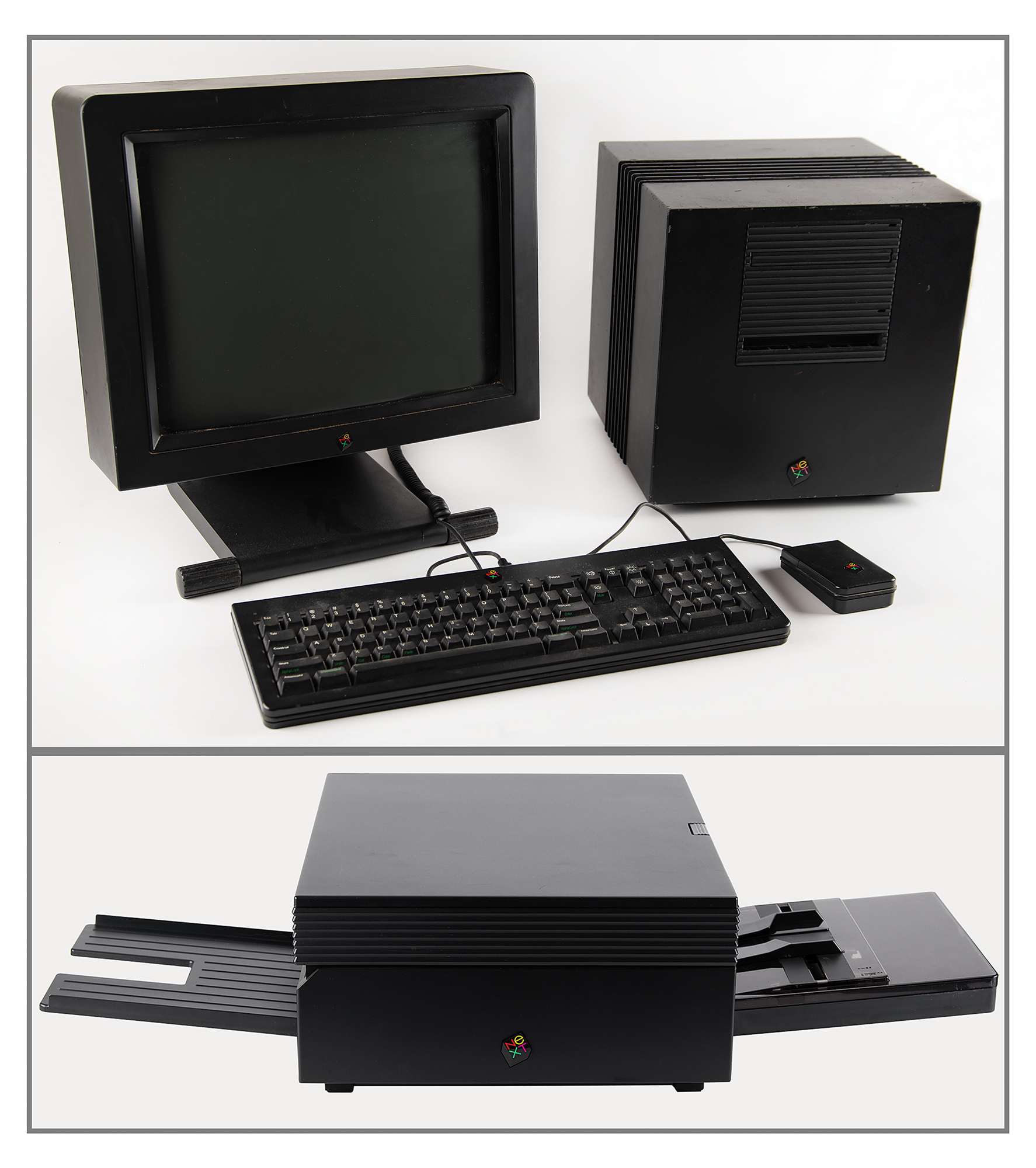 NeXTcube workstation computer set, including the NeXTcube computer (Model N1000, Serial No. AAK0001178), NeXT MegaPixel 17˝ CRT Display (Model N4000, Serial No. AAA6002501), NeXT Laser Printer (N2000), NeXT Keyboard, and NeXT Mouse. The computer and monitor have been tested to boot up; the computer and its accessories are in fine cosmetic condition.