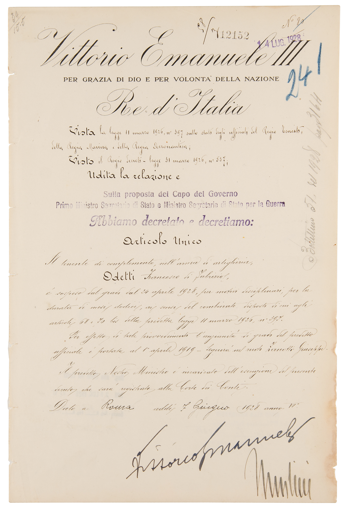 Partly-printed DS in Italian, signed “Mussolini" and "Vittorio Emanuele,” one page, 9.5 x 14.5, March 31, 1926. Untranslated official document, boldly signed at the conclusion in ink by Benito Mussolini and Vittorio Emanuele III. In fine condition, with light staining to the lower right edge, and tiny binder slits along the left edge.
