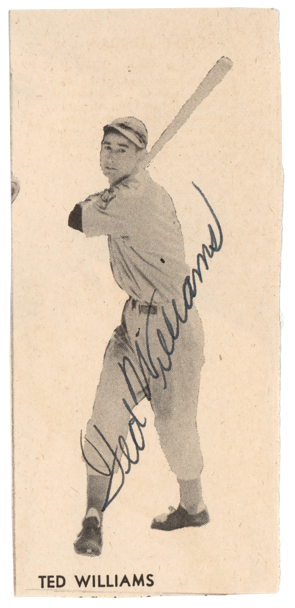 Vintage rookie-era 1.75 x 4 clipped paperstock photo of Ted Williams taking a swing, neatly signed in fountain pen by the legendary Boston Red Sox hitter. In fine condition.