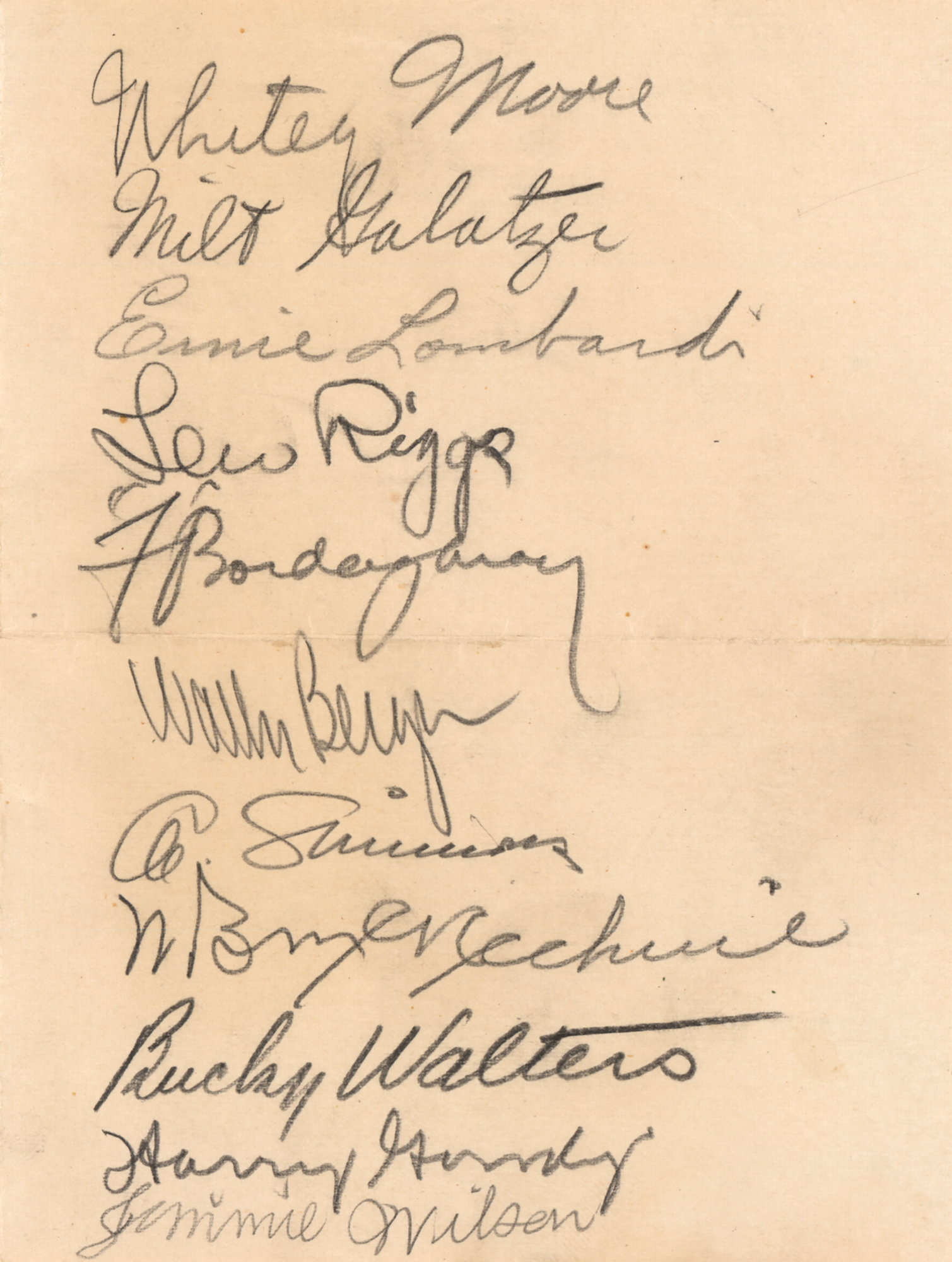Vintage pencil signatures of Bill McKechnie, Al Simmons, and Ernie Lombardi, and several other members of the 1939 Cincinnati Reds on an off-white 4.25 x 5.5 sheet. Among the other signers are Whitey Moore, Milt Galatzer, Lew Riggs, Frenchy Bordagaray, Wally Berger, Bucky Walters, and Jimmie Wilson. In fine condition, with a central horizontal fold.
