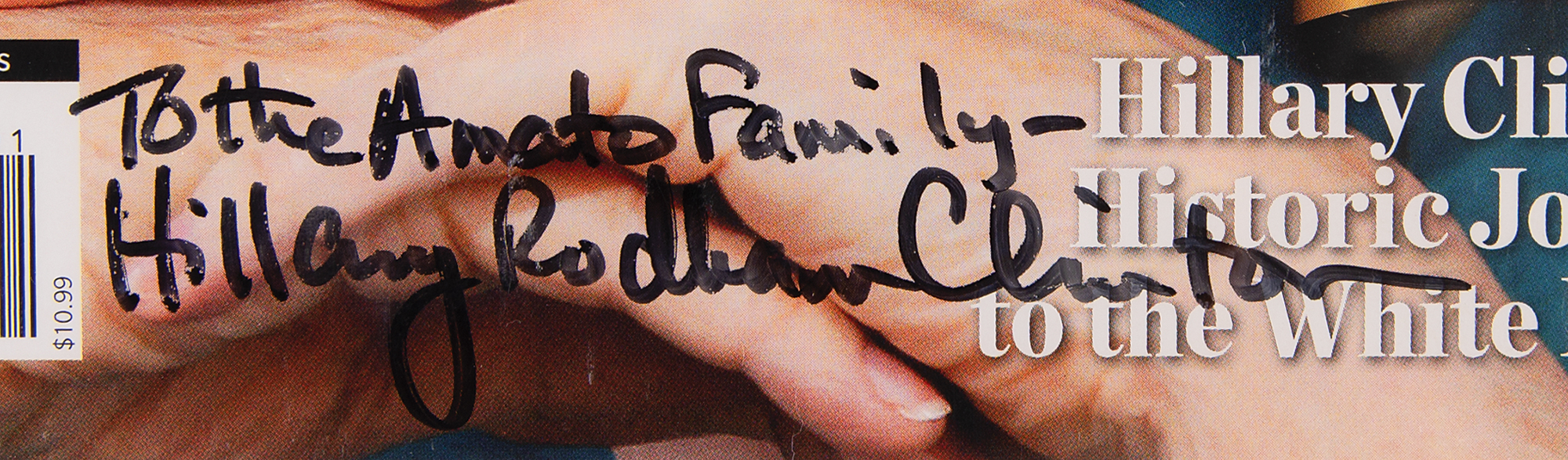 Alternative special commemorative edition of Newsweek magazine from November 8, 2016, celebrating Hillary Clinton's presidential win, 8 x 10.5, signed and inscribed in black felt tip, "To the Amato family – Hillary Rodham Clinton." In fine condition. Encapsulated by CGC with a qualified grade of 8.0. Accompanied by a full letter of authenticity from JSA.