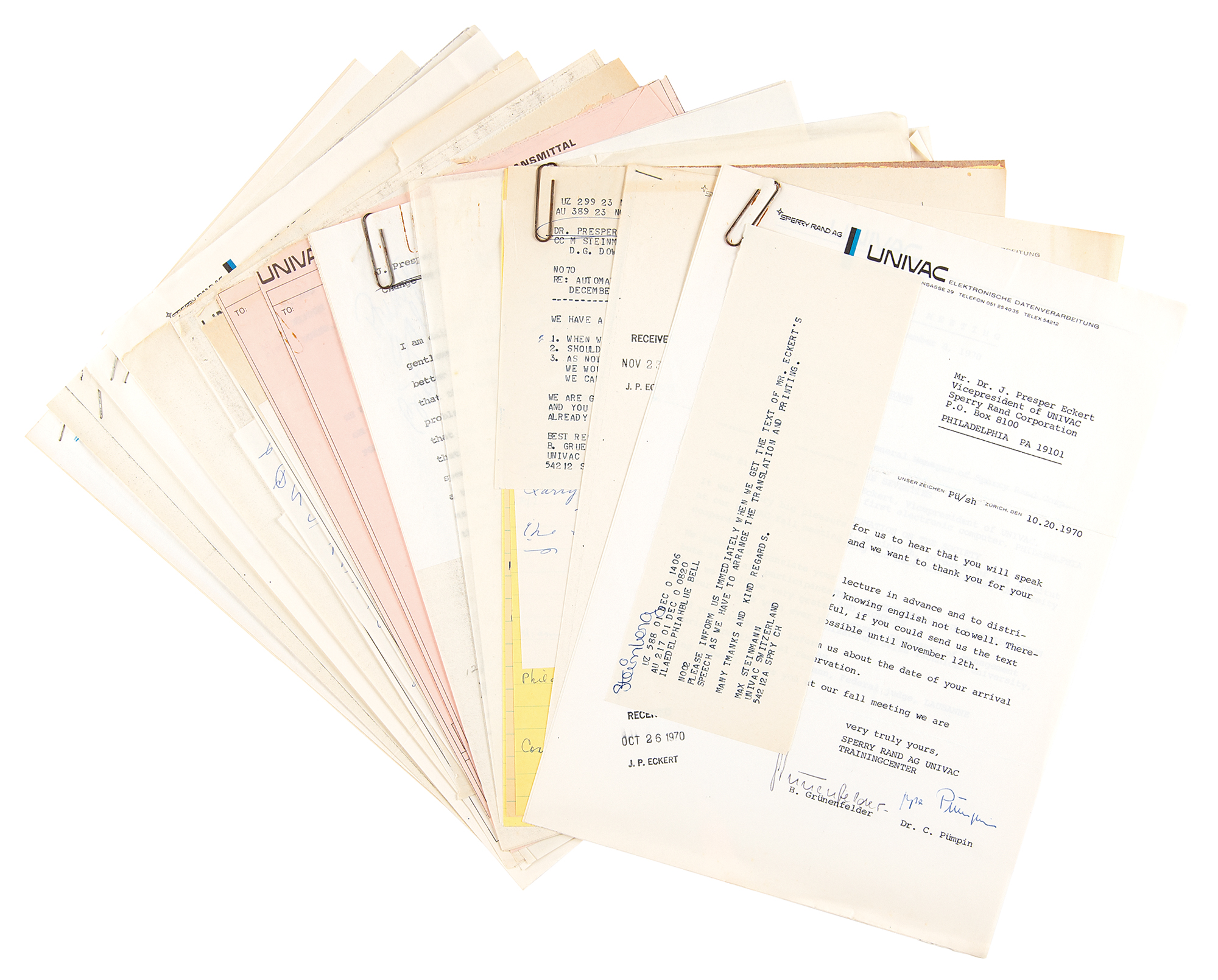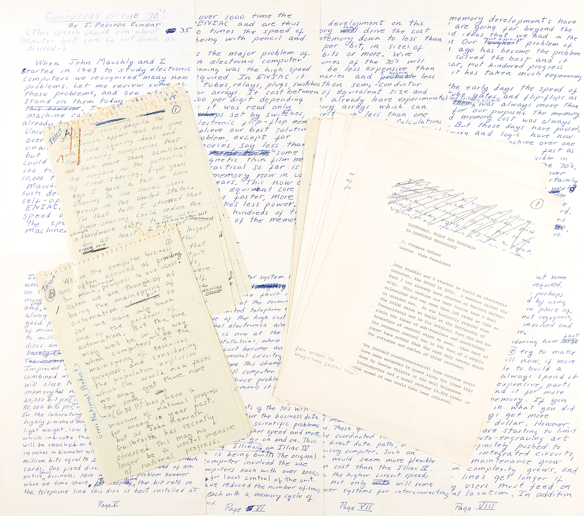 Electrical engineer and computer pioneer (1919–1995) who designed the first general-purpose electronic digital computer (ENIAC) with John Mauchly, and designed the first commercial computer in the United States (the UNIVAC). J. Presper Eckert's handwritten rough draft and hand-corrected drafts of a speech delivered in Zurich, Helsinki, and Tokyo, circa 1970, highlighted by a 26-page autograph draft (headed "Computers of the 70s by J. Presper Eckert") and a hand-corrected typed draft (entitled "Yesterday, Today and Tomorrow in Computer Technology"), comprising 12 typed pages plus 16 pages of handwritten insertions. Additionally includes a 12-page photocopy of the speech, an 8-page photocopy of galley proofs of the speech, and several pages of original and mimeographed correspondence, telegrams, and papers related to Eckert's travels and speaking engagements.