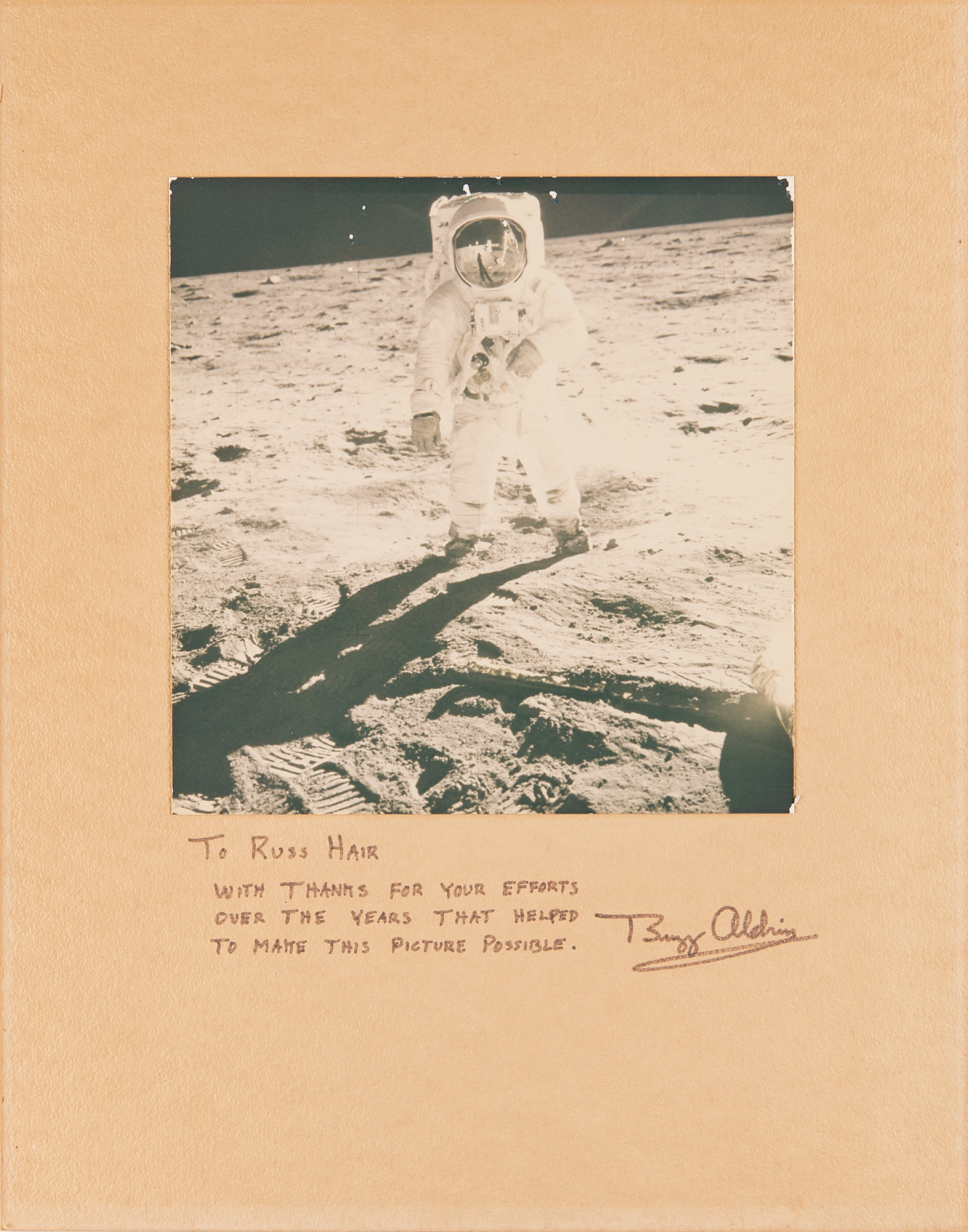 Official color glossy 7 x 7.25 photo of LMP Aldrin standing on the lunar surface during the Apollo 11 mission, his visor showing a small reflection of the photographer, Neil Armstrong, affixed to the original 11 x 14 cardstock mount, which is signed and inscribed in black felt tip, “To Russ Hair, with thanks for your efforts over the years that helped to make this picture possible. Buzz Aldrin.” The reverse of the mount bears an affixed red-numbered NASA ID: “AS11-40-5903.” In fine condition, with small flecks of emulsion loss to the image.