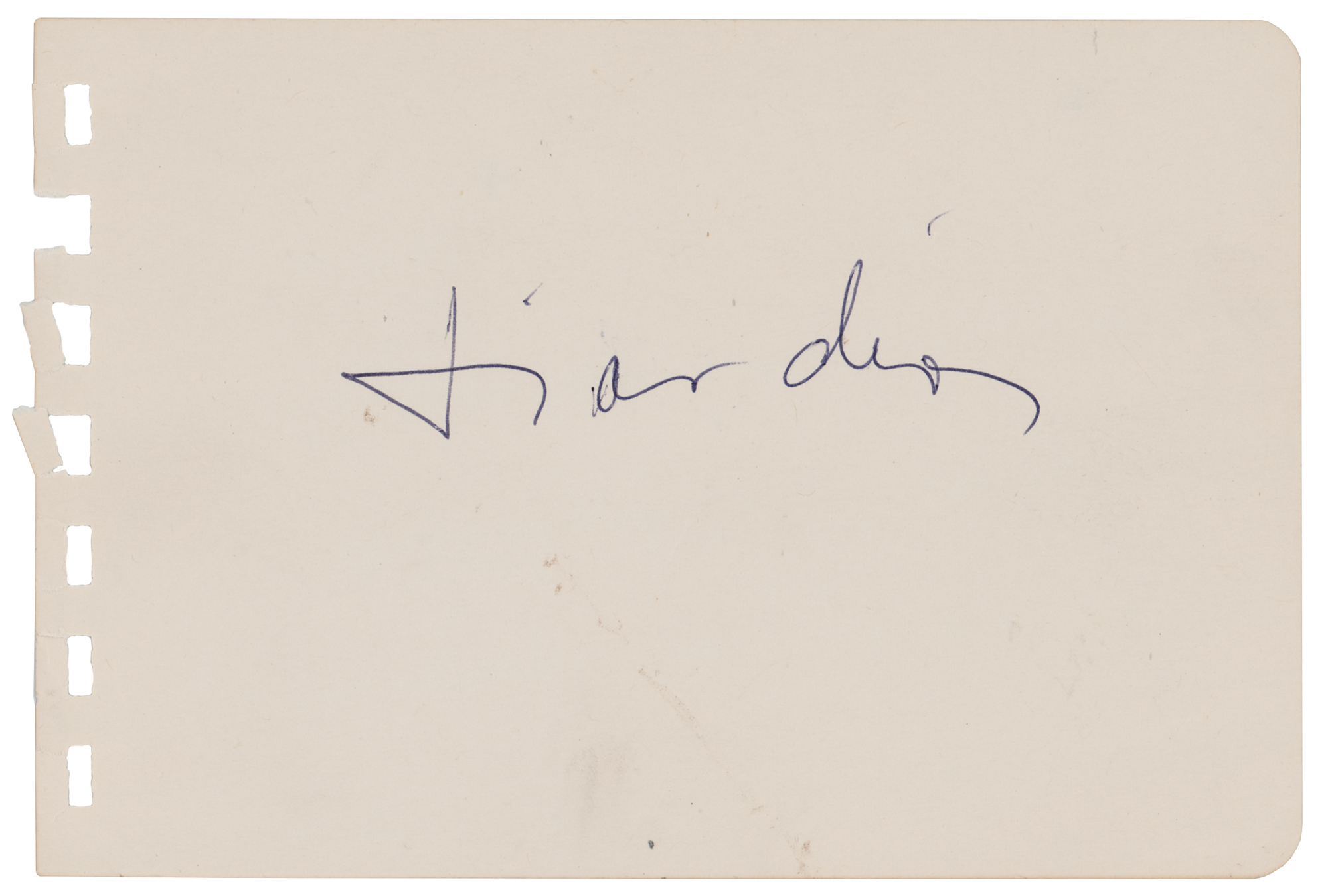 Vintage ballpoint signature by French fashion designer Christian Dior, "tian dior,” on a white 6.5 x 4.5 album page. In fine condition. Accompanied by a full letter of authenticity from JSA.