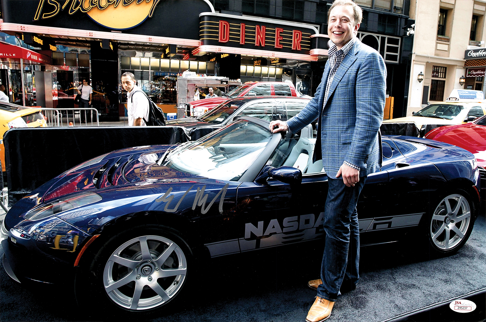 Color satin-finish 18 x 12 photo of Elon Musk posing in front of a NASDAQ Tesla Roadster in Times Square following the electric automaker's initial public offering, signed in silver ink. In fine condition, with a JSA label affixed to the lower corner. Accompanied by a certificate of authenticity from JSA. Tesla's IPO took place on June 29, 2010, when the company offered 13.3 million shares at $17 per share, raising approximately $226 million. Today, it is the world's most valuable car company with a market capitalization of over $600 billion.