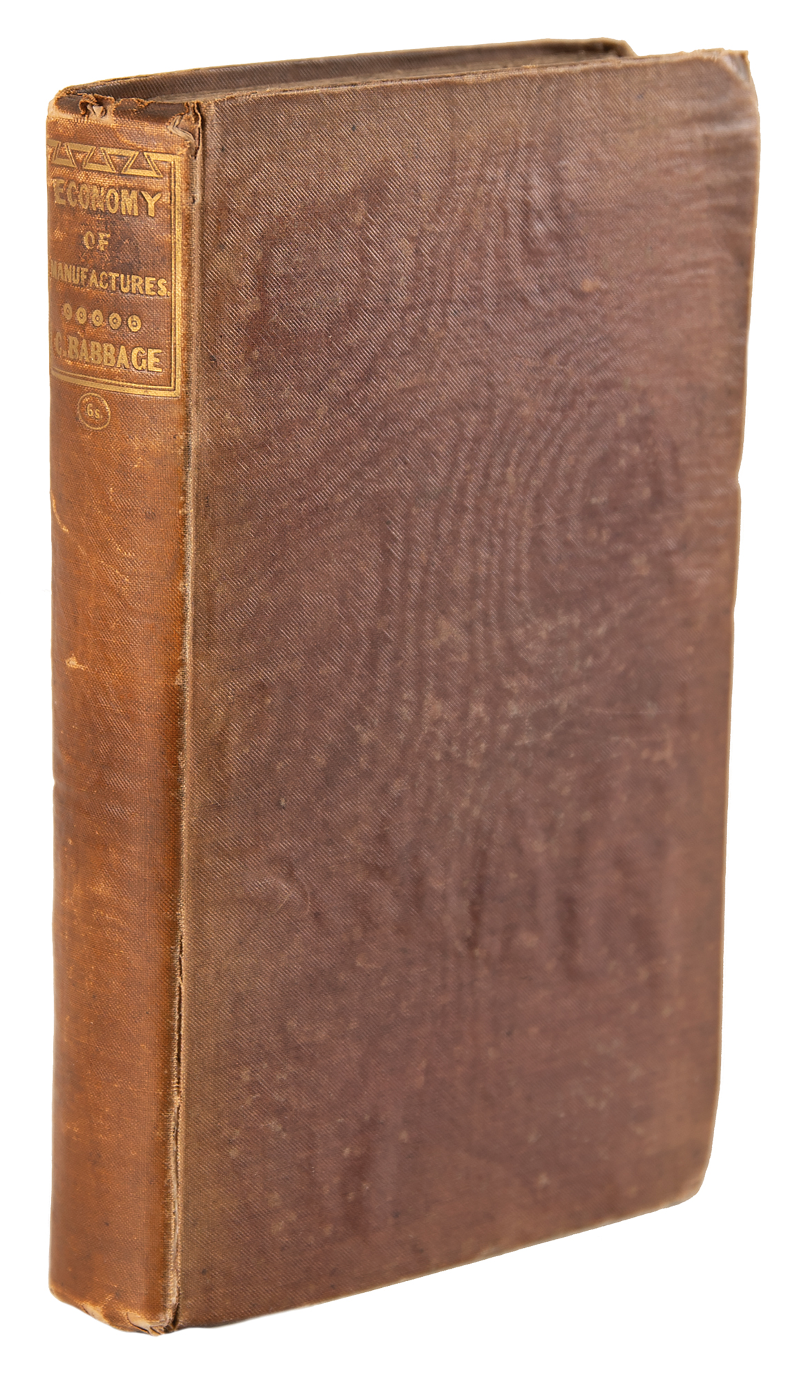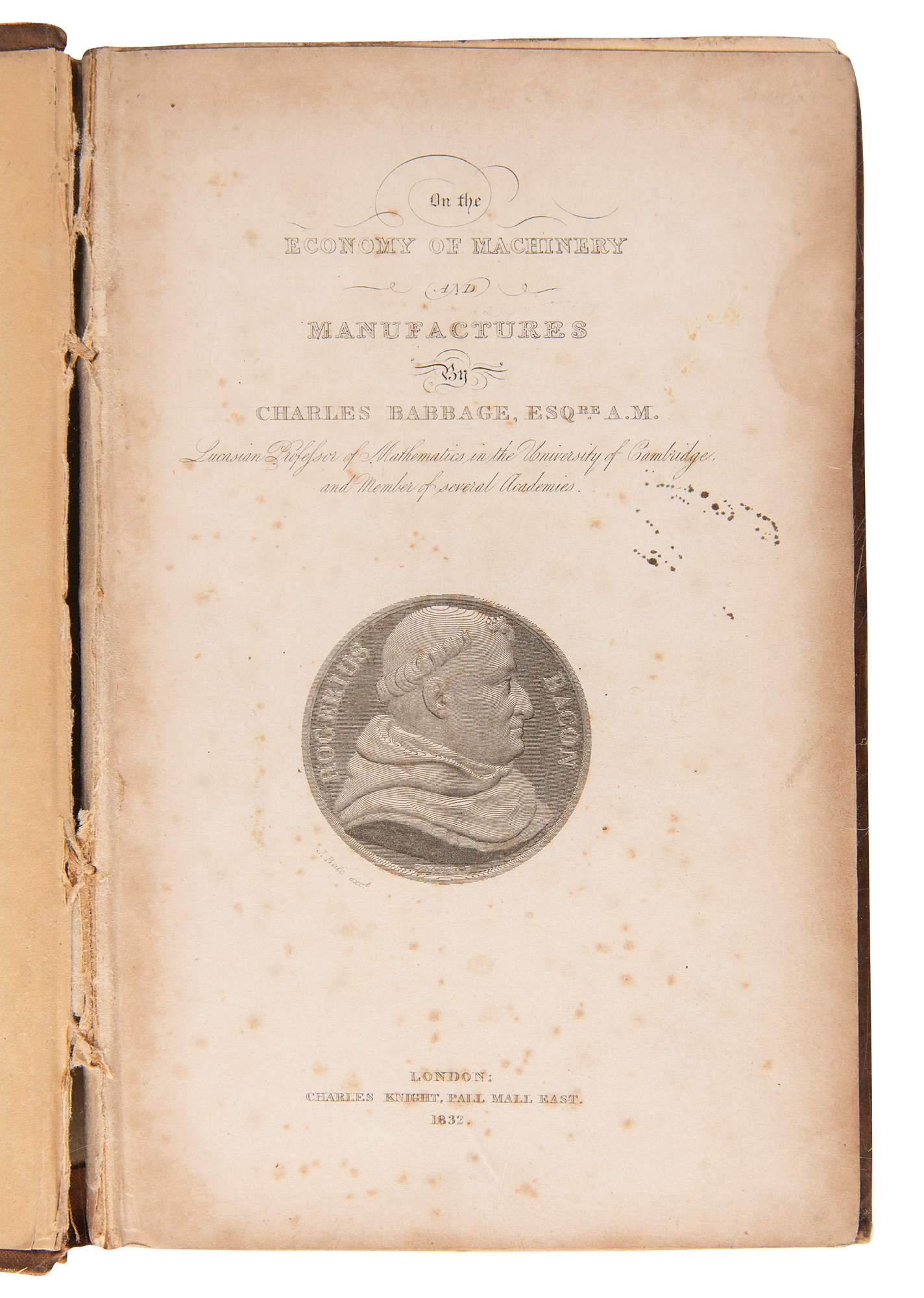 Pioneering British mathematician and mechanical engineer (1791–1871) whose Difference Engine and Analytical Engine are generally acknowledged as the first programmable computers. Scarce first edition book: On the Economy of Machinery and Manufactures by Charles Babbage. First edition. London: Charles Knight, 1832. Hardcover bound in the publisher's original moiré-textured plum cloth, with gilt-stamped title and price ("6 s.") on the spine, 4.5 x 7, 320 pages plus one advertising leaf in the rear. The engraved title-page incorporates a medallion portrait of Roger Bacon. Book condition: G-/None, with a cracked front hinge, bumped and worn corners, heavy foxing to title page, dampstaining to boards, sunning to spine, some splitting to the cloth on the front joint, and an ink notation opposite the title page. Accompanied by a later slipcase.