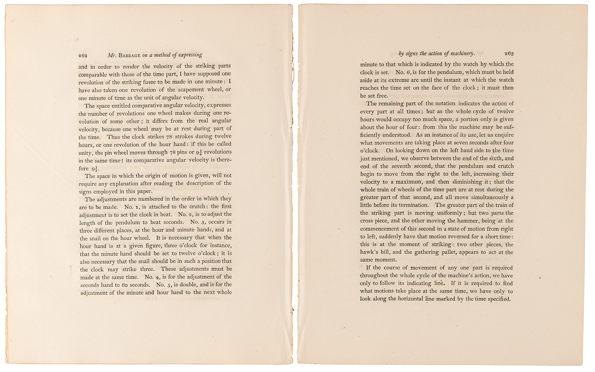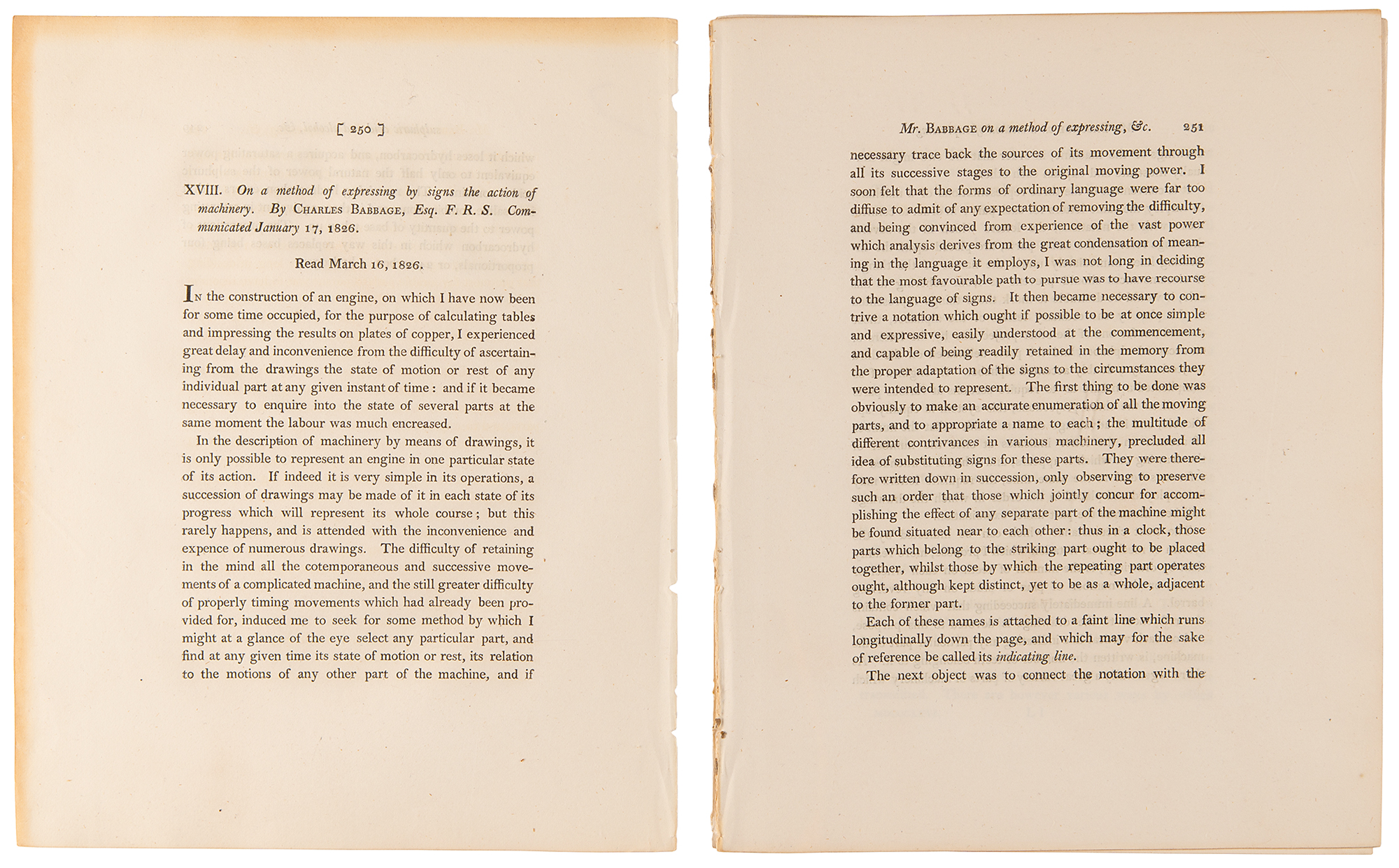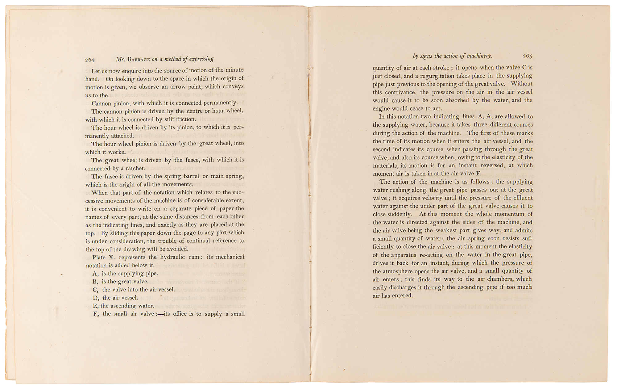 Pioneering British mathematician and mechanical engineer (1791–1871) whose Difference Engine and Analytical Engine are generally acknowledged as the first programmable computers. Uncommon paper by Charles Babbage entitled "On a Method of Expressing by Signs the Action of Machinery," an extract from Philosophical Transactions, as read on March 16, 1826. Disbound, 8.5 x 10.75, 15 pages plus four engraved plates. In the 1820s, notations to describe a machine's actions were coarse, inaccurate and antiquated; Babbage therefore found it necessary to design his own notation. The paper includes four engraved plates showing a mechanical eight-day clock, Babbage's mechanical notation of the same clock, and a hydraulic ram with its mechanical notation below. It is interesting that this notation, while presenting some problems, allowed the building of a working model of Charles Babbage's Difference Engine No. 2 in 1990 at the Science Museum in London. In fine condition.