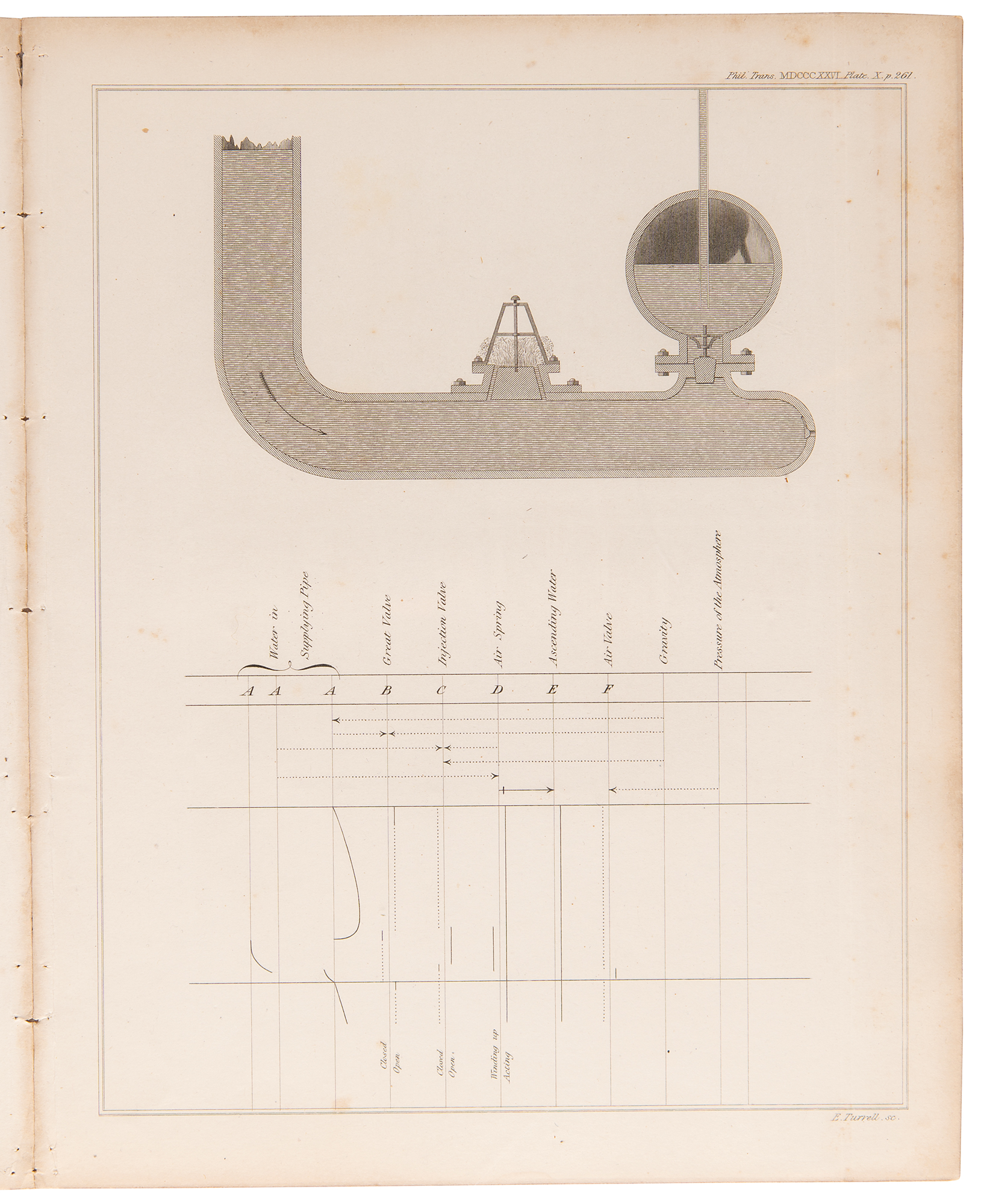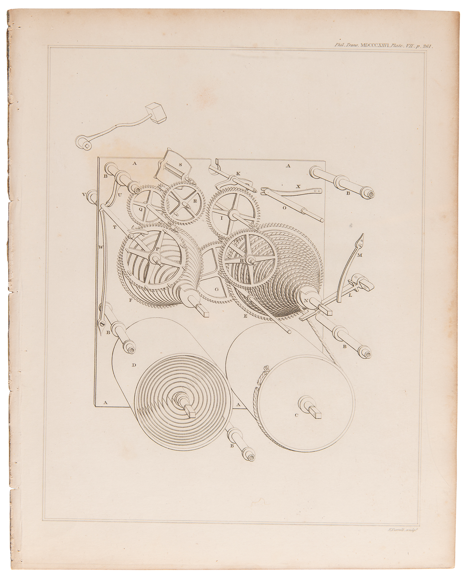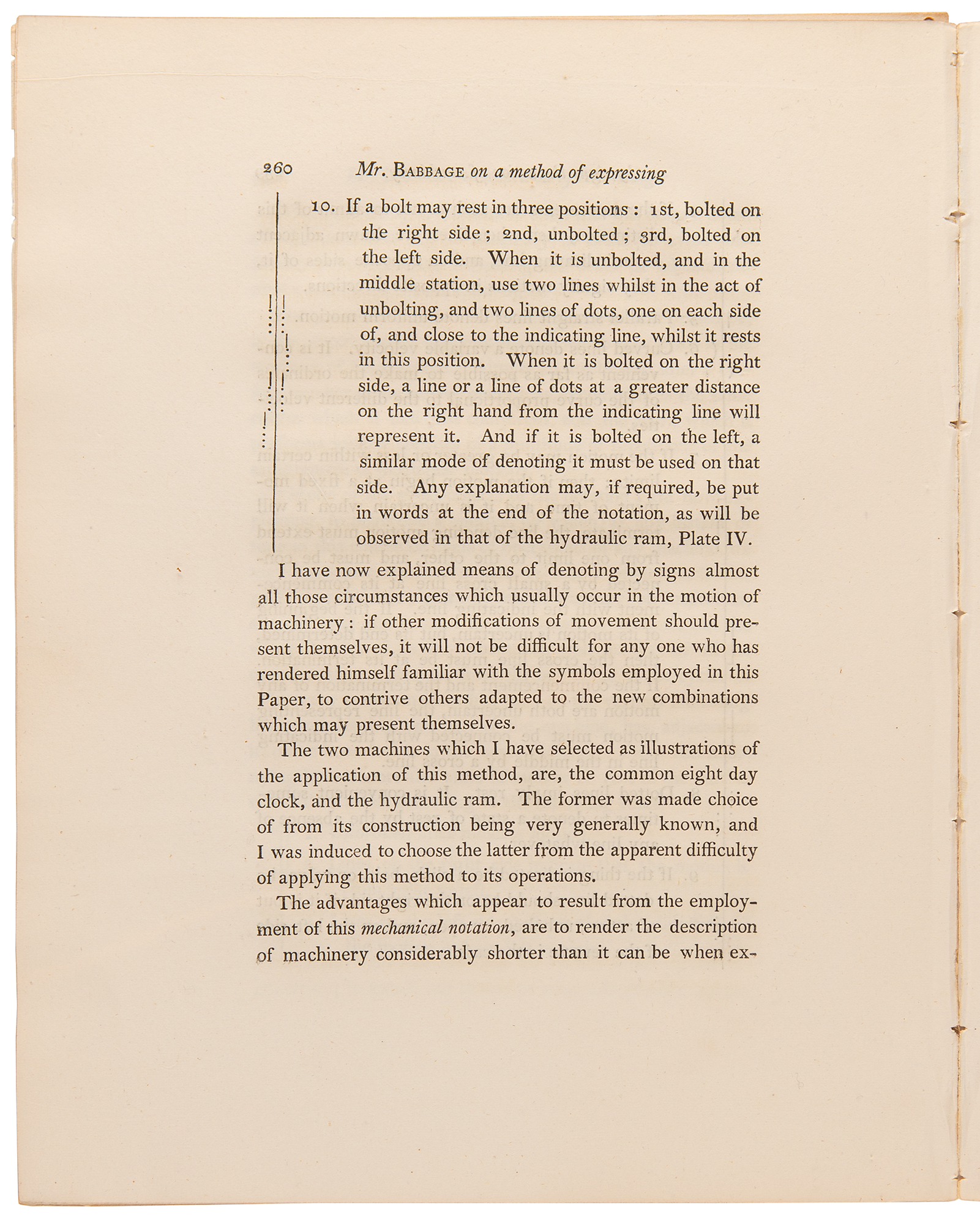 Pioneering British mathematician and mechanical engineer (1791–1871) whose Difference Engine and Analytical Engine are generally acknowledged as the first programmable computers. Uncommon paper by Charles Babbage entitled "On a Method of Expressing by Signs the Action of Machinery," an extract from Philosophical Transactions, as read on March 16, 1826. Disbound, 8.5 x 10.75, 15 pages plus four engraved plates. In the 1820s, notations to describe a machine's actions were coarse, inaccurate and antiquated; Babbage therefore found it necessary to design his own notation. The paper includes four engraved plates showing a mechanical eight-day clock, Babbage's mechanical notation of the same clock, and a hydraulic ram with its mechanical notation below. It is interesting that this notation, while presenting some problems, allowed the building of a working model of Charles Babbage's Difference Engine No. 2 in 1990 at the Science Museum in London. In fine condition.