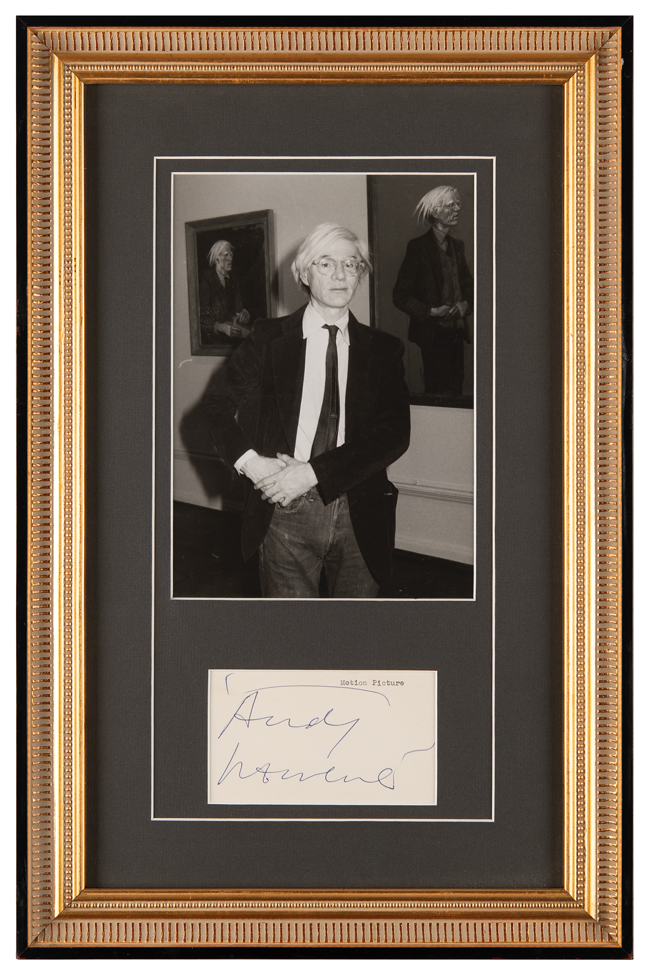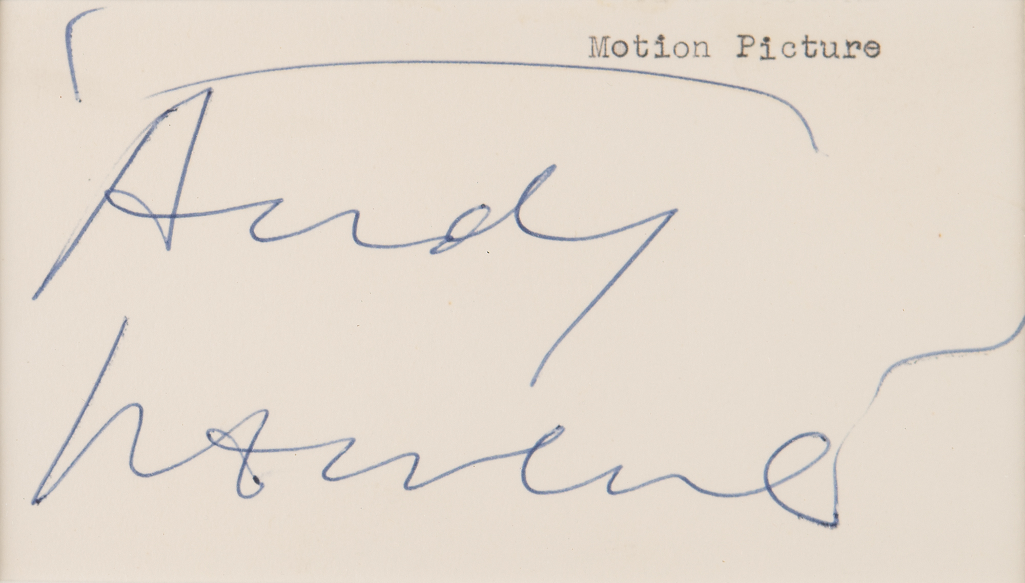 Large vintage ballpoint signature, "Andy Warhol,” on a white 5 x 3 card, nicely double-matted and framed with a portrait to an overall size of 13.25 x 20.5. In fine condition.