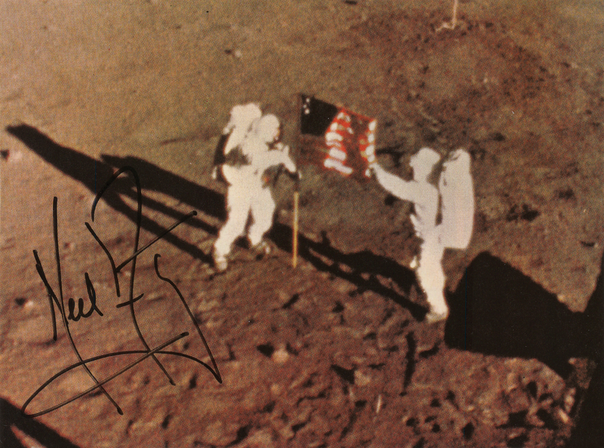 Rare color 4.25 x 3.5 cardstock photo showing the Apollo 11 astronauts after planting the American flag on the lunar surface, signed in black felt tip by Neil Armstrong. In fine condition, with trimmed edges. Very few photos of Neil Armstrong on the moon exist, as he was the chief photographer during the Apollo 11 EVAs—this remarkable image was captured by the 16mm Data Acquisition Camera that was mounted inside the Lunar Module. It is one of the iconic photographs of the 20th century, captured at the moment of Apollo 11's triumphant climax as the stars and stripes were first unfurled on another celestial body.