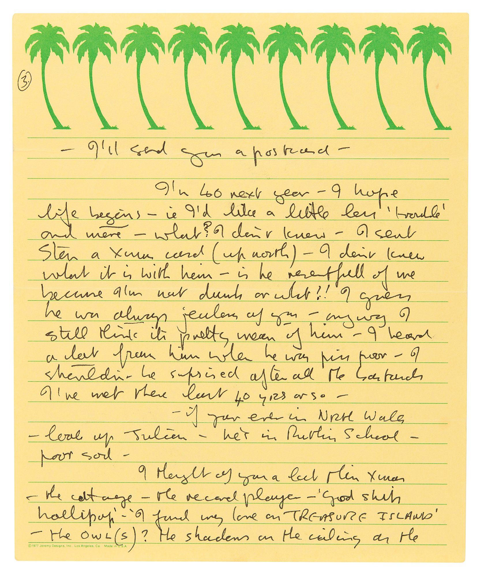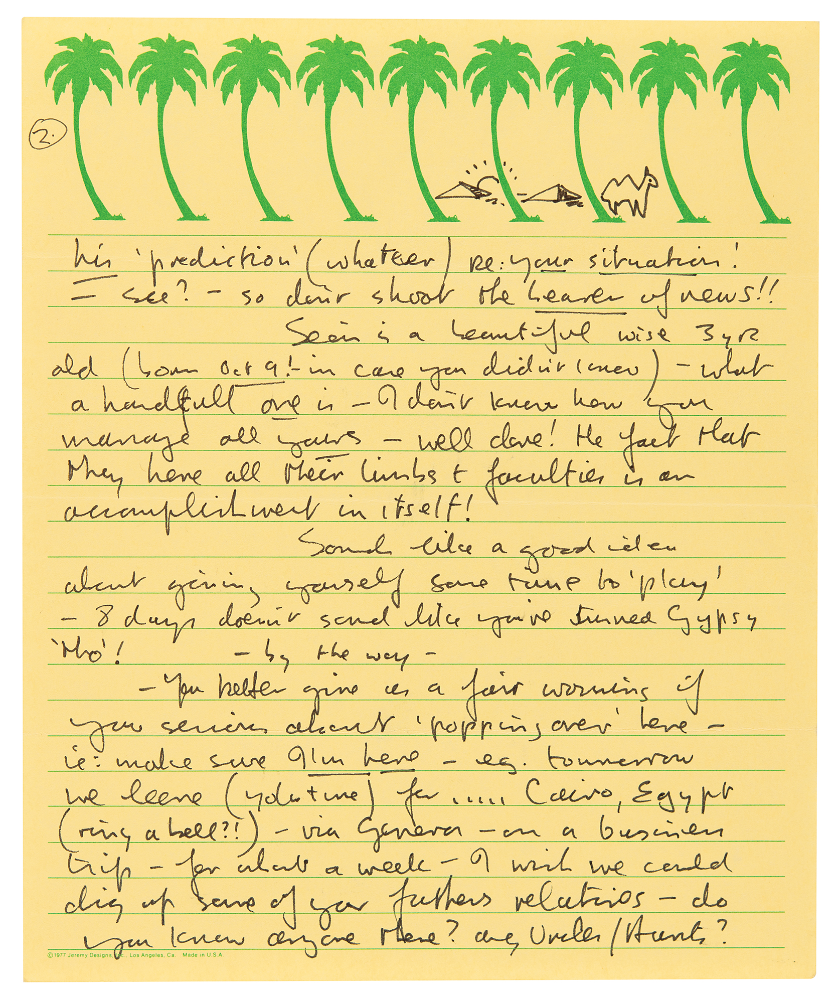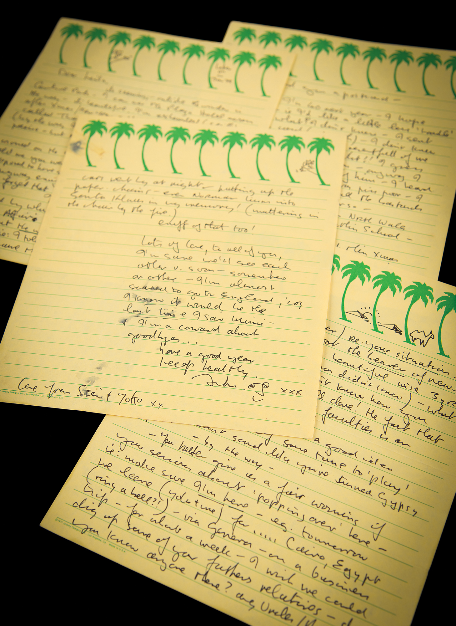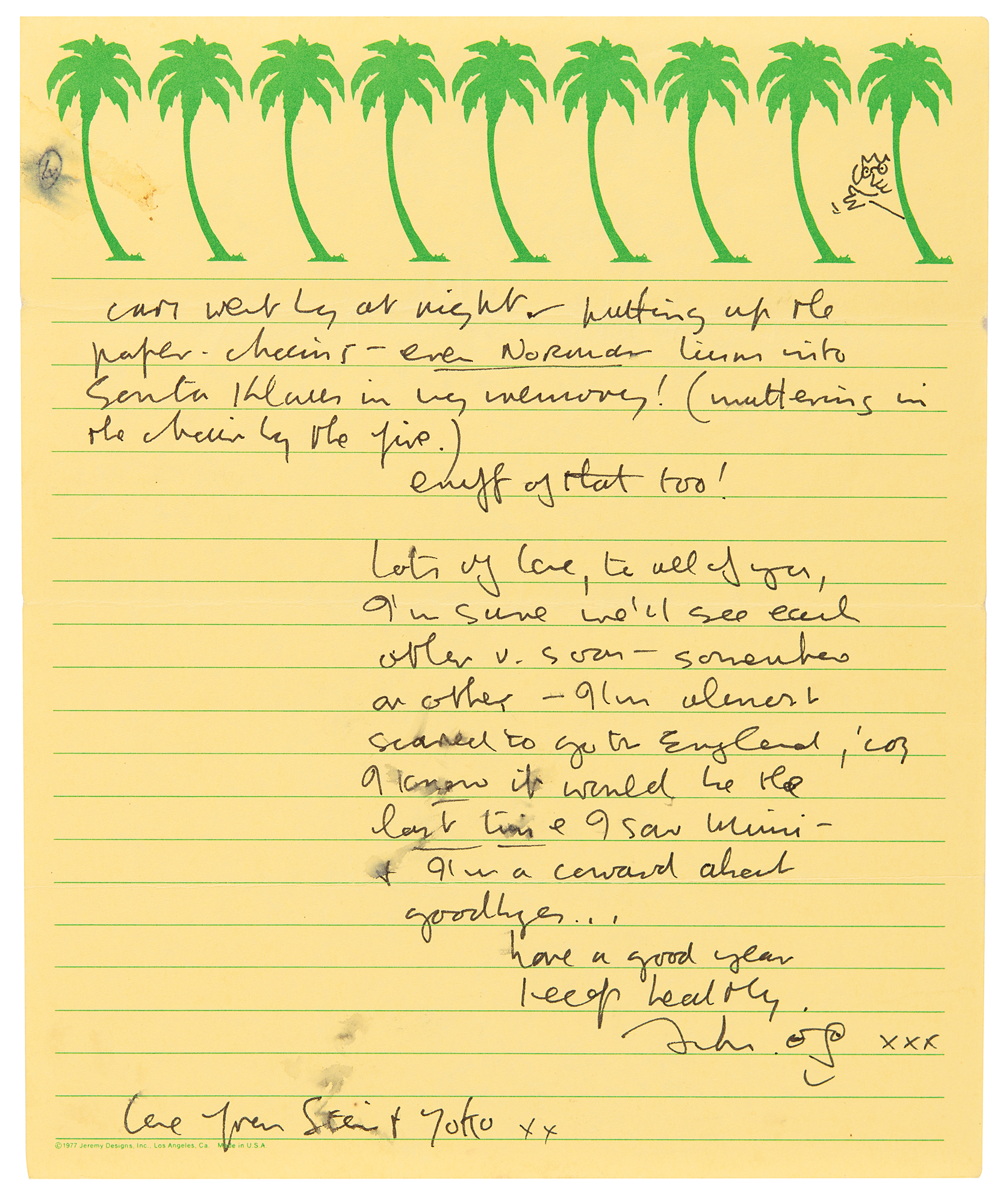 Lots of love, to all of you, I'm sure we'll see each other v. soon ? somewhere or other ? I'm almost scared to go to England, 'coz I know it would be the last time I saw Mimi ? & I'm a coward about goodbyes. Have a good year, keep healthy.? Lennon adds below, ?Love from Sean & Yoko, xx.? Additionally, Lennon incorporates a few small sketches to the stationery?s palm trees, including a camel, pyramids with a sun, and two waving figures. In fine condition, with a few small areas of ink spotting on the last page, due to moisture, not affecting signature or caricature.