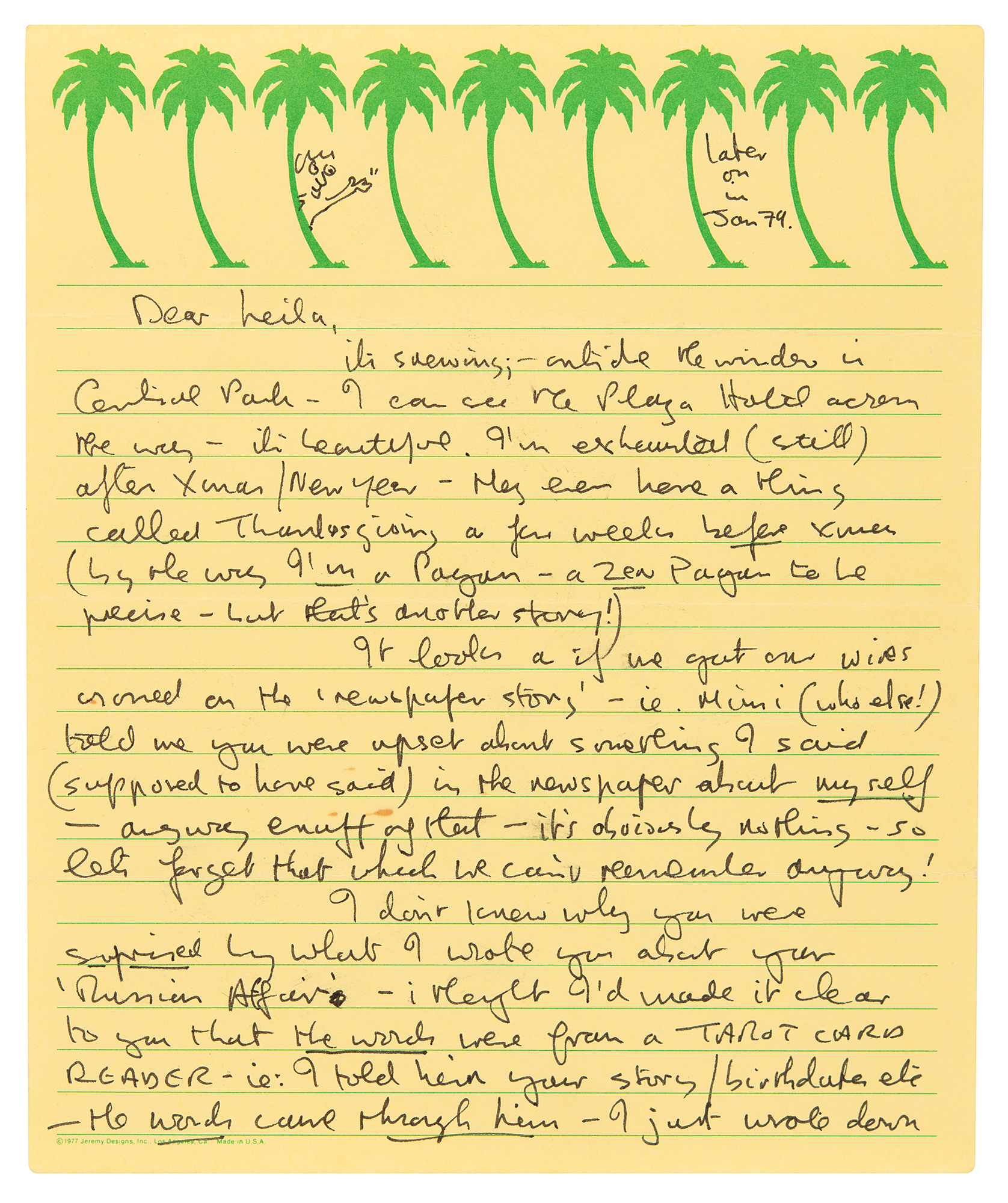 Incredible ALS signed ?John, xxx,? who adds a smiley face sketch, four pages of yellow ?palm tree? stationery, 7 x 8.5, January 1979. Addressed from the Dakota apartments in Manhattan, a lengthy handwritten letter from John Lennon to his cousin, Liela (Birch) Harvey, in full, ?It's snowing ? outside the window in Central Park ? I can see the plaza Hotel across the way ? it's beautiful. I'm exhausted (still) after Xmas/New Year ? they even have a thing called Thanksgiving a few weeks before Xmas (by the way I'm a Pagan ? a Zen Pagan to be precise ? but that's another story!)