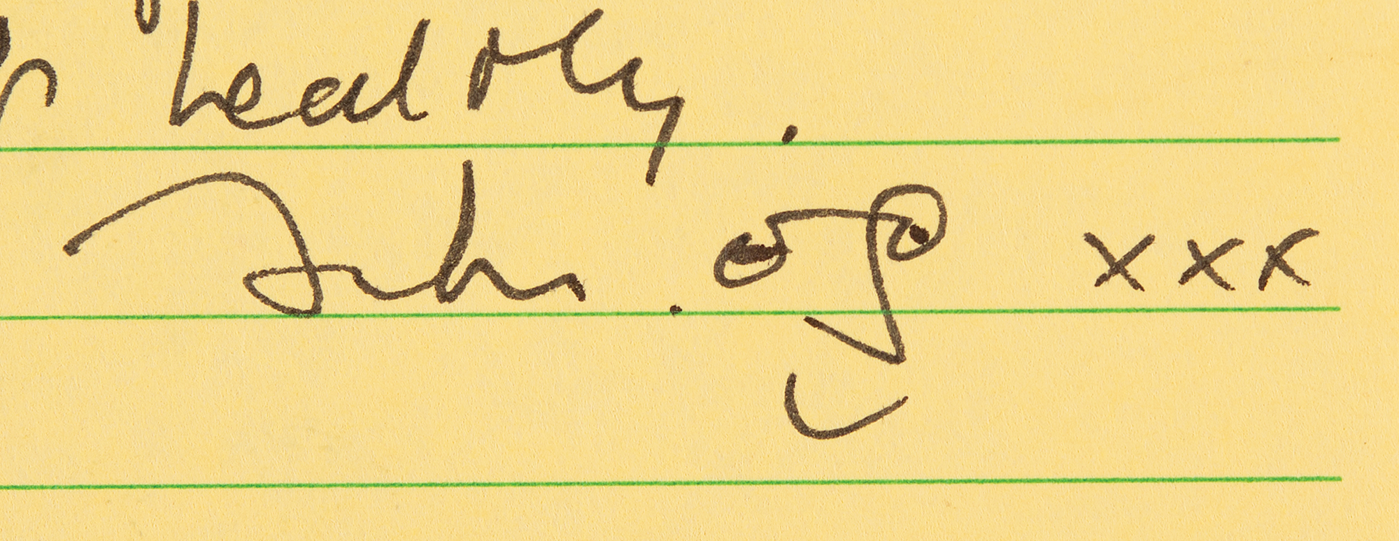 A thoughtful, content-rich letter from John Lennon to his first cousin, Liela, reminiscing about childhood holidays, sharing news of his young son, Sean, and revealing his trepidation about a potential visit to Liverpool. Lennon, after moving to New York City in 1971, never did travel back home to England, a blend of business, green card issues, and, apparently, anxiety, being the chief reasons. Although Lennon often communicated with his aunt Mimi Smith, he never did see her again in person; Lennon was killed outside the Dakota the following year on December 8, 1980, at 40 years old, an age that, as this letter infers, Lennon had high hopes for. Given that Smith lived until 1991, there?s reason to believe that the two would have reunited had Mark David Chapman not interfered.