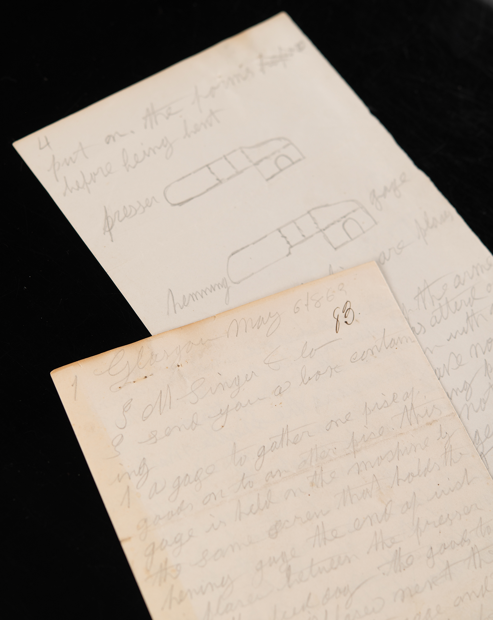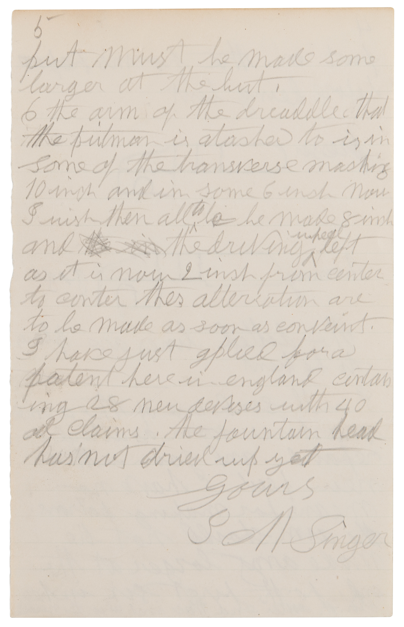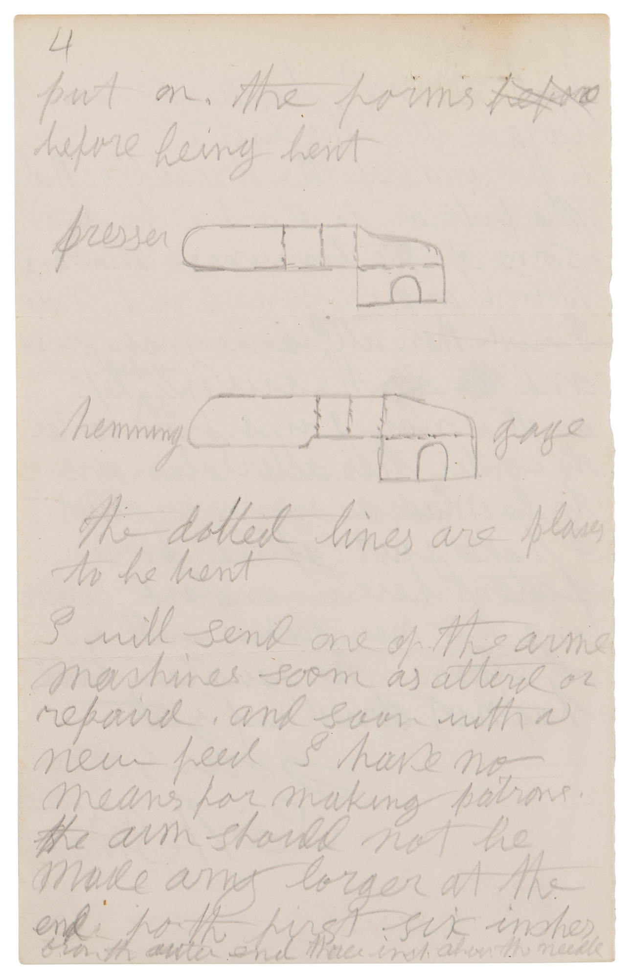 A new way to put on the part and the hemmer it will cost no more than it dose now. As they can boath be made from one pise pushed out of the solid and then struck up this make more room under the heming gage or if any other kind of gage or preasser is required it is easy put on the forms before being bent. [Here, Signer sketches diagrams of the presser and hemming gauge]…I will send one of the arm mashines soon as attend or repaird. And soon with a new feed I have no means for making patrons. The arm should not be made any larger at the end for the first six inshes from the other end three insh above the needle…the arm of the dreaddle that the putman is atashed to is in some of the transverse mashines 10 insh and in some 6 insh. Now I wish them all to be made 8 insh and the driving wheel left as it is now 2 insh from center to center thes alteration are to be made as soon as conveint. I have just aplied for a patent here in England containing 28 new devises with 40 old claims. The fountain head has not dried up yet." In fine condition, with light edge toning, and a stray ink stain, to the first page.