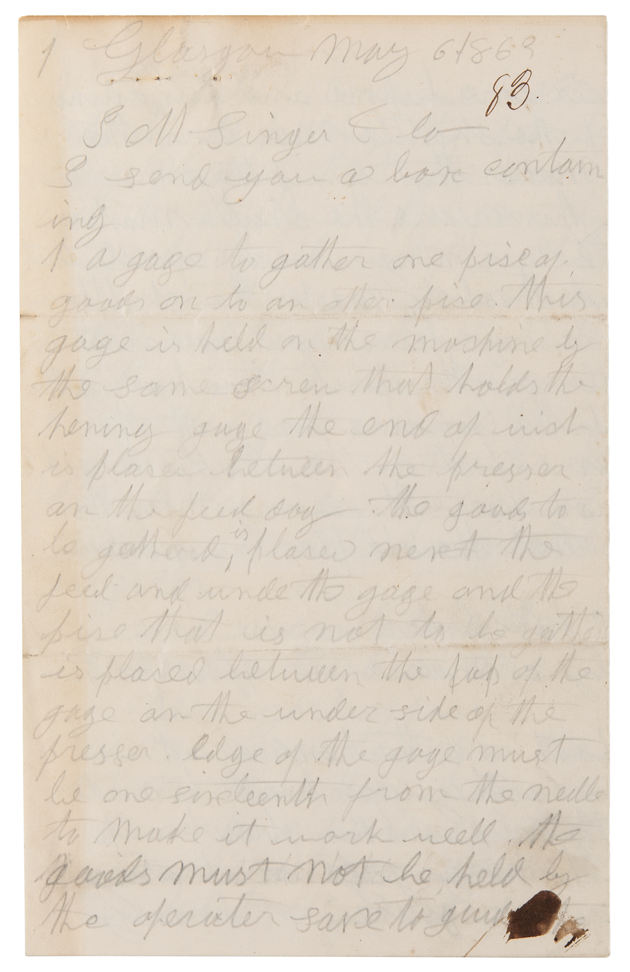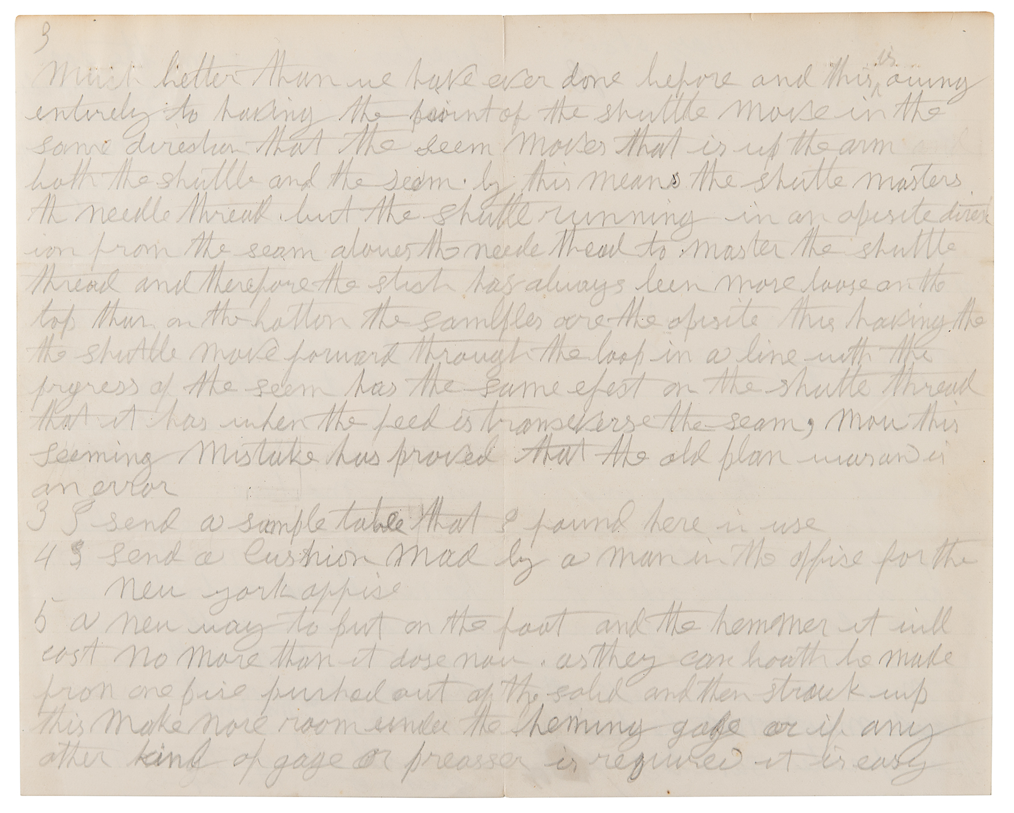 American inventor, actor, and entrepreneur (1811-1875) known for his important improvements to the sewing machine, who founded the Singer Sewing Machine Company. Incredibly rare ALS signed “I. M. Singer,” six pages on three leaves, 5 x 6, May 6, 1863. Remarkable handwritten letter in pencil, signed at both the head and the conclusion by Isaac M. Singer, discussing improvements to the sewing machine. In part (spelling and grammar retained): "I send you a box containing…a gage to gather one pise of goods on to an other pise. This gage is held on the mashine by the same screw that holds the heming gage…in plase between the presser on the feed dog the goods to be gathered, in plases next the feed and unde[r] the gage and the pise that is not to be gatter is placed between the top of the gage on the under side of the presser. Edge of the gage must be one sixteenth from the nedle to make it work well. The goods must not be held by the operater save to guid[e] the direction of the seem. The gage will gather more or less acording to the preshure put upon the presse pad in the common way. I send some samples done by the gage in the same box…