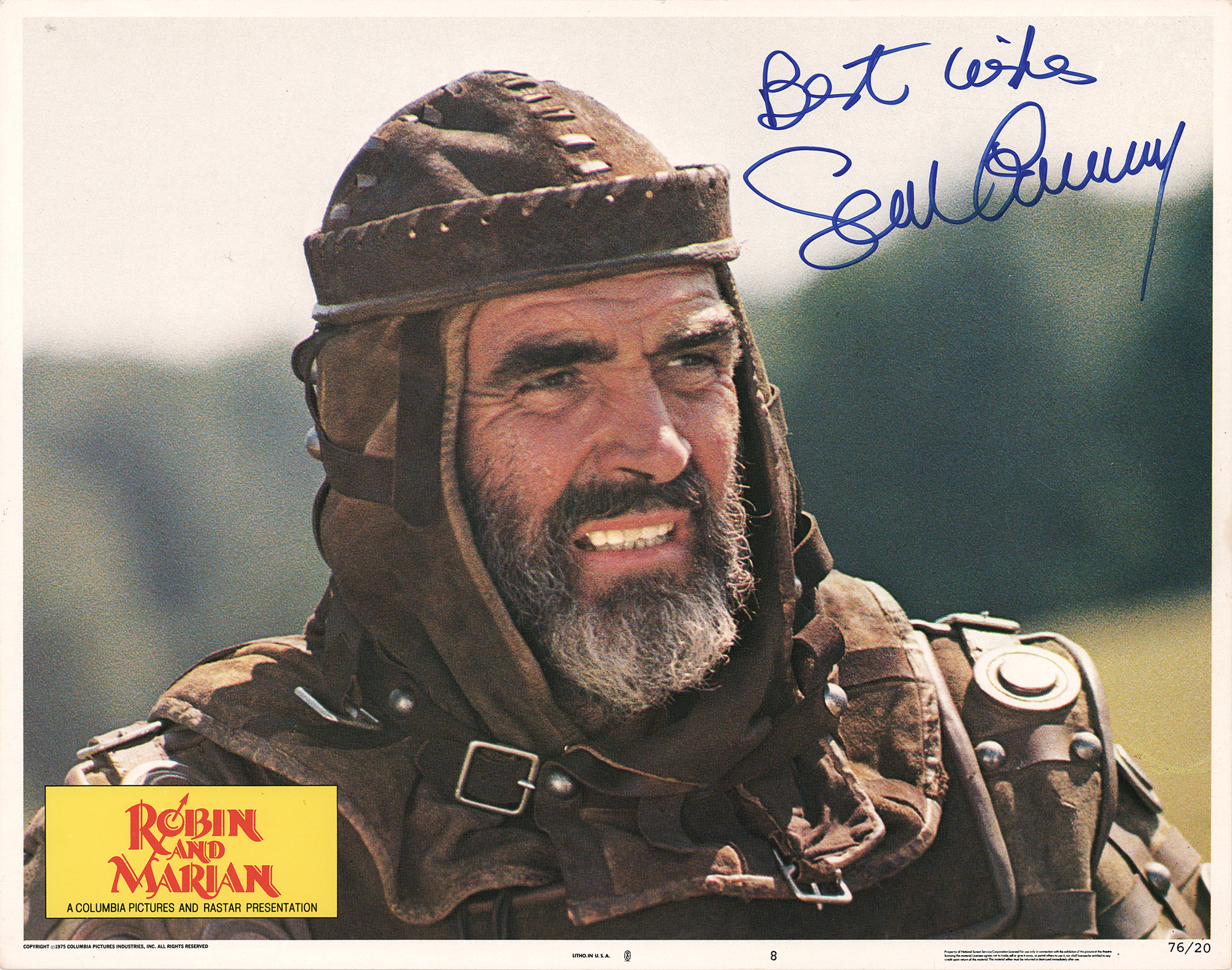 Color 14 x 11 Columbia Pictures lobby card of Sean Connery as the heroic outlaw Robin Hood in the 1976 film Robin and Marian, signed in blue felt tip, "Best wishes, Sean Connery." In fine condition.