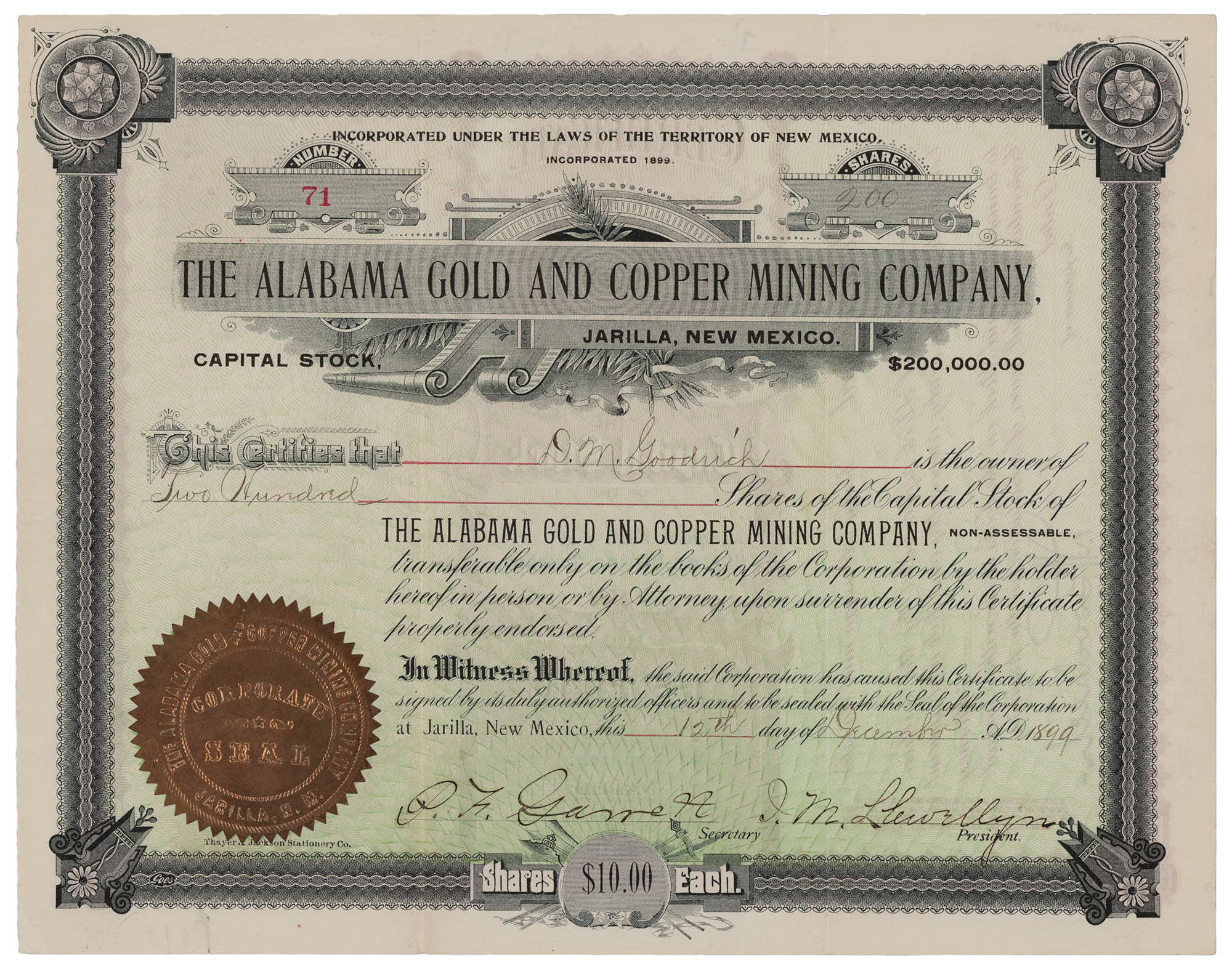 New Mexico lawman (1850–1908) who killed his former gambling partner, the fabled outlaw Billy the Kid, in 1881. Partly-printed DS, signed “P. F. Garrett,” one page, 10.25 x 8, December 12, 1899. Stock certificate for 200 shares of capital stock in the Alabama Gold and Copper Mining Company issued to D. M. Goodrich, signed at the conclusion by Garrett as the company's secretary. The gold foil seal affixed to the lower left corner remains intact. In fine condition. Accompanied by a postcard photo of Garrett.