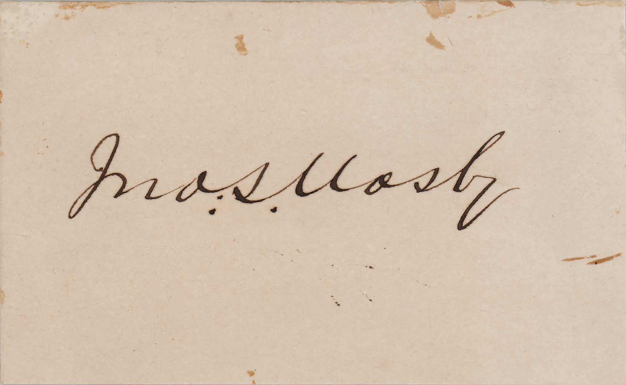 Ink signature, "Jno: S. Mosby,” on an off-white 3 x 1.75 slip. In fine condition, with a few tiny stains. Accompanied by two photos of Mosby.