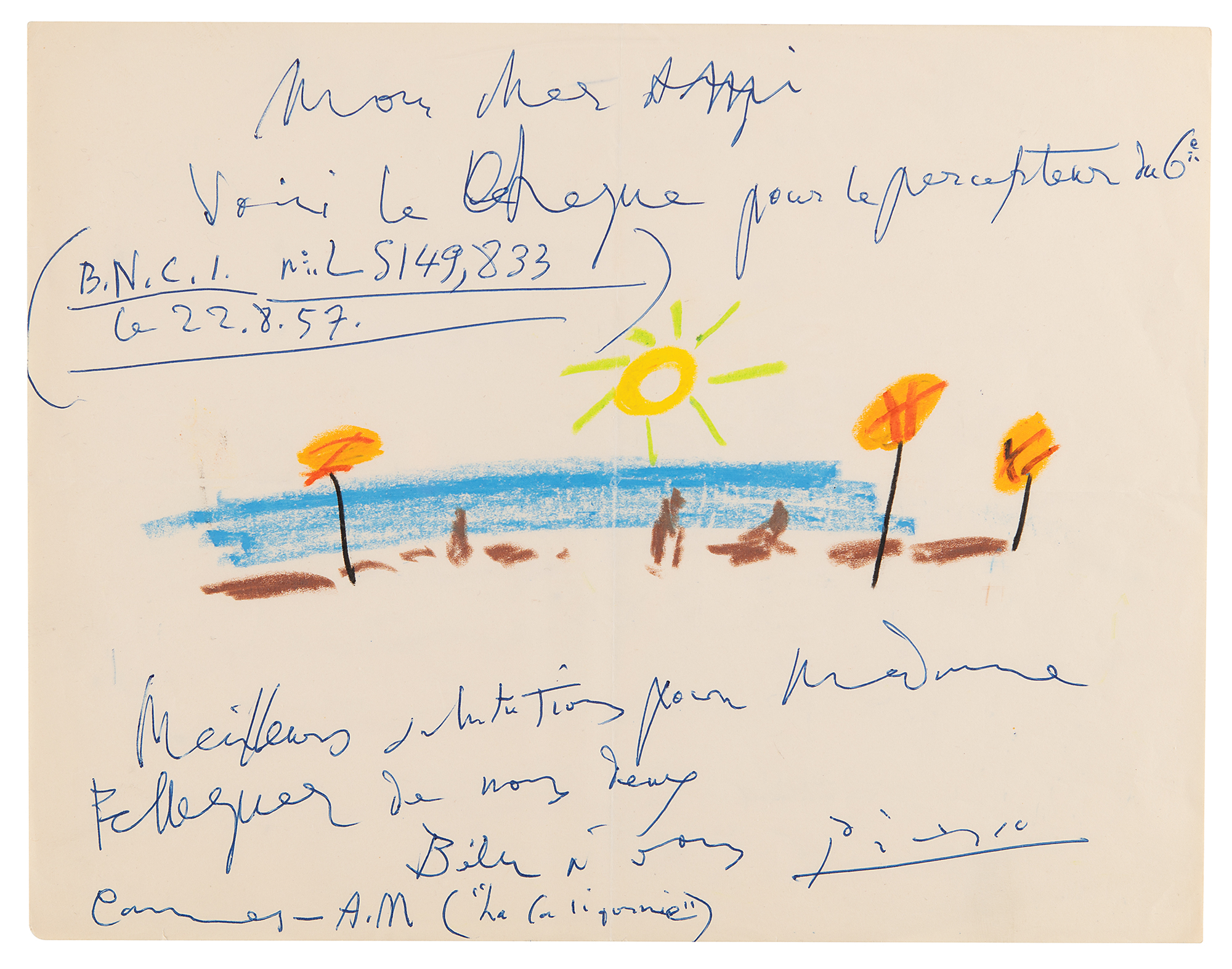 Original sketch by Pablo Picasso of a sunny beach in Cannes, France, accomplished in colored pencil on an off-white 10.75 x 8.25 sheet, depicting a bright sun above a blue ocean and sandy beach with three orange umbrellas. The sheet contains an ALS in French from the artist, signed “Picasso,” dated August 22, 1857. Addressed from the “La Californie” villa, a handwritten letter to his friend and financial advisor Max Pellequer, in full (translated): “My dear friend, Here is the cheque for the taxman of the 6th (bank numbers/dates added in brackets). My best greetings to Madame Pellequer from us both. Kisses to you.” In fine condition, with unobtrusive intersecting folds.