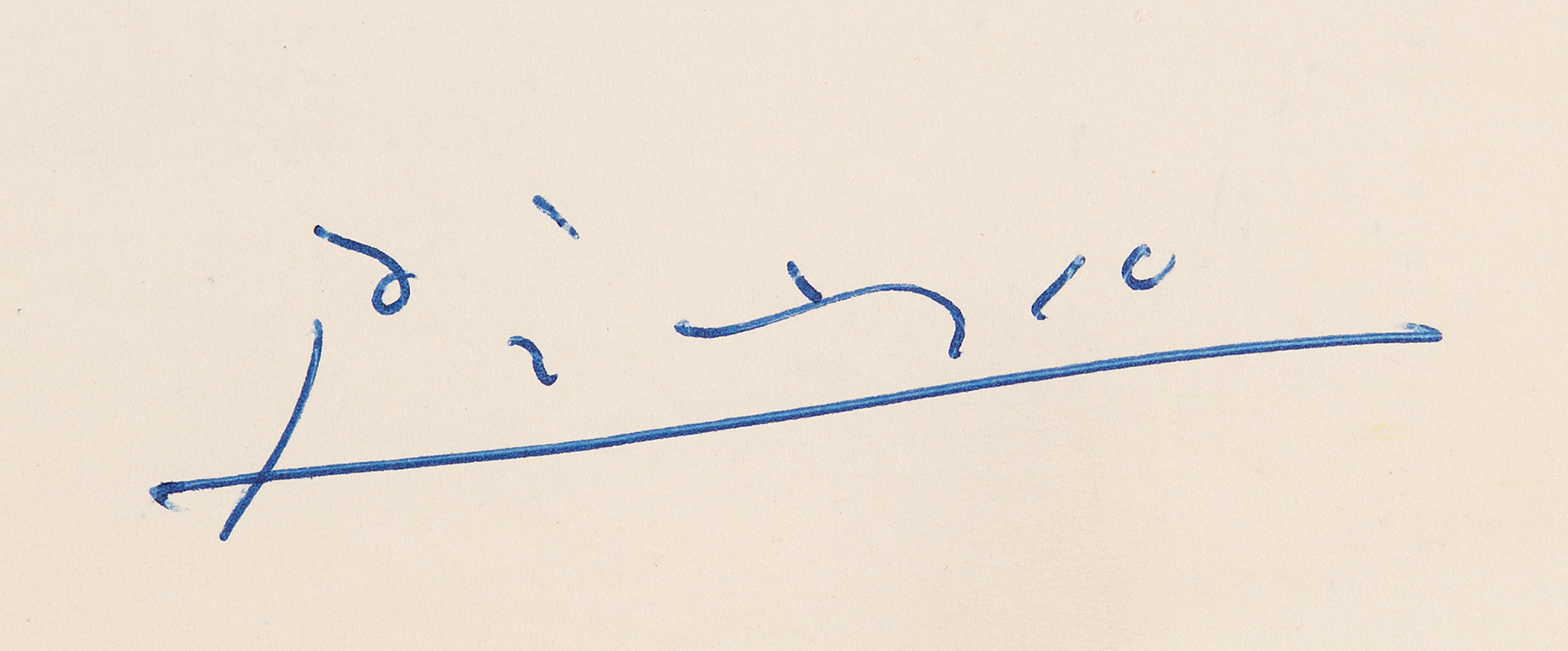 An exquisite original work of summertime fancy from the beloved artist, boasting the rare addition of a holograph letter by Picasso, the scarcity of which French author Laurence Madeline touches on in her article ‘Picasso épistolier,’ stating: ‘The inertia paralyzing Picasso, who preferred his work as an artist to that of a secretary, made the letters he took pleasure in writing more essential and more touching.’ Residing in the hills above Cannes, Picasso was assisted by his loyal secretary and childhood friend, Jaume Sabartés, who handled the majority of his correspondence—except for a few, notably Max Pellequer. Picasso personally wrote each letter to Pellequer, even the most trivial ones, often including small, colorful sketches to delight his trusted correspondent.