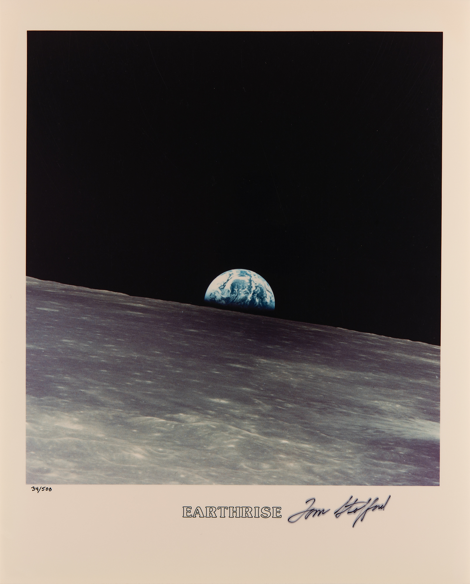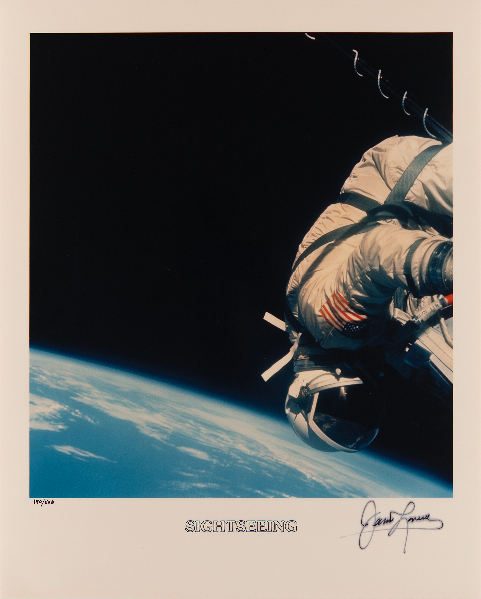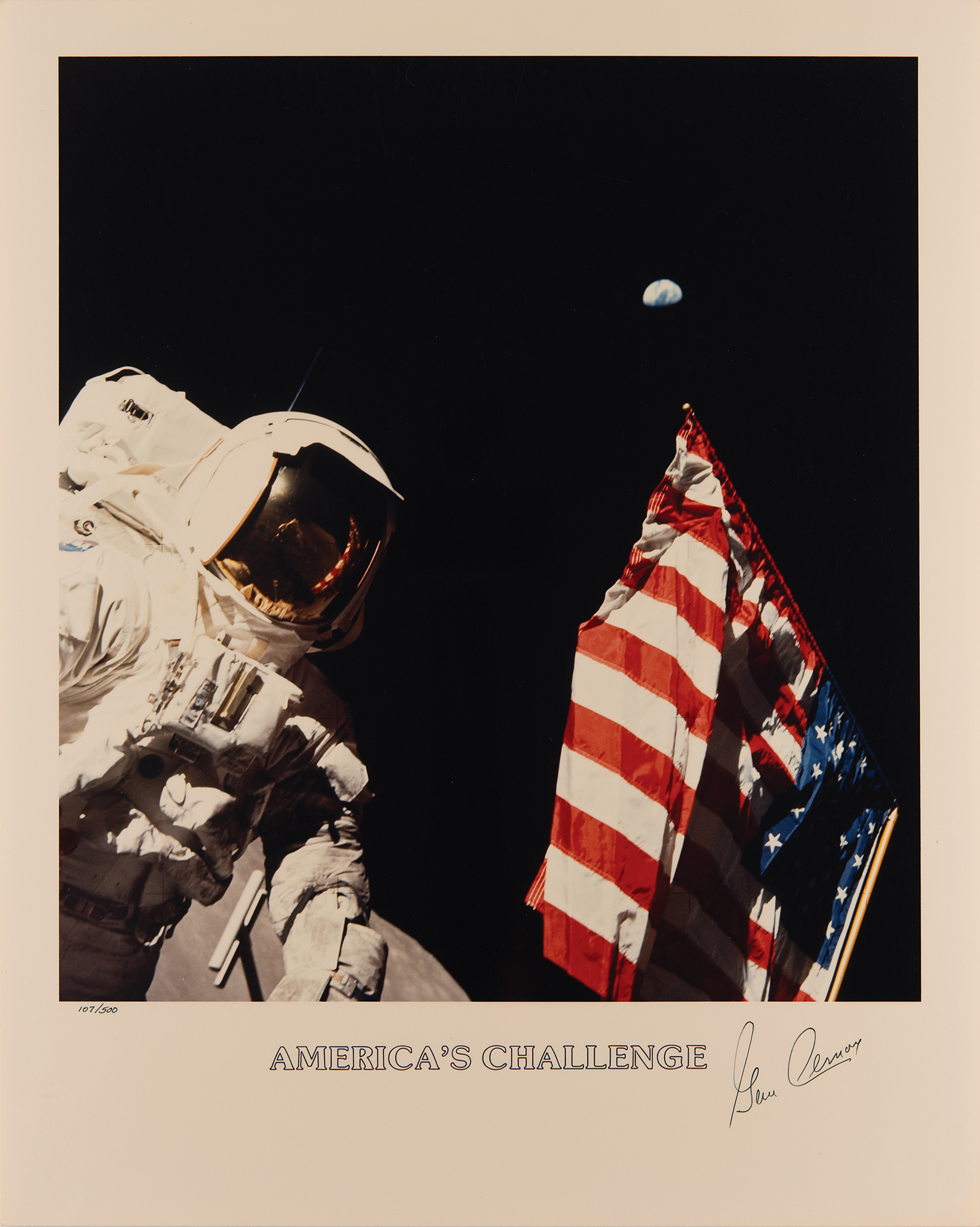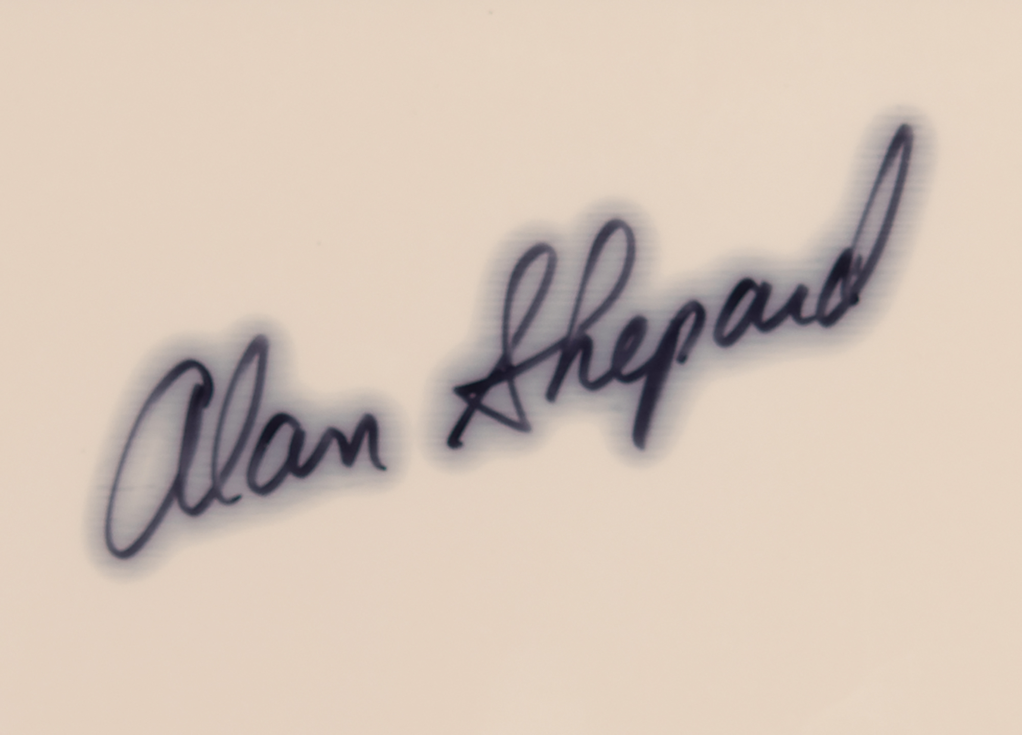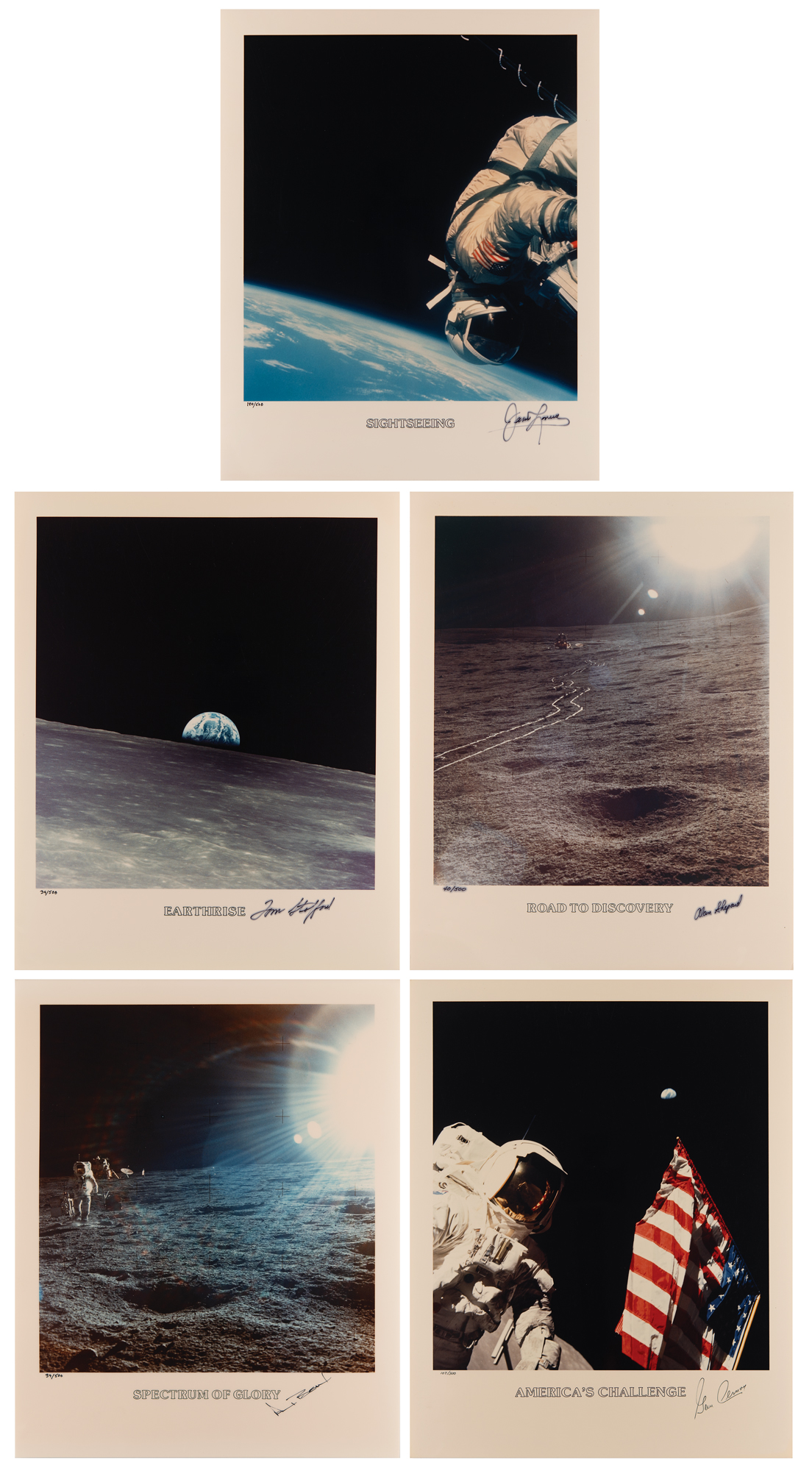 Five color 16 x 20 laminated limited edition prints of iconic images from the Gemini and Apollo programs, all numbered to 500, each signed in the lower border in black felt tip by an Apollo astronaut. Includes: Alan Bean, Gene Cernan, Tom Stafford, Alan Shepard, and James Lovell. In overall fine condition, with bleeding to the Stafford, Shepard, and Lovell signatures. Each is accompanied by a certificate of authenticity from Pacific Coast Galaxy.