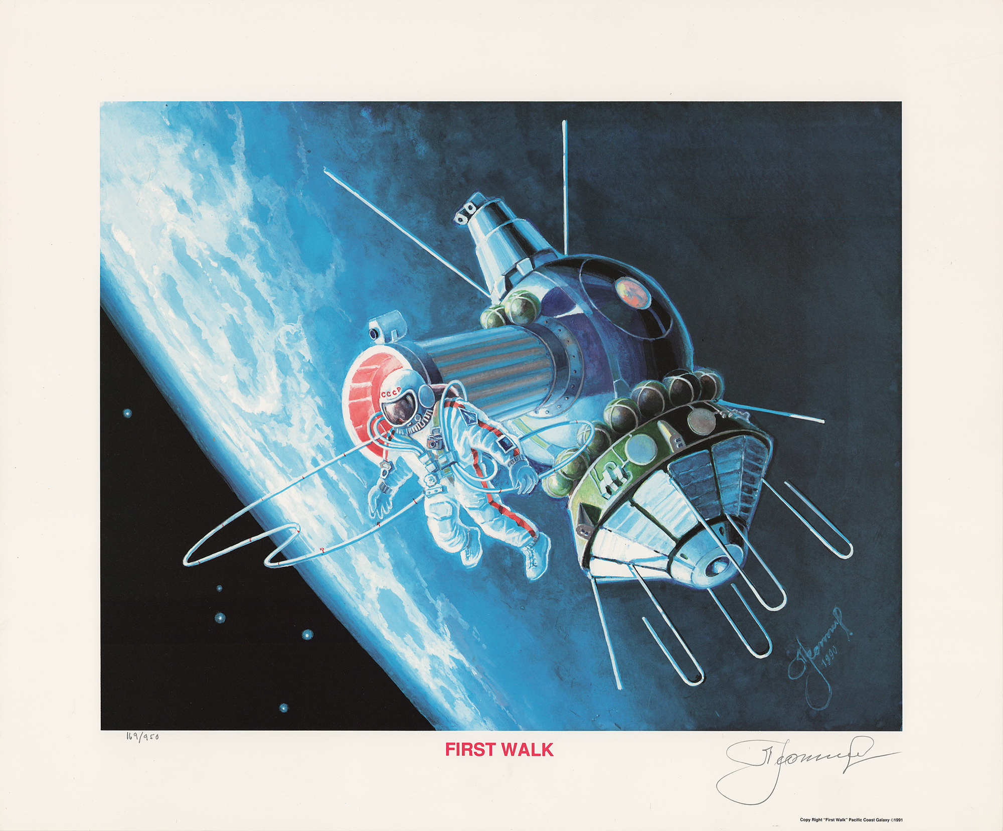 Limited edition color 20 x 16.5 print entitled 'First Walk,' featuring Leonov's own painting of his historic 12-minute spacewalk during the Voskhod 2 mission, numbered 169/950, signed in the lower border in pencil by Leonov. In fine condition. Accompanied by a certificate of authenticity from Pacific Coast Galaxy.
