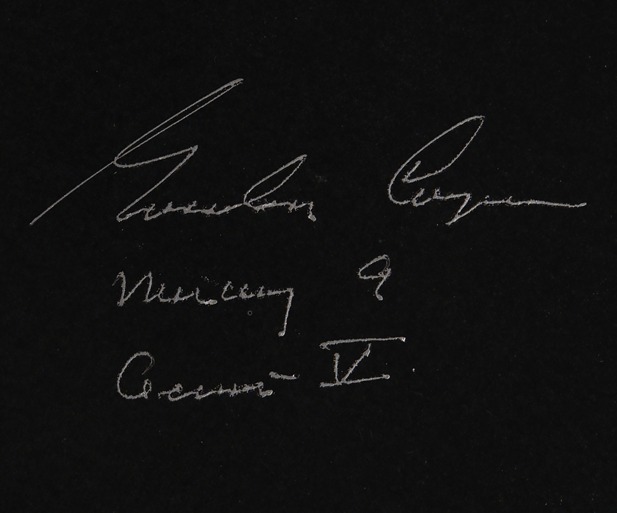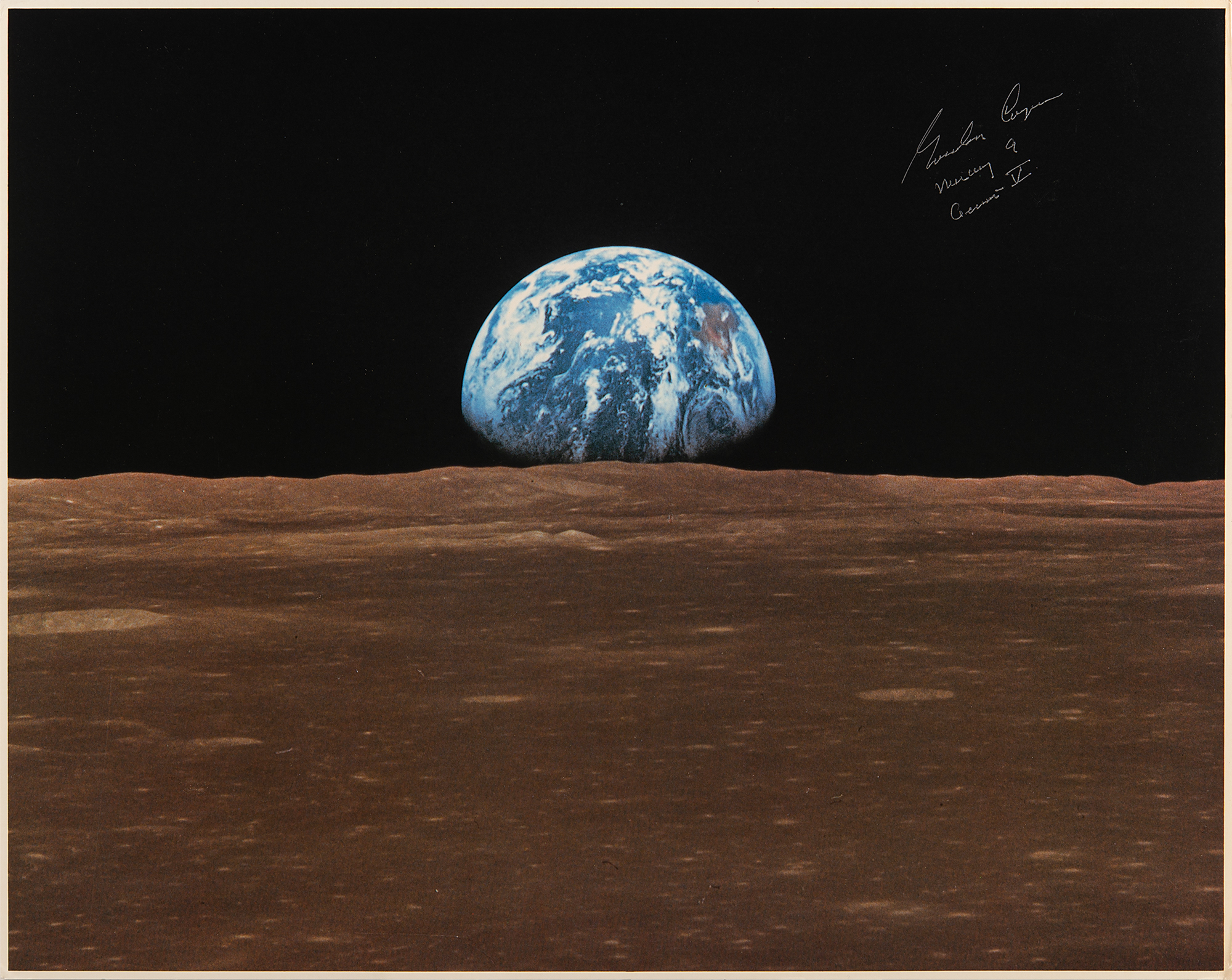 Fantastic color glossy 20 x 16 cardstock photo of an 'Earthrise' as seen from the moon, signed in silver ink, "Gordon Cooper, Mercury 9, Gemini V." Published by Kimball Concepts of Longwood, Florida, as part of 'The Space Shuttle Collection.' In fine condition.
