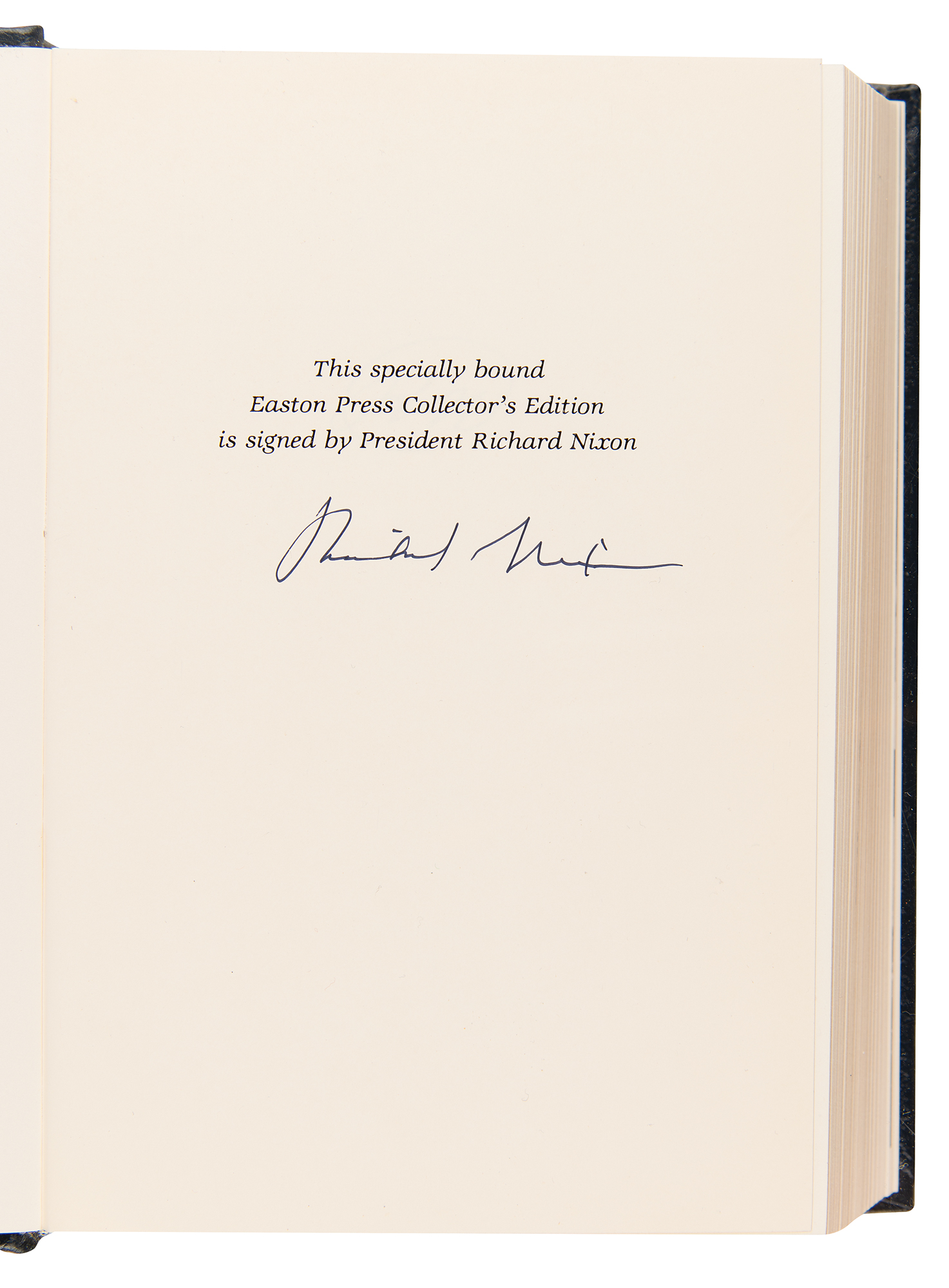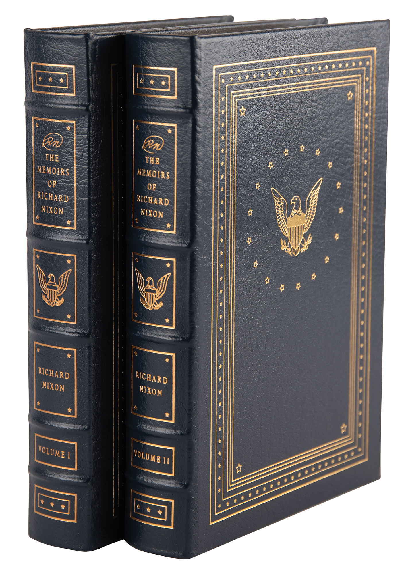 Signed book: RN: The Memoirs of Richard Nixon, Vols. I and II. Collector's edition. Norwalk, CT: Easton Press, 1988. Leatherbound hardcover in two volumes, 6.5 x 9.5, totaling 1118 pages. Signed inside the first volume on a specially printed prefatory page in ink by Richard Nixon. In very fine condition.