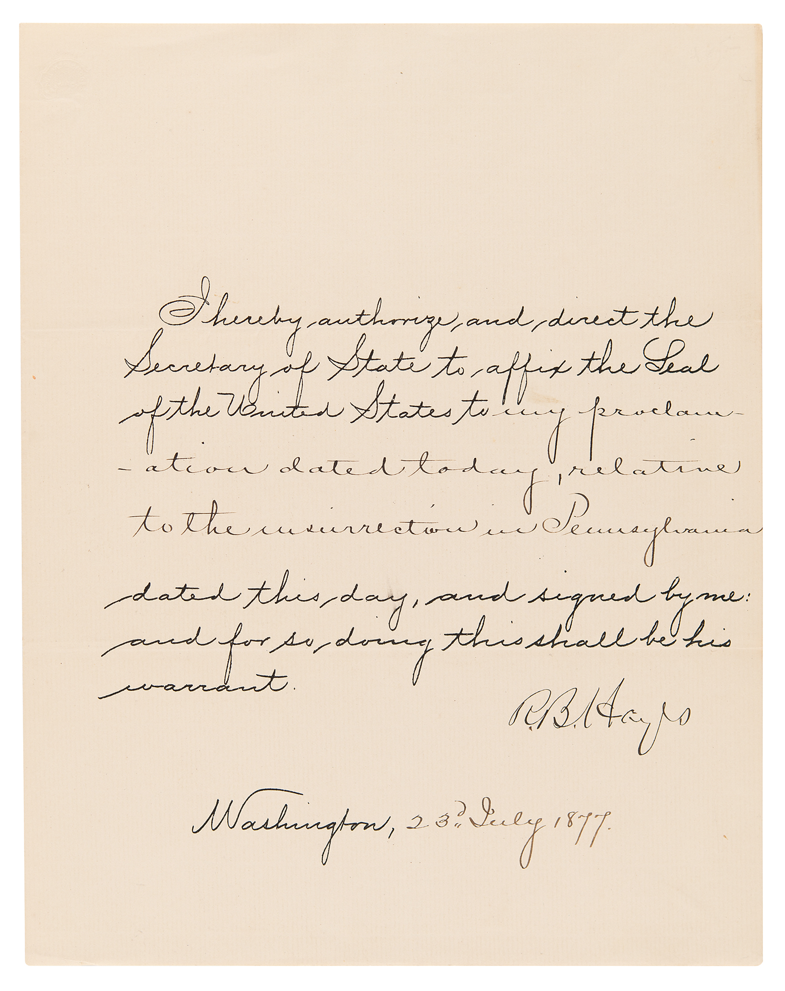 Partly-printed DS as president, signed “R. B. Hayes,” one page, 7.75 x 10, July 23, 1877. President Hayes directs the Secretary of State to affix the Seal of the United States to “my proclamation dated today, relative to the insurrection in Pennsylvania.” Signed at the conclusion by Rutherford B. Hayes. In fine condition.