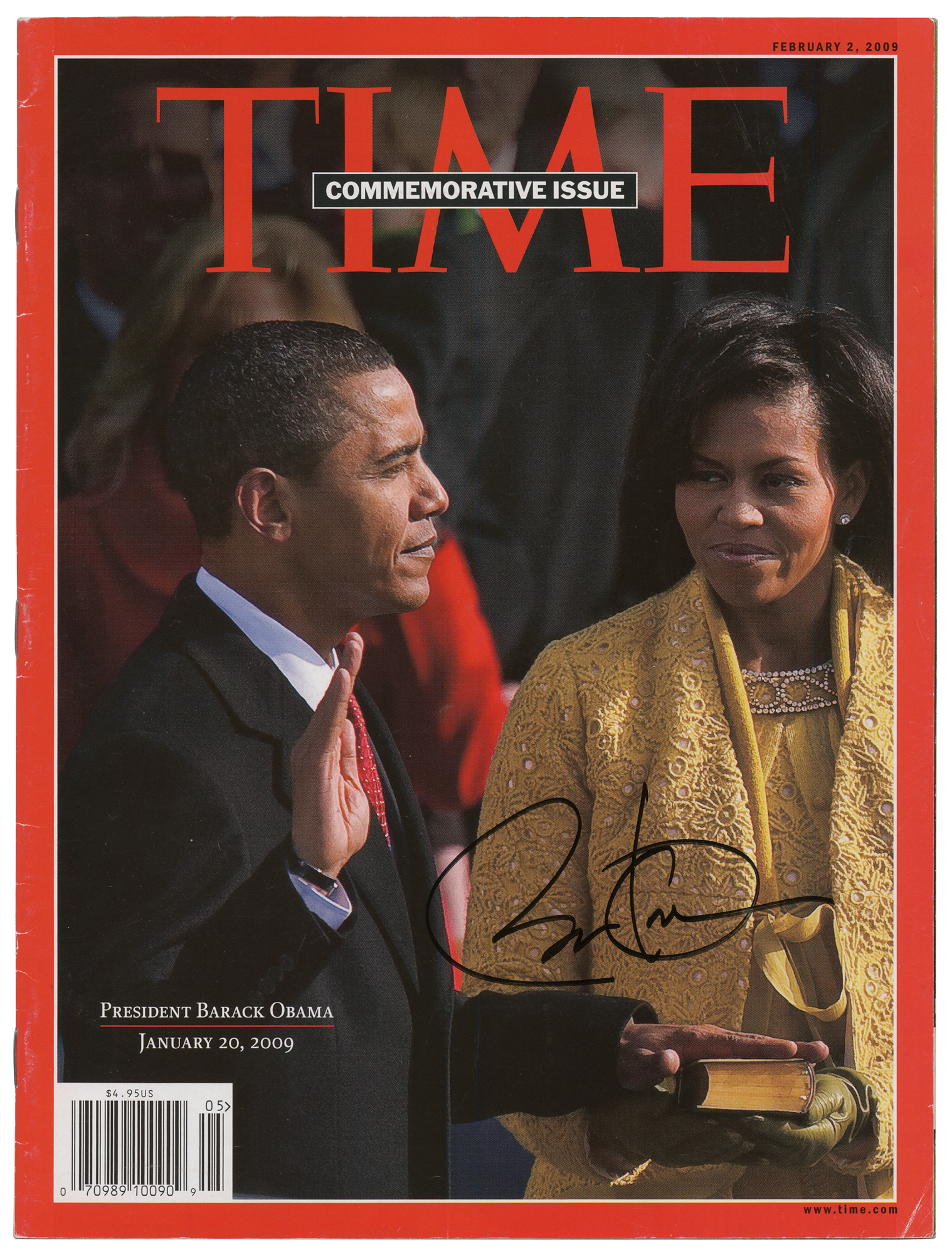 Commemorative issue of Time magazine from February 2, 2009, 80 pages, 7.75 x 10.5, with an image of Barack Obama taking the oath of office, signed on the front cover in black felt tip as president. In fine condition. Accompanied by a full letter of authenticity from JSA.