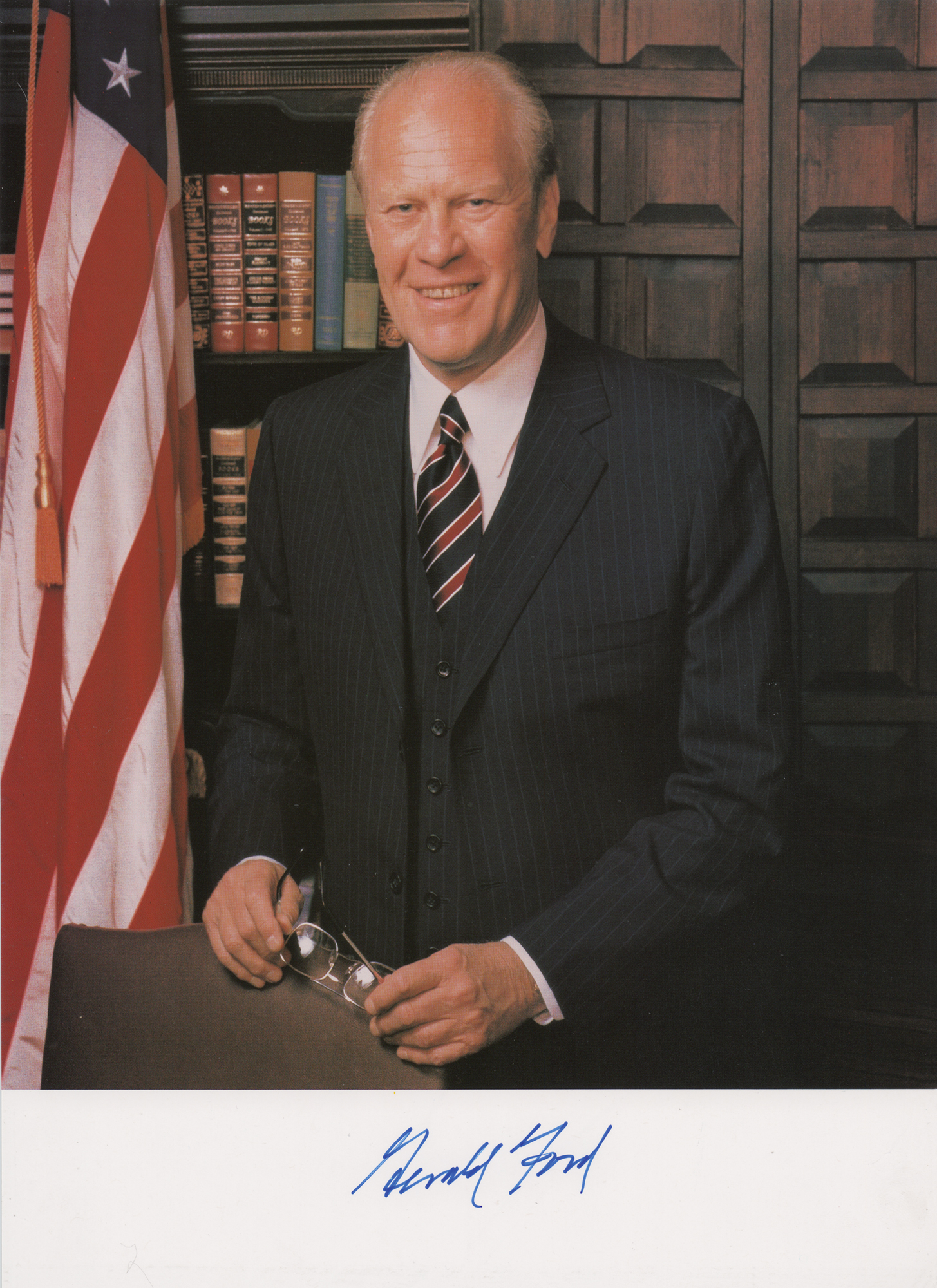 Color semi-glossy 8 x 10 cardstock photo of Gerald Ford in a library next to an American flag, signed in the lower border in blue felt tip. In fine condition, with some light bends to the upper portion.