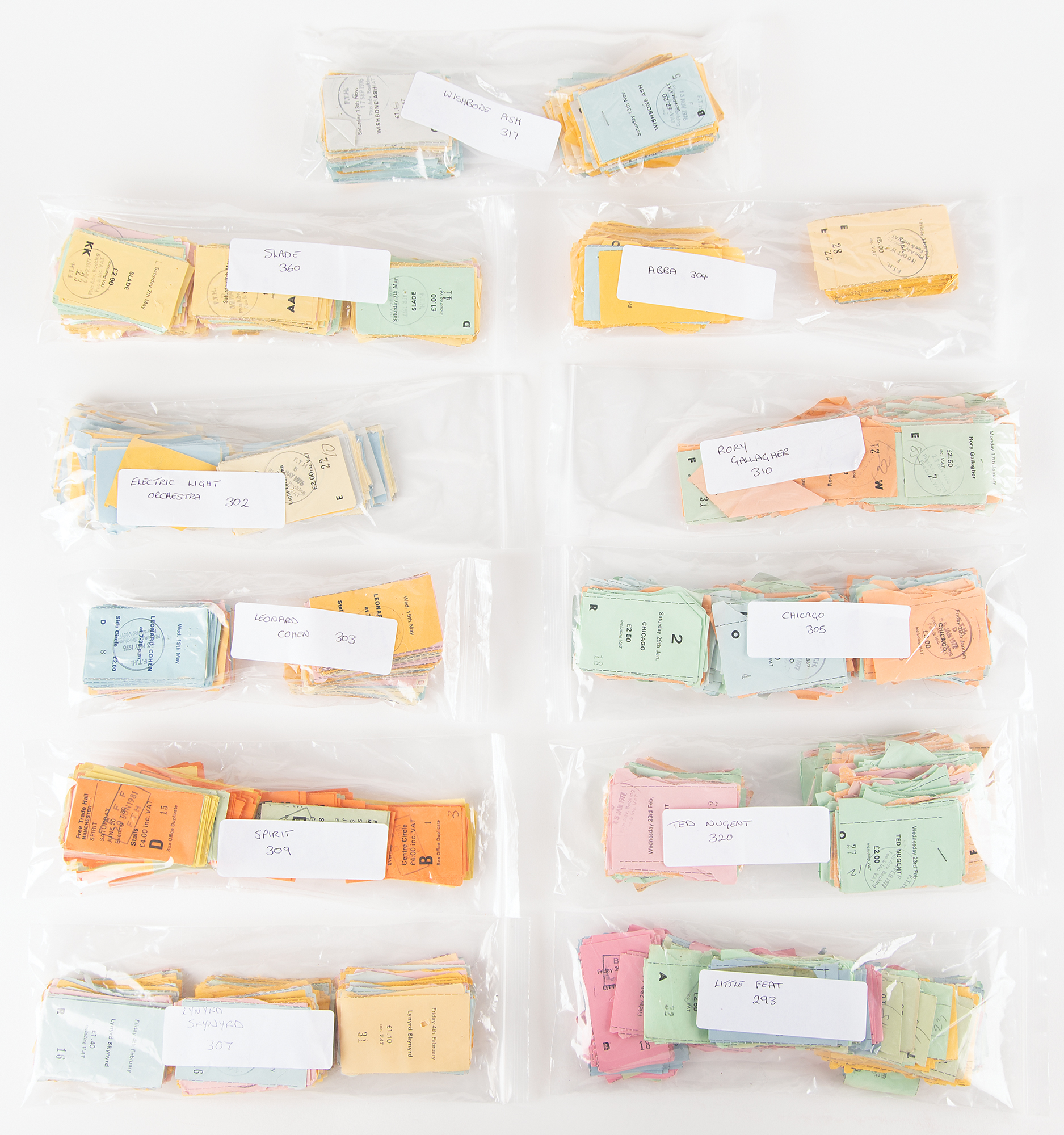 Large collection of over 3,400 colorful ticket stubs for a variety of musical acts performing at the Free Trade Hall, Manchester, England, from 1976 to 1981, with hundreds of stubs from each artist represented in the lot. Artists and counts: Lynyrd Skynyrd (307), Electric Light Orchestra (302), ABBA (304), Leonard Cohen (303), Rory Gallagher (310), Chicago (305), Spirit (309), Ted Nugent (320), Little Feat (293), Slade (360), and Wishbone Ash (317). In overall very good to fine condition.