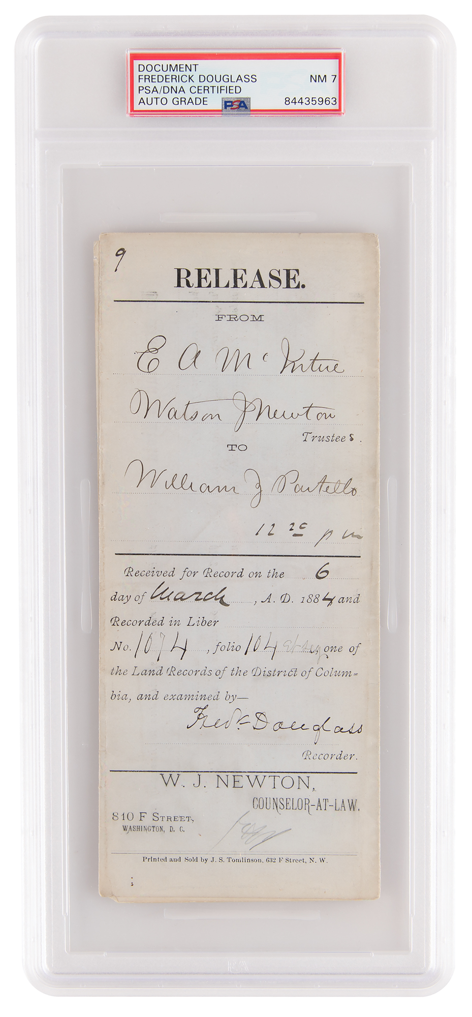 Partly-printed DS, signed “Fred'k Douglass,” 3.5 x 8.5, March 6, 1884. Release from E. A. McIntire and Watson J. Newton to William Z. Partello, signed on the docketing panel by Frederick Douglass as recorder of deeds in the District of Columbia. In fine condition. Encapsulated by PSA/DNA and graded as "NM 7."