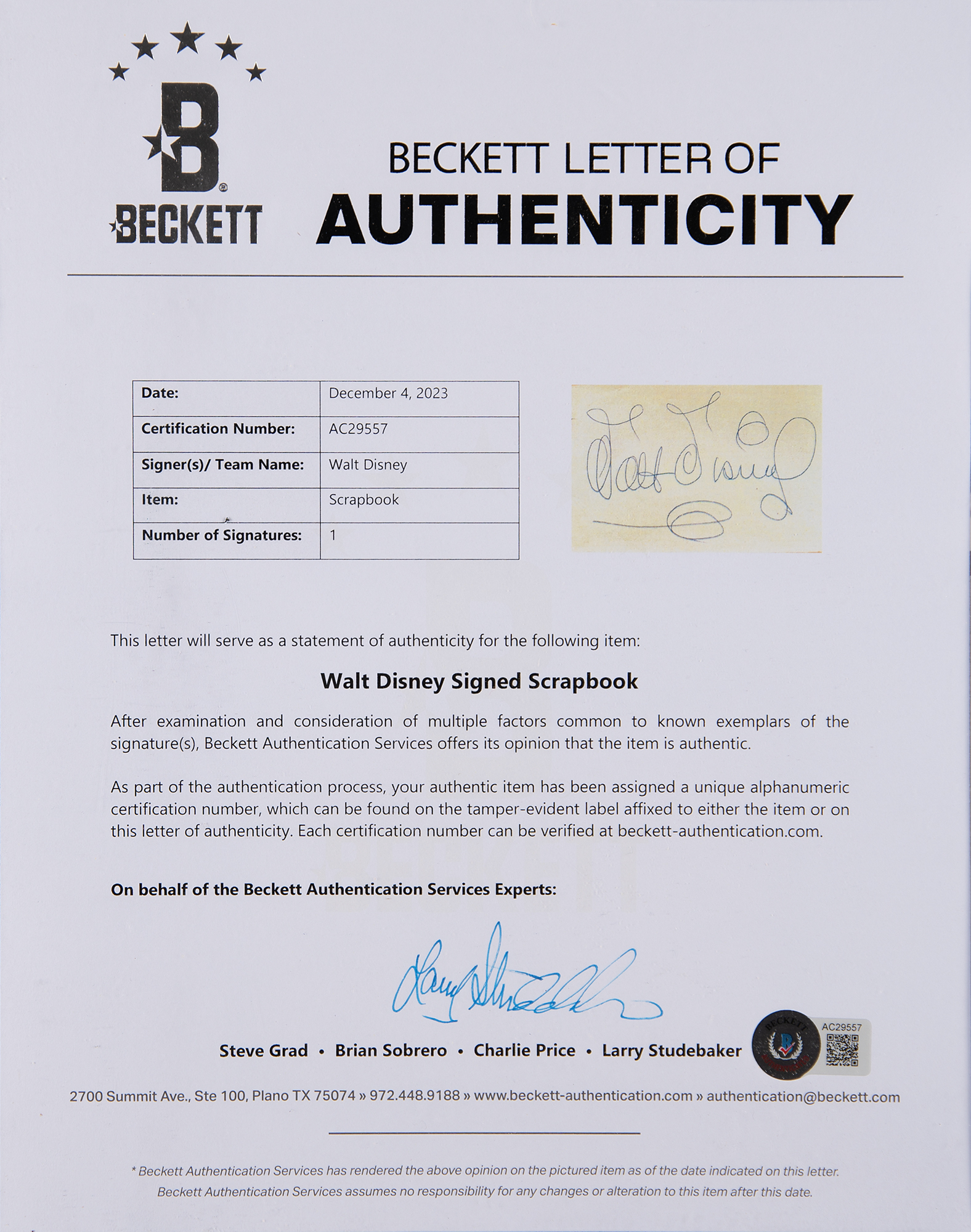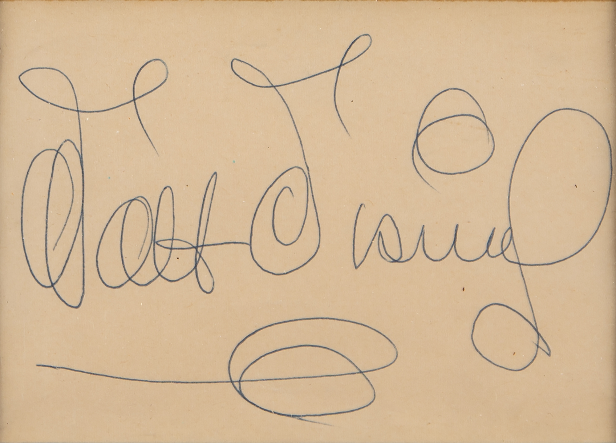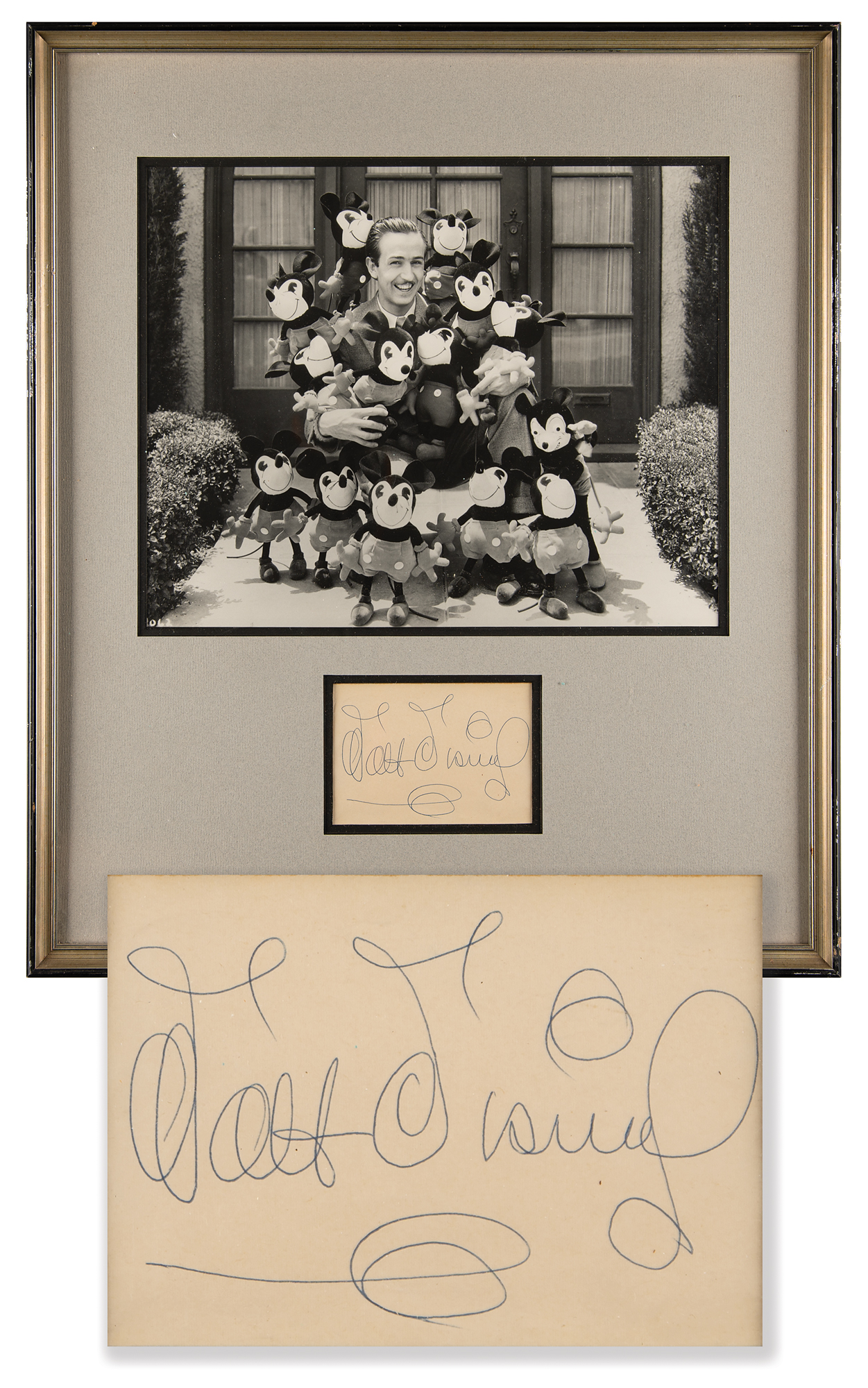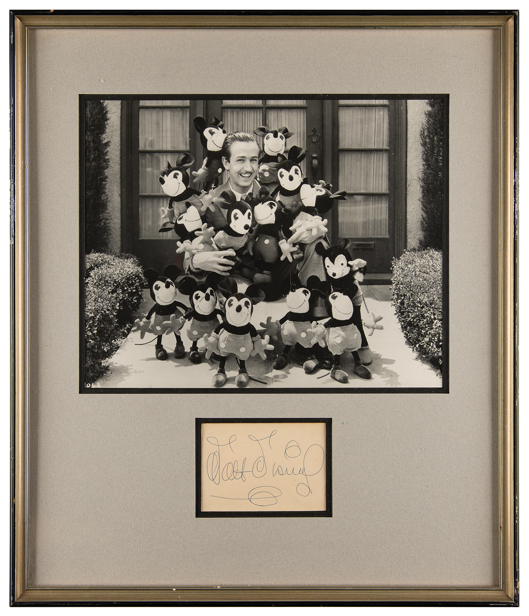 Attractive vintage ballpoint signature, “Walt Disney,” on an off-white 4.75 x 3.25 sheet. Nicely double-matted and framed with a large matte-finish photo of a young Disney posing with several Mickey Mouse dolls to an overall size of 19 x 22.25. In fine condition, with some very light creasing. Accompanied by a full letter of authenticity from Beckett Authentication Services. Realizing the great potential that Mickey Mouse could have in the character merchandise business, Walt and Roy Disney accepted an offer from imaginative businesswoman Charlotte Clark to produce the very first Mickey Mouse plush dolls—the original set pictured here cuddled up with Walt circa 1932.