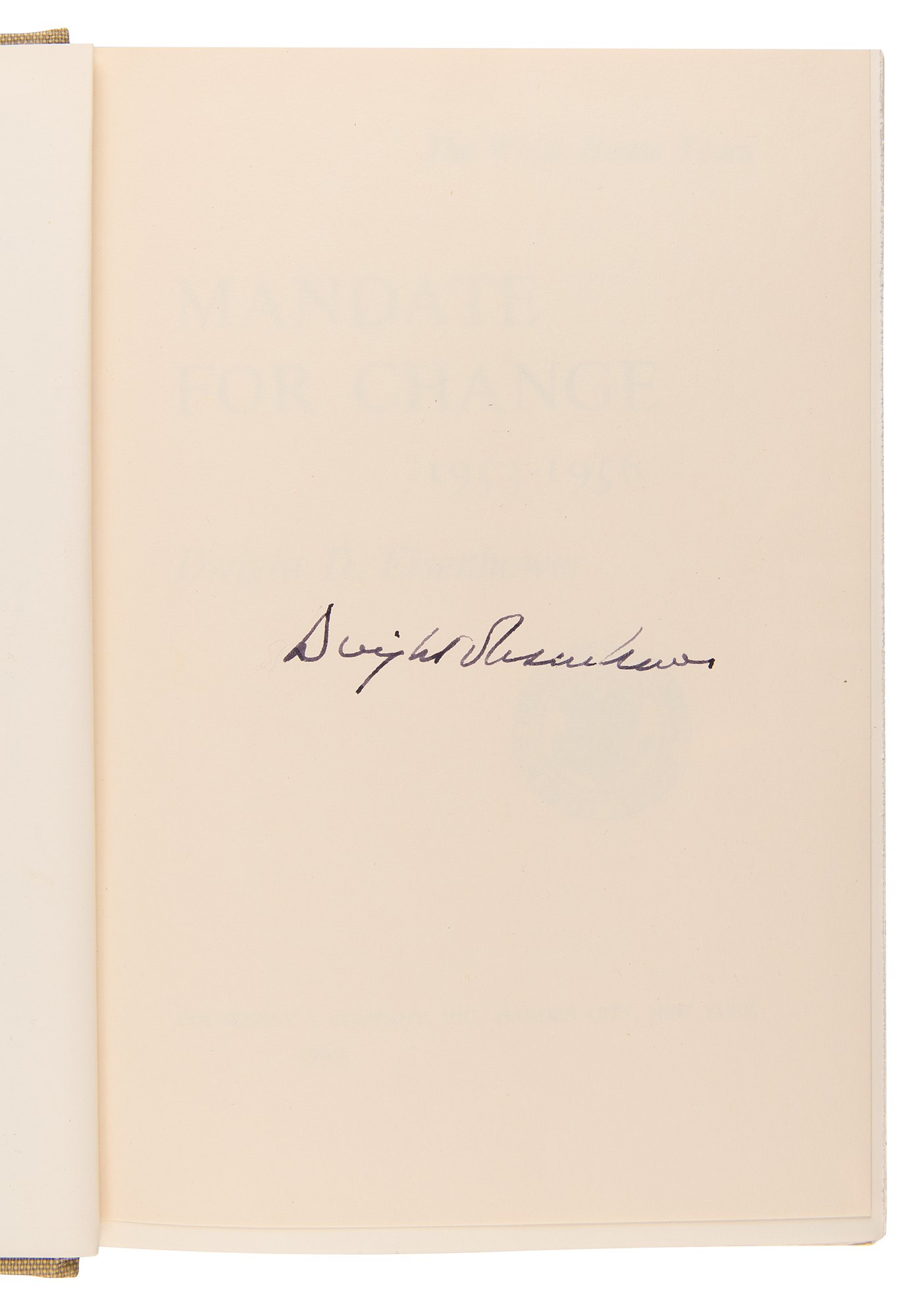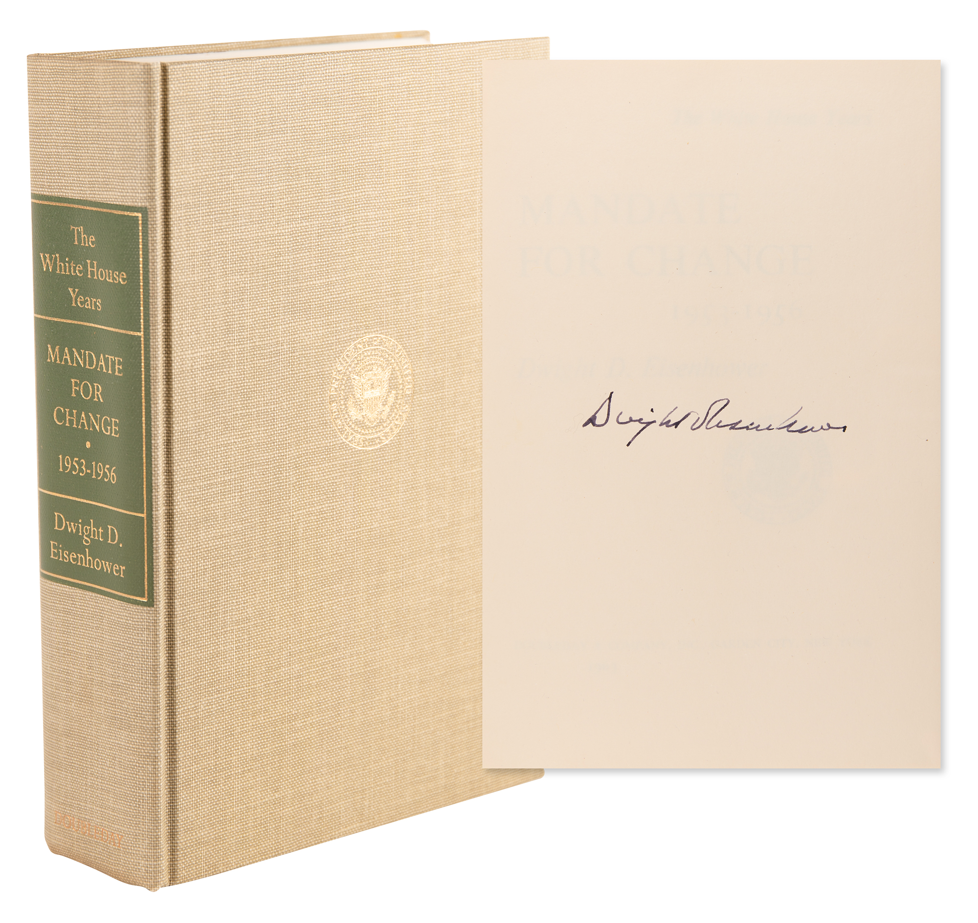Signed book: The White House Years: Mandate for Change, 1953-1956. First edition, limited issue, numbered 122/1500. NY: Doubleday, 1963. Hardcover with slipcase, 6.5 x 9.75, 650 pages. Boldly signed opposite the colophon in fountain pen, "Dwight D. Eisenhower." In fine condition, with light wear and toning only to the slipcase.