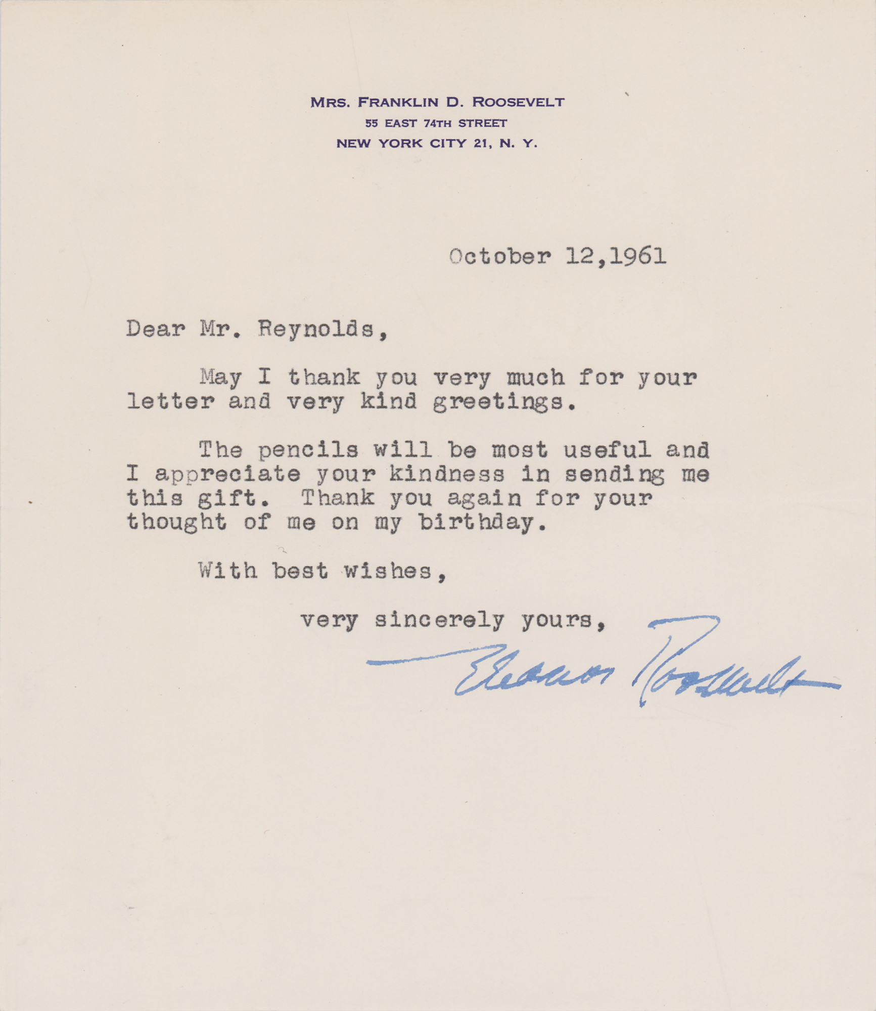 TLS, one page, 6 x 7, personal letterhead, October 12, 1961. Letter to Max Reynolds, in full: "May I thank you very much for your letter and very kind greetings. The pencils will be most useful and I appreciate your kindness in sending me this gift. Thank you again for your thought of me on my birthday." In very fine condition.