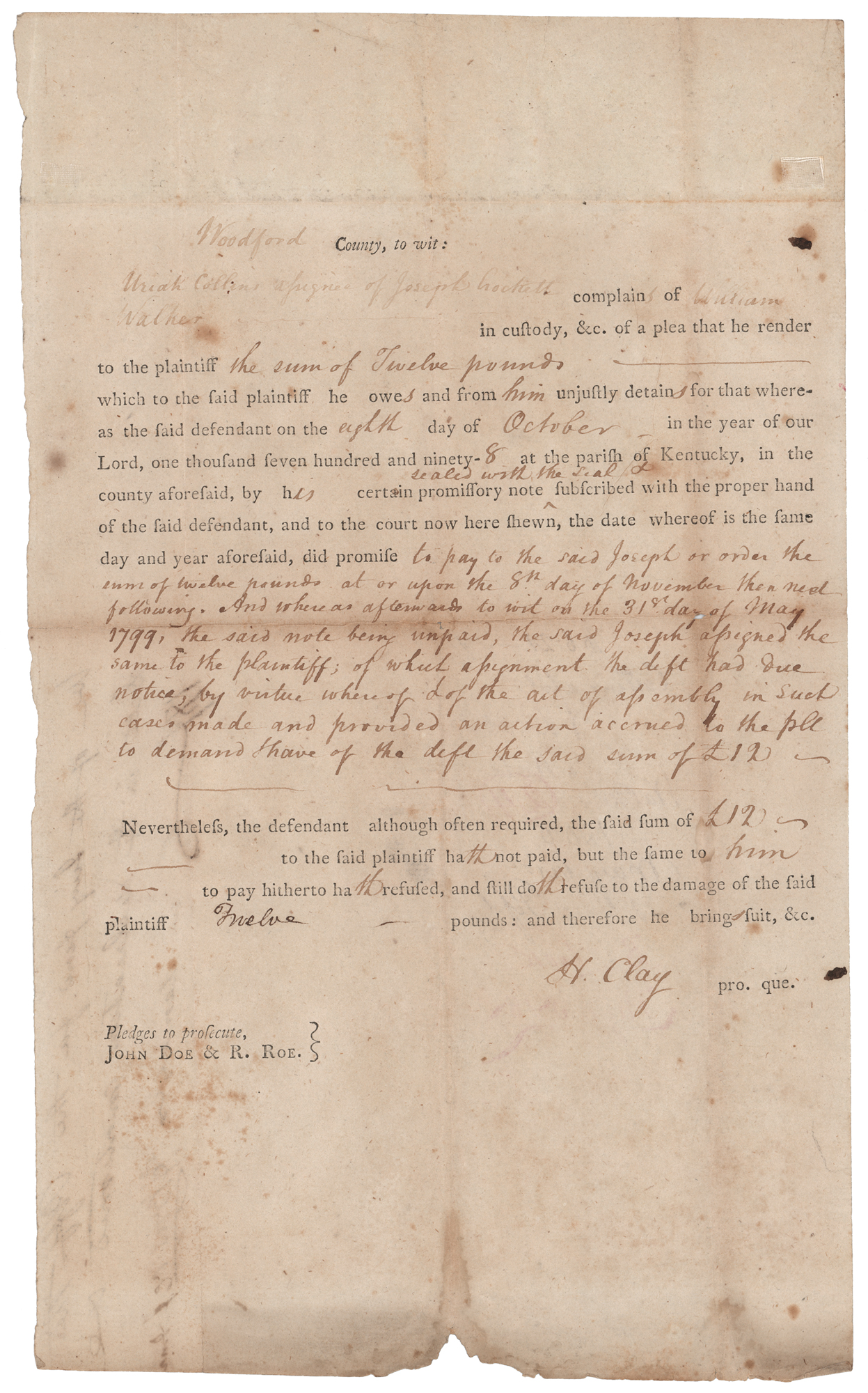 Early partly-printed DS, signed “H. Clay,” one page, 7.75 x 12.75, May 1800. Court document from Woodford County, Kentucky, which has been filled out entirely in the hand of Henry Clay, then only 23 years of age and at the very nascency of his legal career. The document reads, in part: “Uriah Collins assignee of Joseph Crockett complains of William Walker in custody, &c. of a plea that he render to the plaintiff the sum of Twelve pounds which to the said plaintiff he owes and from him unjustly detains.” Signed neatly at the conclusion by Clay. In very good to fine condition, with scattered light foxing and toning. An impressively early document from the emerging legislator and soon-to-be statesman. After apprenticing himself to Kentucky attorneys such as George Nicholas, John Breckenridge, and James Brown, Clay established his own law practice, frequently working on debt collections and land disputes. Clay soon established a reputation for strong legal ability and courtroom oratory.