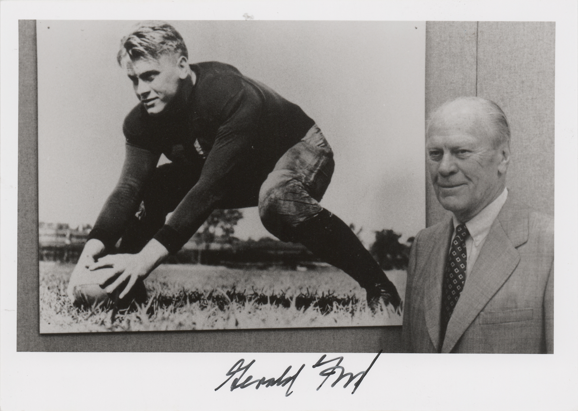 Satin-finish 7 x 5 photo of Gerald Ford posing next to a picture of himself as a member of the University of Michigan football team, signed in the lower border in black felt tip. In very fine condition. Ford played center and linebacker while at Michigan as the star player in Michigan's undefeated 1932 and 1933 seasons, during both of which the team won national titles.