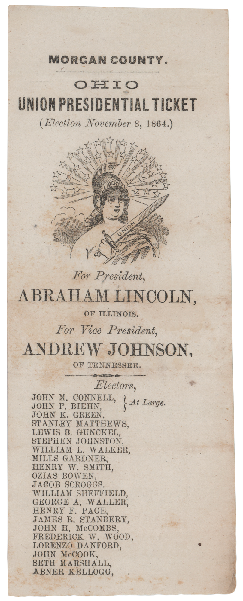 Union Presidential Ticket for the November 8, 1864, election in Morgan County, Ohio, 3 x 7.5, featuring the text, "For President, Abraham Lincoln of Illinois, For Vice President, Andrew Johnson of Tennessee," and an allegorical image representing 'Liberty' and the 'Union.' Below is a list of Ohio's 21 electors. In fine condition, with scattered light toning.