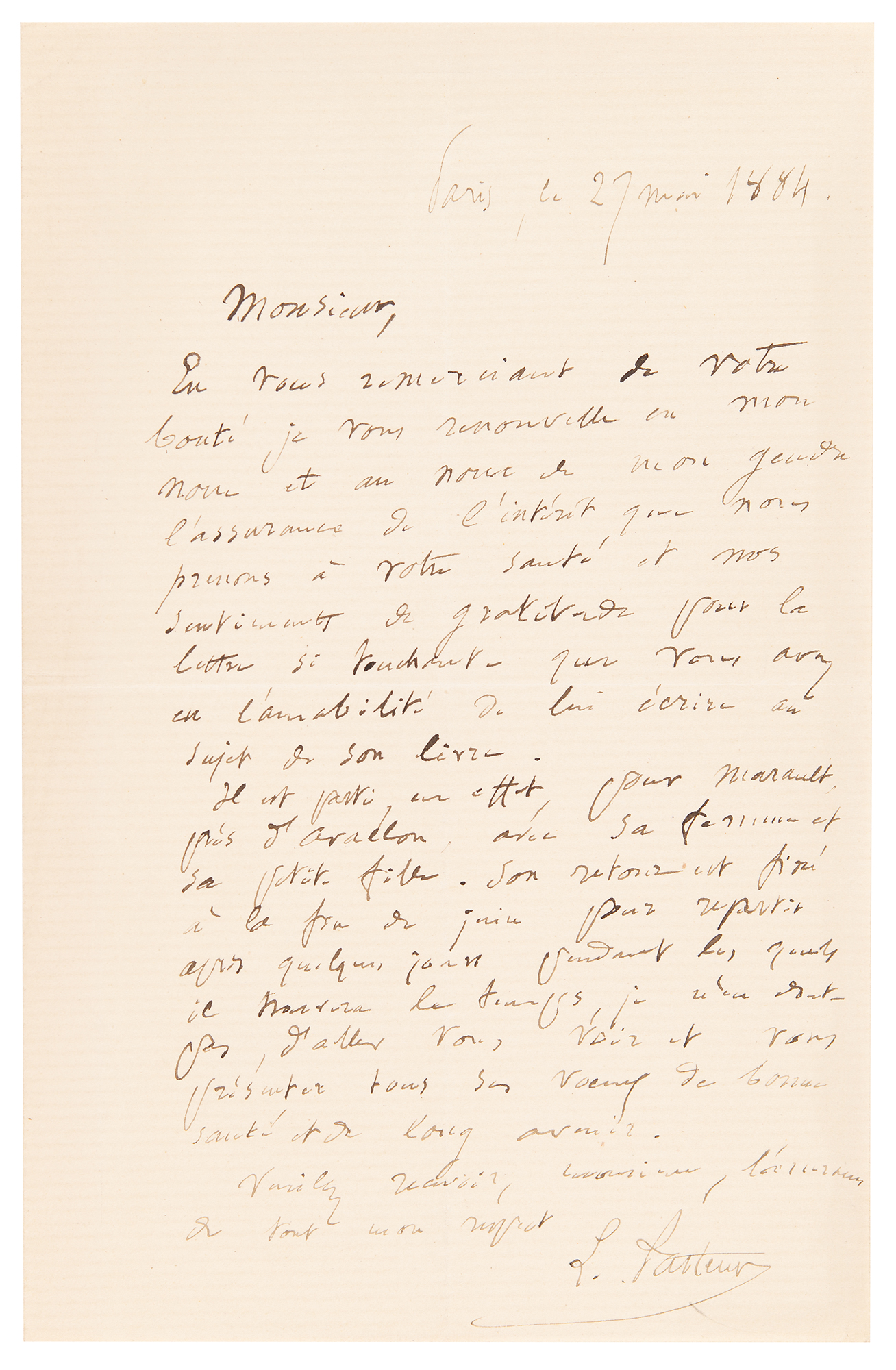 ALS in French, signed "L. Pasteur," one page, 5.25 x 8, May 27, 1884. Handwritten letter to a gentleman, in part (translated): "Thank you for your kindness on my behalf and on behalf of my son the assurance of interest…and feelings of gratitude for the touching letter that you had the amiability to write him about his book. He is gone, indeed, for Marault, near Avallon, with his wife and daughter. He returns at the end of June to leave after a few days during which he will find the time, I doubt not, to come to you and present you his best wishes for good health and a long future." In fine condition. In 1883, Pasteur's son-in-law, Rene Vallery-Radot, published the first biography of Pasteur, who, at this time, had just started his studies on rabies and was gathering dogs as laboratory specimens. Just one year later, Pasteur successfully inoculated the first human against rabies.