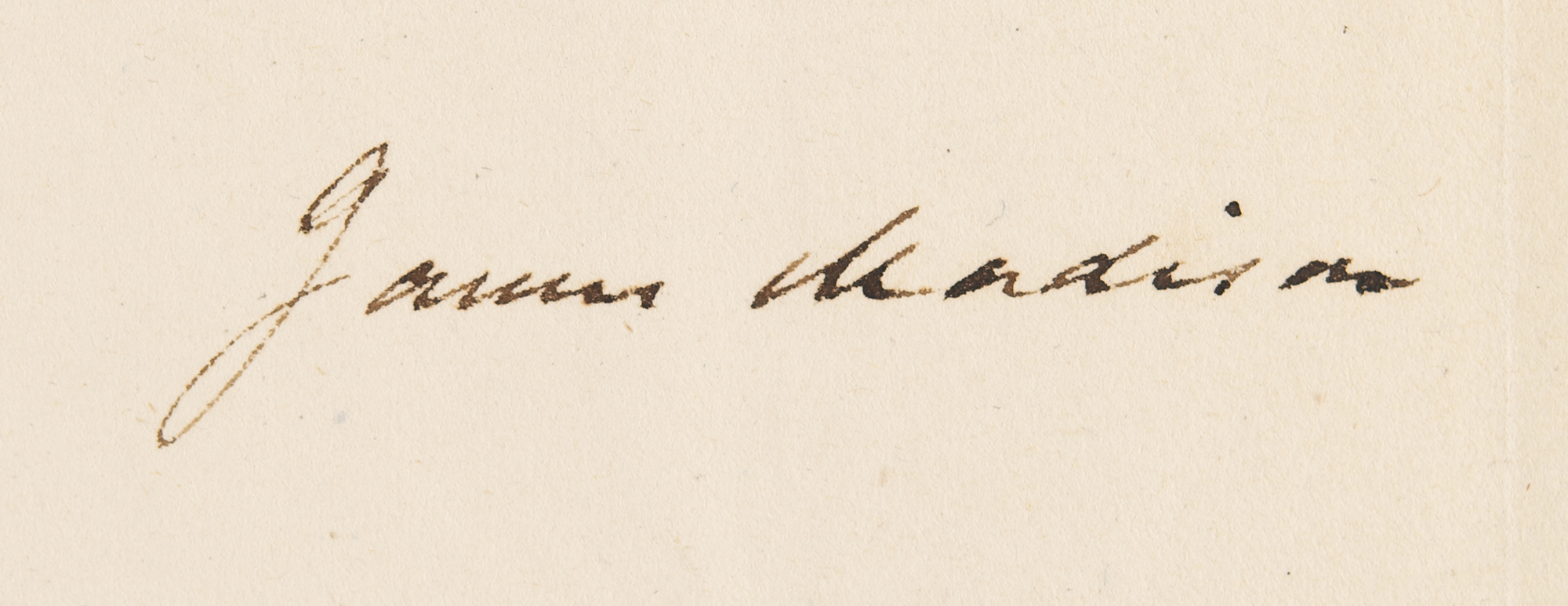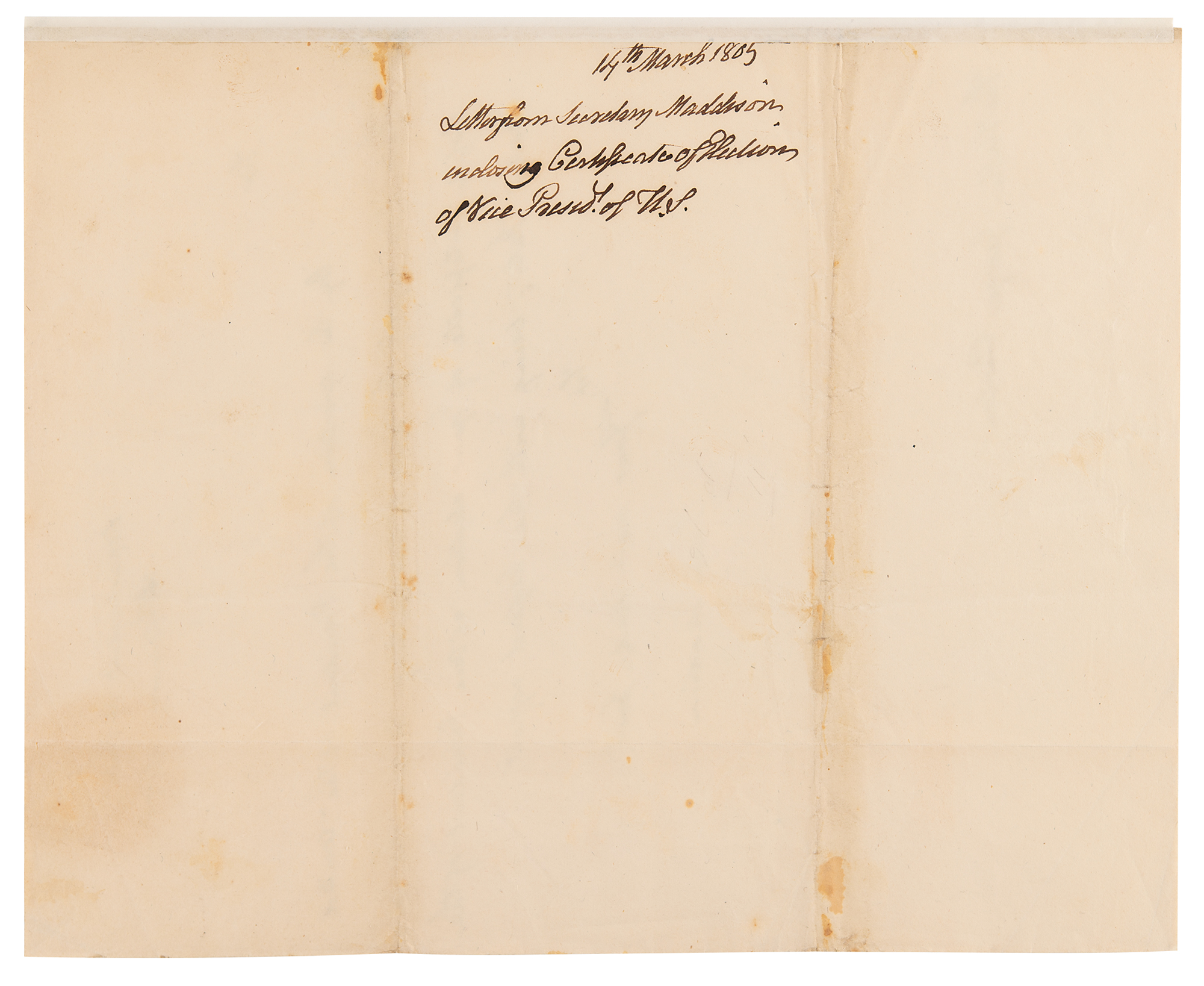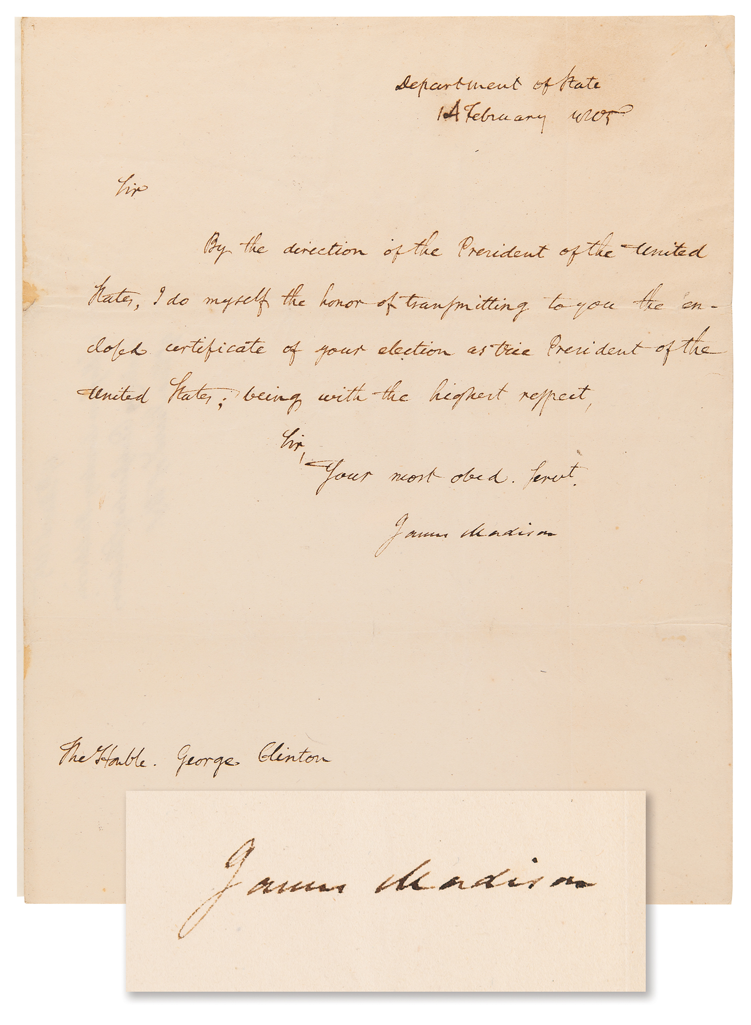 ALS as Secretary of State, signed "James Madison," one page, 8 x 10, February 14, 1805. Letter to the Hon. George Clinton, in full: "By the direction of the President of the United States, I do my self the honor of transmitting to you the certificate of your election as Vice President of the United States." Docketed on the reverse in Clinton's hand: "14th March 1805, Letter from Secretary Maddison enclosing Certificate of Election of Vice Presid't of U.S." In fine condition.