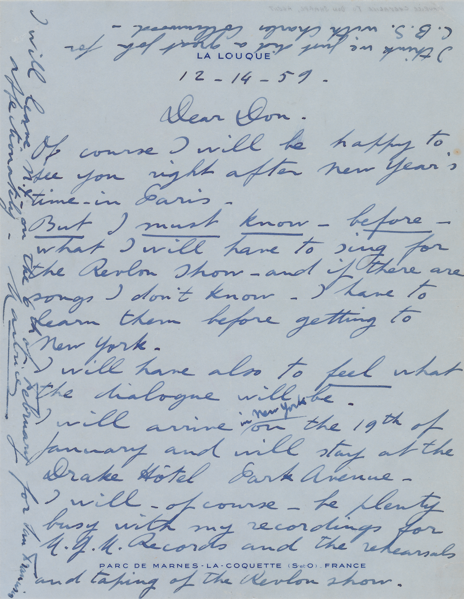 ALS signed “Maurice,” one page, 8.25 x 10.5, La Louque letterhead, December 14, 1959. Handwritten letter to producer Don Sharpe, in full: “Of course I will be happy to see you right after New Year’s time—in Paris. But I must know—before—what I will have to sing for the Revlon show—and if there are songs I don’t know—I have to learn them before getting to New York. I will have also to feel what the dialogue will be. I will arrive in New York on the 19th of January and will stay at the Drake Hotel Park Avenue. I will—of course—be plenty busy with my recordings for M.G.M. Records and the rehearsals and taping of the Revlon show. I will leave N.Y. on the 6th of February for San Francisco.” Chevalier adds a postscript at the top of the page: “I think we just did a great job for C.B.S. with Charles Collinwood [sic].” In fine condition.