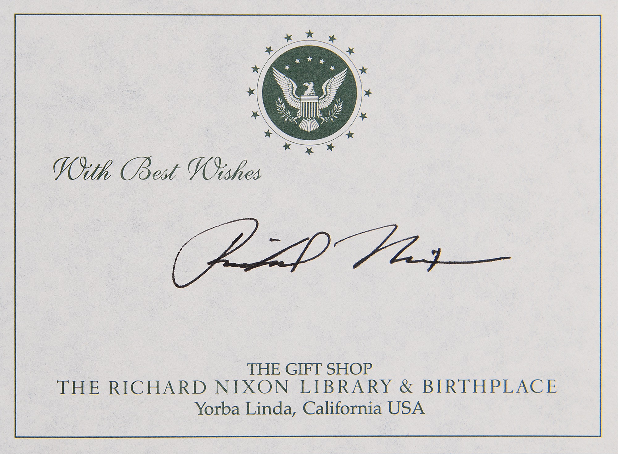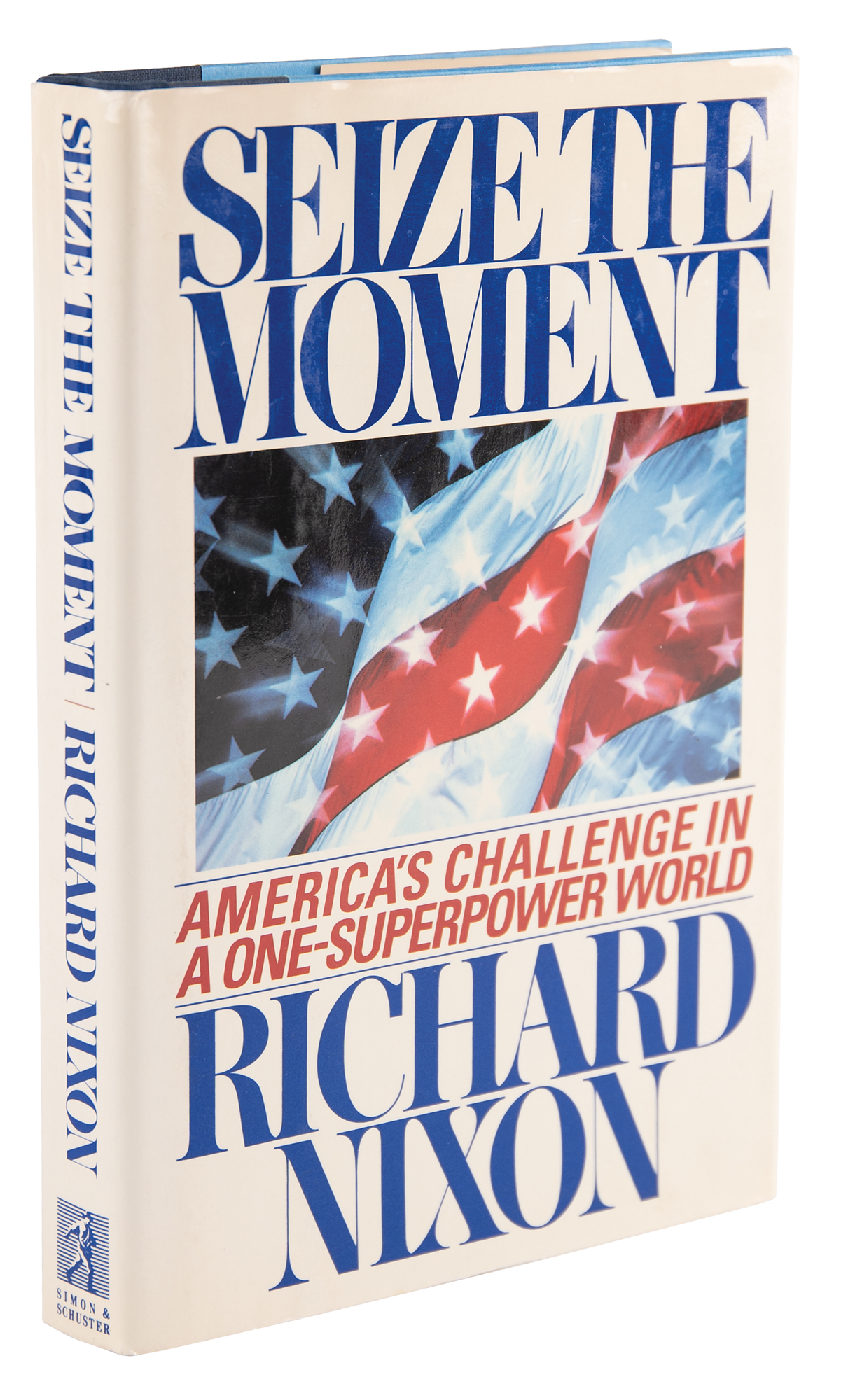 Signed book: Seize the Moment. Later printing. NY: Simon & Schuster, 1992. Hardcover, 6.5 x 9.5, 322 pages. Signed in black felt tip by Richard Nixon on a Nixon Library & Birthplace bookplate affixed to the first free end page. In fine condition.