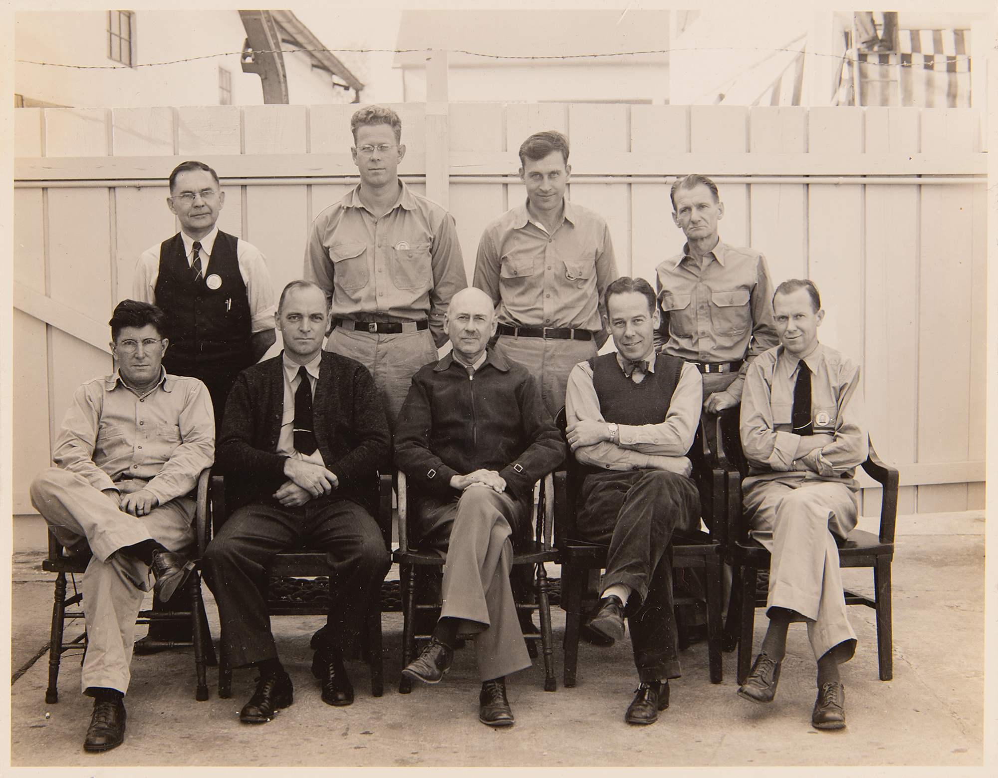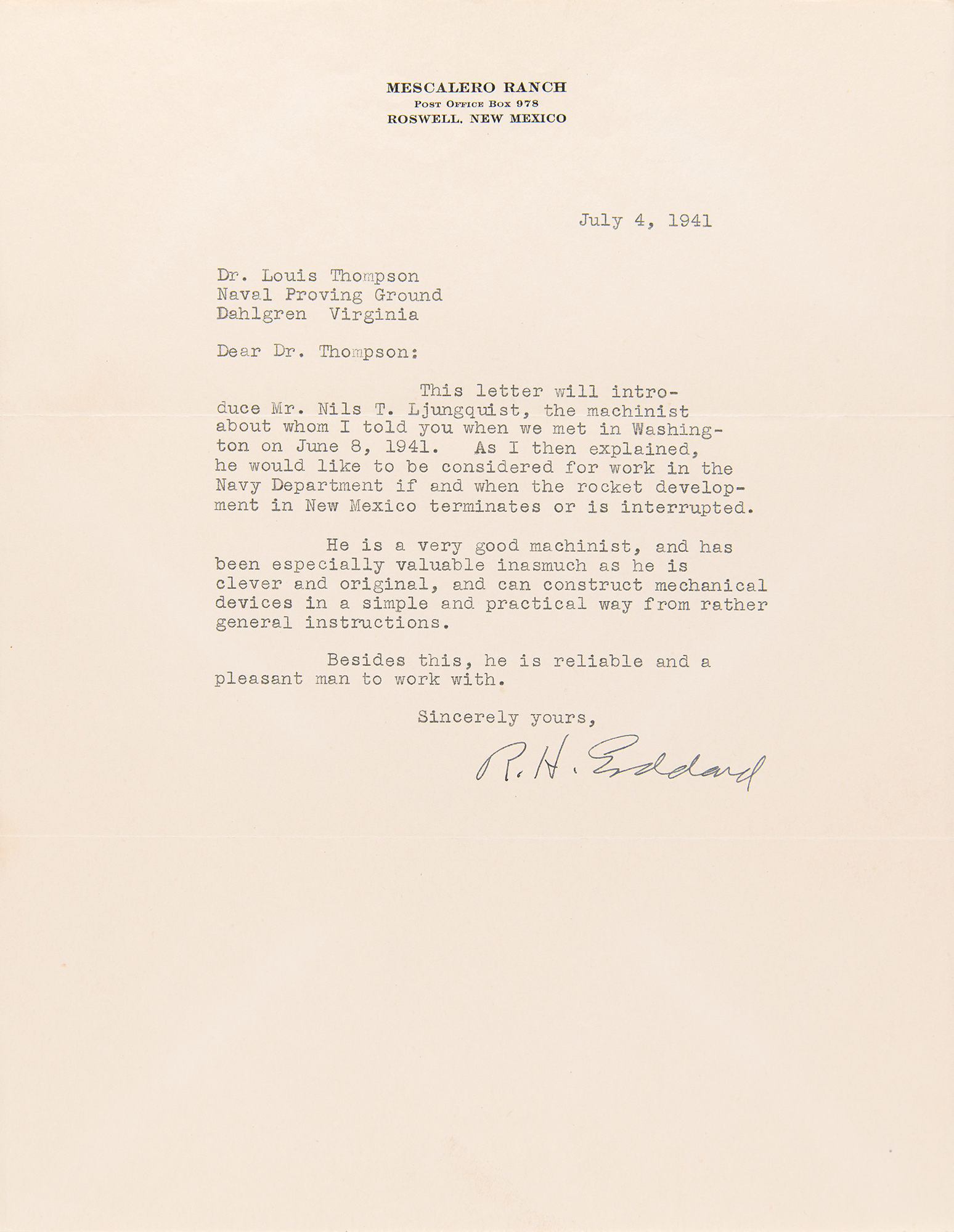 World War II-dated TLS signed “R. H. Goddard,” one page, 8.5 x 11, Mescalero Ranch (Roswell, New Mexico) letterhead, July 4, 1941. Letter of recommendation sent to Goddard’s old Clark University associate, Dr. Louis Thompson, in full: “This letter will introduce Mr. Nils T. Ljungquist, the machinist about whom I told you when we met in Washington on June 8, 1941. As I then explained, he would like to be considered for work in the Navy Department if and when the rocket development in New Mexico terminates or is interrupted. He is a very good machinist, and has been especially valuable inasmuch as he is clever and original, and can construct mechanical devices in a simple and practical way from rather general instructions. Besides this, he is reliable and a pleasant man to work with.” In fine condition. Accompanied by its original transmittal envelope, typed “Mr. Ljungquist” and presumably signed by the subject of the letter, “Nils T. Ljungquist Sr.” and a wonderful vintage glossy 9.5 x 7.5 group photo of nine rocket scientists and machinists posing together outdoors, with Goddard pictured front and center, and Ljungquist seated to his right.