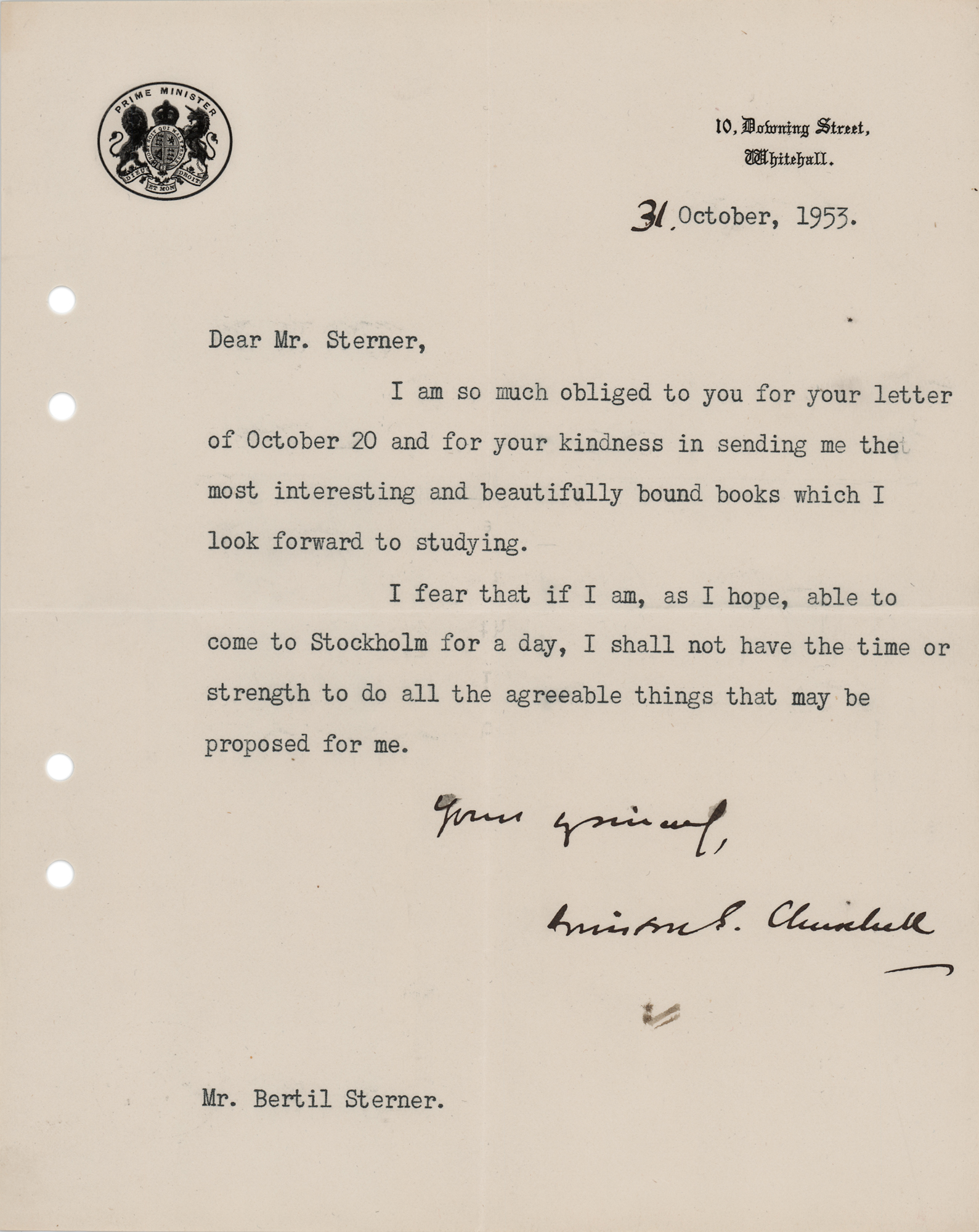 TLS signed “Yours sincerely, Winston S. Churchill,” one page, 7.5 x 9.5, 10 Downing Street (Prime Minister) letterhead, October 31, 1953. Letter to Swedish publisher Bertil Sterner, in full: “I am so much obliged to you for your letter of October 20 and for your kindness in sending me the most interesting and beautifully bound books which I look forward to studying. I fear that if I am, as I hope, able to come to Stockholm for a day, I shall not have the time or strength to do all the agreeable things that may be proposed for me.” Churchill emends the date in his own hand. In fine condition, with file holes to the left edge, and trivial brushing to the sentiment. Sterner was the head of Messrs Skoglund Bokforlag, Churchill's Swedish publishers.