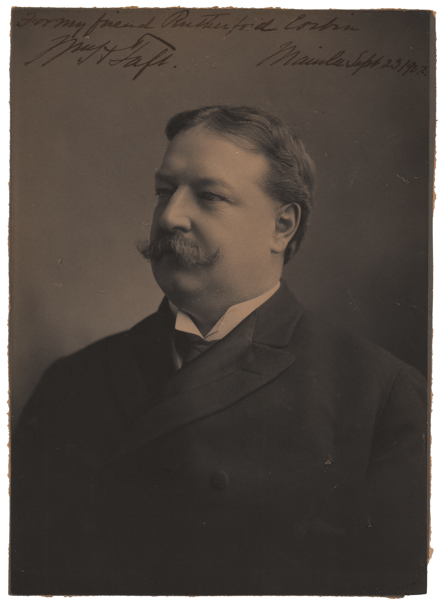 Appealing matte-finish 5.5 x 7.75 portrait photo of William H. Taft, signed and inscribed in fountain pen, “For my friend Rutherford Corbin, Wm. H. Taft, Manila Sept., 23, 1902.” Affixed to a same-size cardstock mount and in fine condition, with closely trimmed edges, and a few tiny surface gouges. An uncommon portrait of Taft signed during his three-year tenure as Governor-General of the Philippines, which lasted from March 16, 1900, until December 23, 1903, when he returned to America to assume his position as Secretary of War under the leadership of President Theodore Roosevelt.