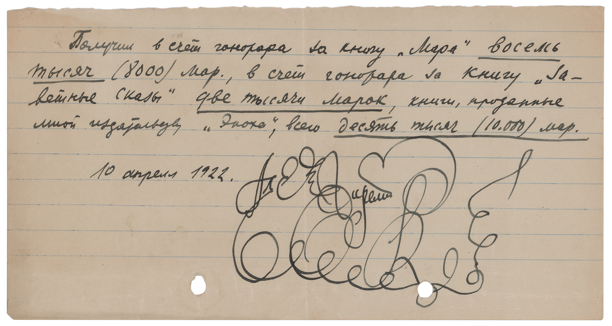 Russian modernist writer (1877–1957) whose creative imagination veered to the fantastic and bizarre; aside from his literary pursuits, Remizov was an expert calligrapher who sought to revive this visual art in Russia. ADS by Aleksey Remizov, one page, 8.25 x 4.25, April 10, 1922. Untranslated handwritten document recording the royalties received for three different books, floridly signed at the conclusion by Remizov. In fine condition, with two file holes at the bottom.